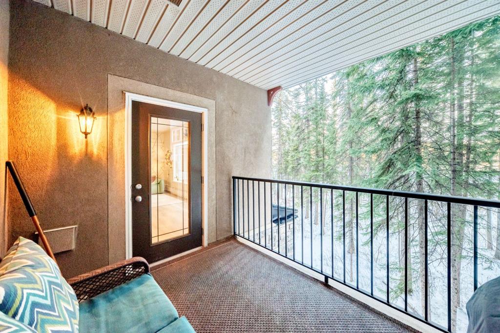 An executive tree house in the city – like living in Banff! A rare find – this spacious 865 sq ft one bedroom plus den in a concrete building is perfect for the outdoor enthusiast who loves to hike through the tranquil Griffith Woods (93 hectare nature park) along the Elbow River. Lovely updates – recessed lighting, white kitchen, granite countertops, stone fireplace with large mantle, covered balcony with a gas hook up for the BBQ. The Wedgewoods Fitness Centre is right across the hall. Private. Close to the mountains, amenities and 15 minutes to downtown. Well run complex.