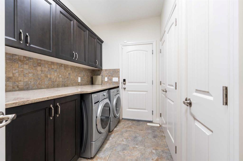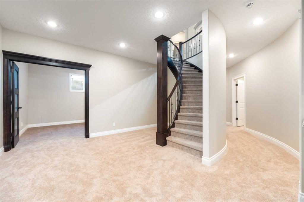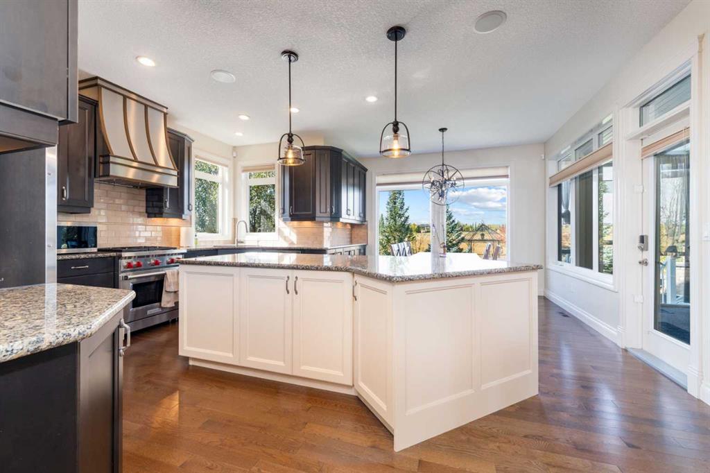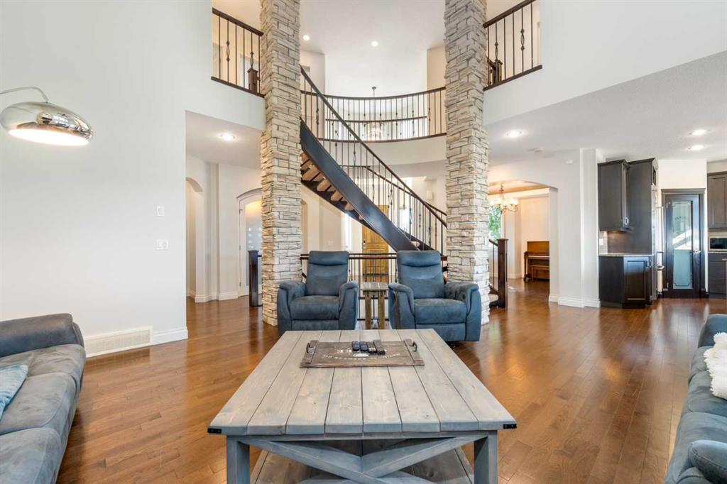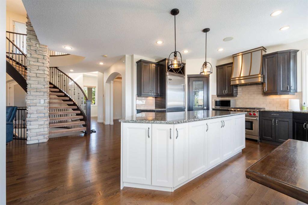 Looking for a home that has the “wow” factor the moment you step inside? This former show home in Okotoks’ highly desirable Air Ranch community delivers exactly that—and so much more. With 5 bedrooms, 3.5 bathrooms, and nearly every upgrade you could ask for, this property backs directly onto greenspace, offering a unique setting you won’t find anywhere else. It’s a rare combination of refined design and everyday comfort, all wrapped up in one incredible package. From the moment you walk in, the grand foyer makes an impression with 18’ ceilings, a sweeping spiral staircase, and natural light that fills the main floor. The layout is built for both entertaining and family living. The kitchen is every chef’s dream—featuring a Wolf gas range, Viking fridge, custom Hammersmith hood fan, and a convenient water filtration/softener system. Rich cabinetry runs floor-to-ceiling, paired with granite counters, a large island, and a walk-in pantry to keep everything organized. Throughout the main level, you’ll notice thoughtful details that set this home apart. A built-in audio system lets you enjoy music in every room. The office, tucked behind distinctive arched French doors, provides a quiet space for work or study. Even the laundry room has been elevated with granite counters to match the home’s cohesive, upscale feel. Upstairs, three generously sized bedrooms and two full bathrooms provide plenty of space for family and guests. The primary suite is the highlight—a true retreat with room for a king-sized bed and private seating area. The 5-piece ensuite feels like a spa with a granite double vanity, corner soaker tub, walk-in tiled shower, and expansive walk-in closet. The fully finished lower level is where this home really shines. With two additional bedrooms, a 3-piece bath featuring a steam shower, and a large family room complete with a cozy gas fireplace and built-in entertainment centre, there’s space for everyone. A granite-topped wet bar with sink, wine fridge, and microwave makes it easy to entertain or kick back for movie nights. You’ll also find a large finished storage area to keep everything neatly tucked away. Car enthusiasts or families with multiple vehicles will appreciate the massive heated garage, designed with both function and space in mind. Outdoors, the lifestyle continues with a screened-in covered sunroom off the kitchen eating nook, leading to a stone patio with a built-in fireplace and additional gas lines ready for your BBQ & sunroom. Surrounded by mature trees, Gemstone lights for year-round curb appeal, and serviced by an underground sprinkler system, the yard is both private and low-maintenance. Central AC adds comfort through the summer months, so you’ll enjoy this home year-round. Air Ranch is one of Okotoks’ most distinctive communities, known for its quiet streets, beautiful homes, and unique aviation history. If you’re after a property that checks every box—style, function, and location—this home has it all. Come take a look for yourself!