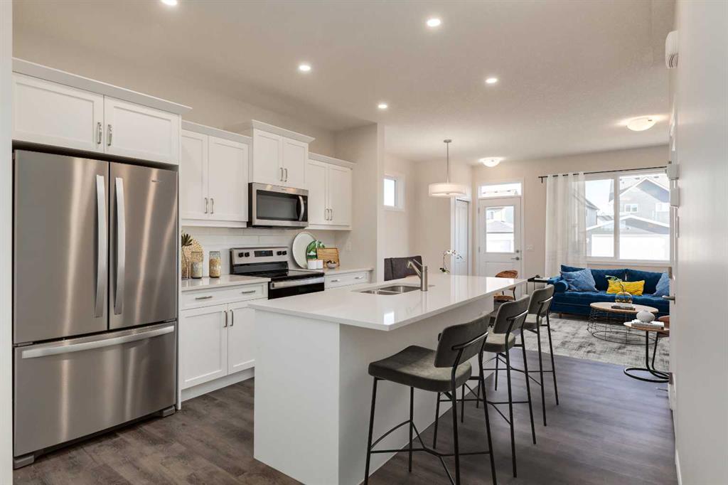 Welcome to “The Kinley”, a bright, modern detached two-storey home in the sought after community of Montrose, one of High River’s most family-friendly communities. This open concept floor plan offers 1,255 sq. ft., 3 bedrooms, and 2.5 bathrooms, with an open layout designed to feel connected, comfortable, and easy for everyday life. Step inside and you’ll immediately notice the natural light and the way the main floor is built for real family routines—morning breakfasts, homework at the table, and weekend hangouts that naturally flow from one space to the next. At the heart of the home, the kitchen pairs clean, timeless finishes with modern contrast including quartz countertops, classic stacked-tile backsplash, “mushroom” coloured cabinetry, and black hardware that ties it all together. The galley-style kitchen with a large island keeps everything within reach, while a walk-in pantry makes day-to-day storage simple. One of the most unique (and practical) features is the built-in banquet bench seating in the dining area, perfect for kids’ meals, board games, and those “everyone pile in” moments when friends come over. And because the main floor is oriented to the backyard, it’s easy to keep an eye on the action outside while you cook or entertain. Upstairs, the layout continues to impress with a winged bedroom design that adds privacy between rooms—ideal for families with kids, guests, or a home office setup. The owner’s suite includes a walk-in closet and a 4-piece ensuite, creating a calm retreat at the end of the day. The full basement offers a ton of future potential, think playroom now, gym or extra living space later. Outside, you’ll love the west-facing yard for sunny afternoons and evening light, great for BBQs, patio time, and watching the kids play after school. There’s also a concrete parking pad, adding everyday convenience right from day one. And then there’s the community—Montrose is built for families who want more than just a house. The neighbourhood is anchored by a weaving pond system, playgrounds, walking trails, and sports courts, plus standout amenities like a shaded pergola lookout, community gardens, and tennis/pickleball courts. The community is designed so you can actually live locally, an easy walk to everyday needs (including groceries) and a pedestrian-friendly network of pathways throughout. School options are also a big plus, with designated schools easy to reach by walking or biking. If you’re looking for a home that’s stylish, functional, and set in a community where kids can grow up with parks, pathways, and neighbours close by, this might just be the one. **Photos are from the show home/previous builds to demonstrate quality of construction & finishes and may not be an exact representation of this home**