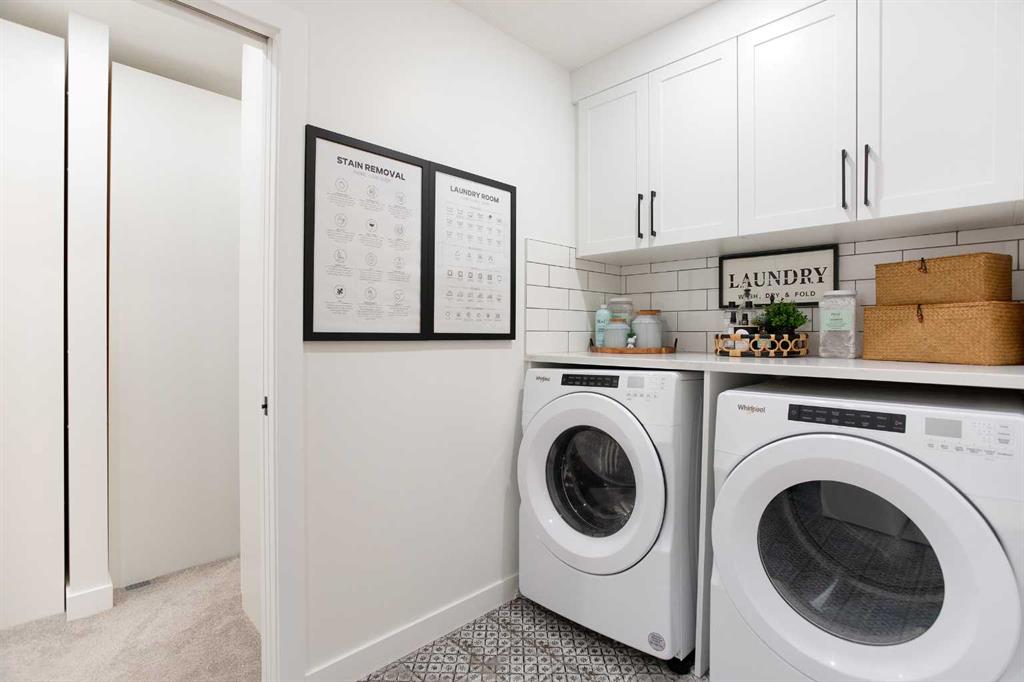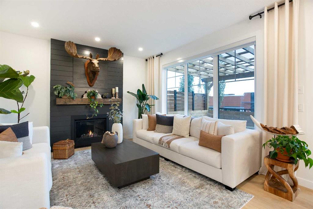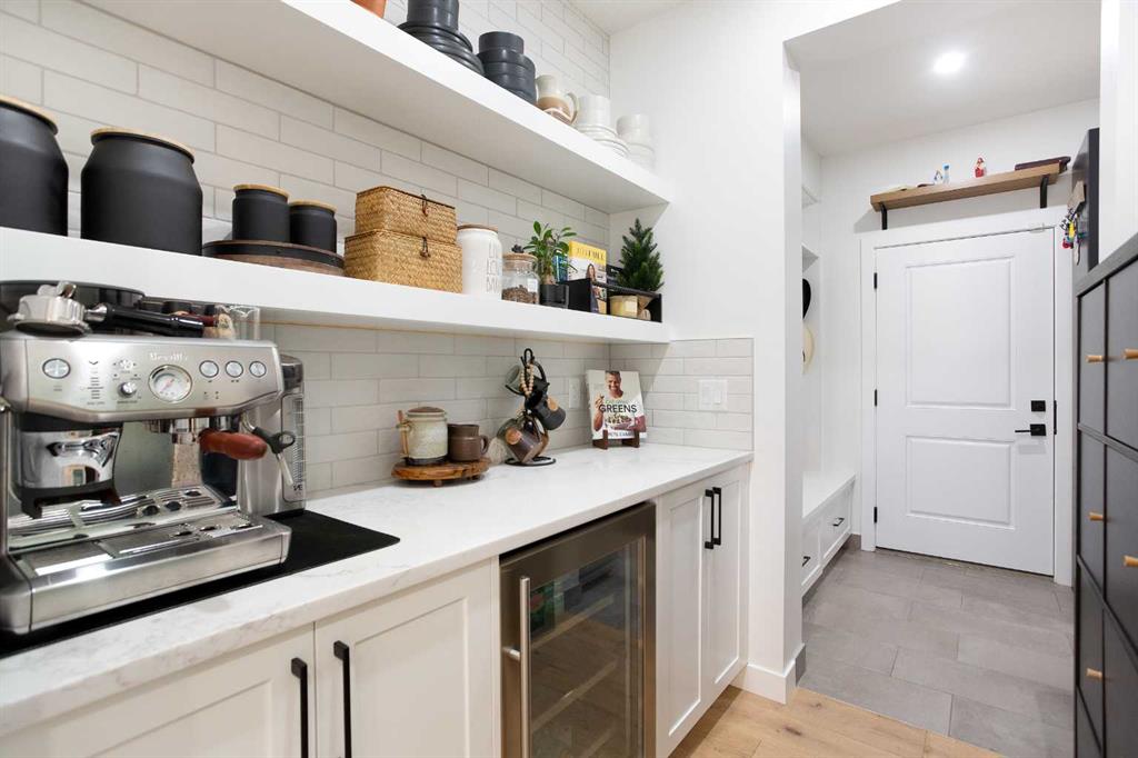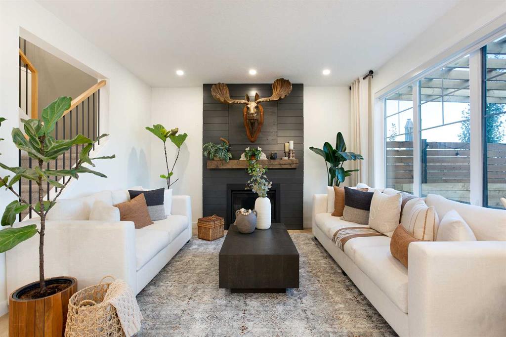 The kitchen anchors the main floor with its clean lines and functionality. Quartz countertops, full-height cabinetry, a gas range with pot filler, and a walk-through butler’s pantry with coffee bar make it a true showstopper for both cooking and entertaining. The living room is defined by a statement fireplace wrapped in shiplap with a solid wood mantel — a warm focal point on cool Alberta evenings.