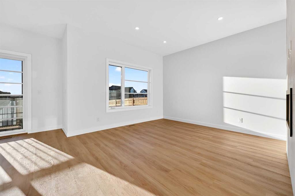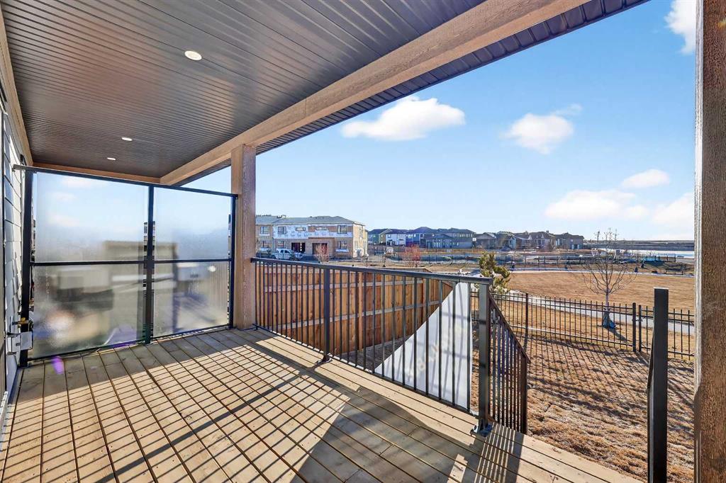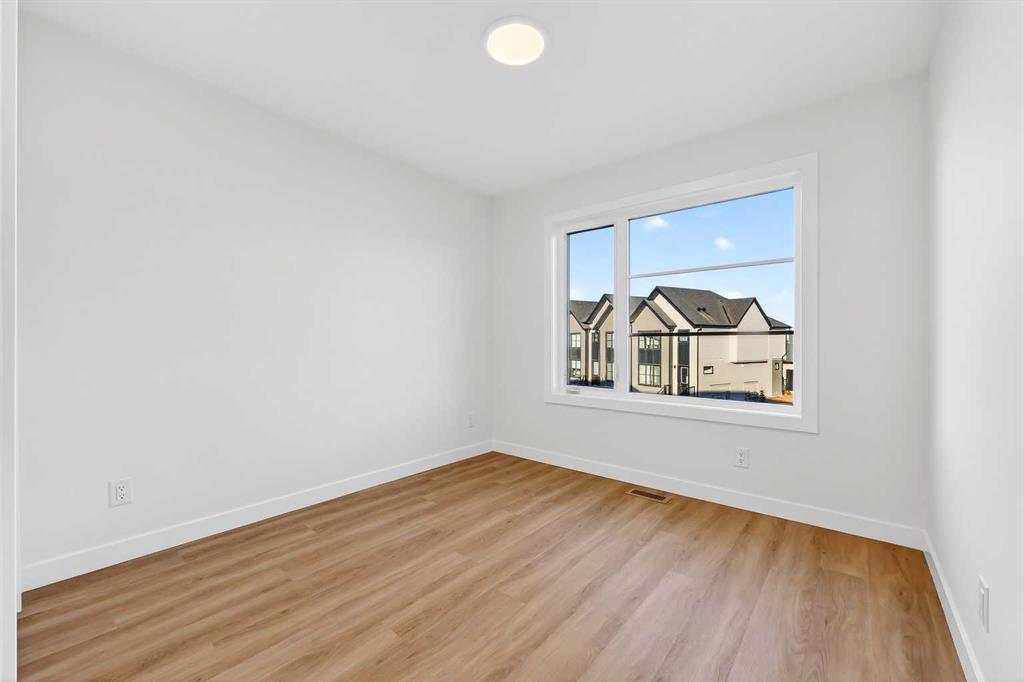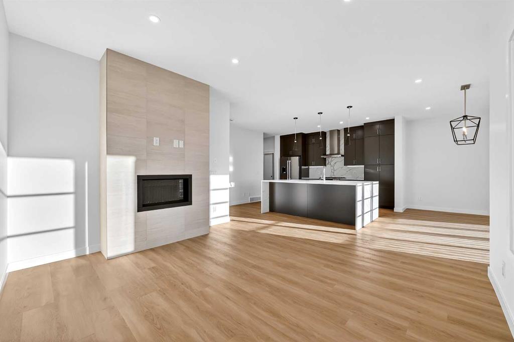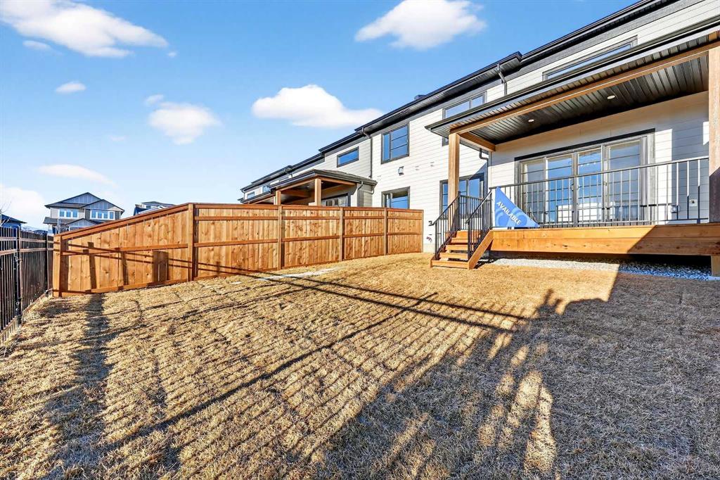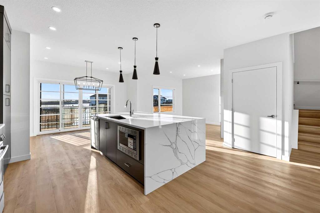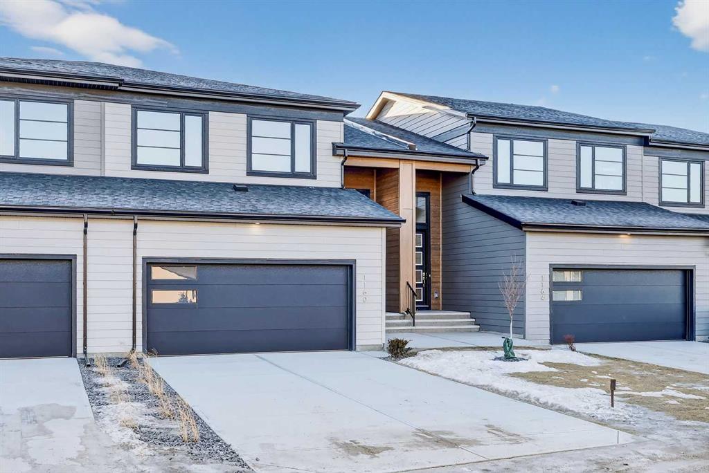 Experience the height of sophisticated living in this highly coveted luxury townhome, where a generous floor plan meets modern comfort and refined finishes. Proudly presented by StreetSide – this thoughtfully designed unit features 3 bedrooms, 2.5 bathrooms, and a front attached double car garage. The heart of the home is a spacious kitchen with a large central island, polished white quartz countertops, upgraded stainless steel appliances including a gas range, and elegant sliding French patio doors that opens to your covered deck area – ideal for both everyday living and entertaining. A cozy fireplace anchors the living room, while luxury vinyl plank flooring flows throughout the main living areas, complemented by gorgeous tile in the entry and bathrooms. The primary ensuite is a private sanctuary, complete with heated tile flooring, double sinks, a freestanding soaker tub, and an oversized tile-and-glass shower delivering spa-inspired comfort at home. The unfinished basement with roughed-in plumbing provides future potential for additional living space tailored to your needs. Professional landscaping and fencing complete your new home. Ideally located in the award-winning community of Harmony, residents enjoy Mickelson National Golf Course, private lake amenities, scenic walking and biking trails, and a wellness-focused lifestyle—just a shorty drive from Calgary city minutes and 45 minutes from the Rocky Mountains, where nature and convenience come together effortlessly