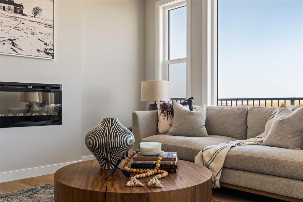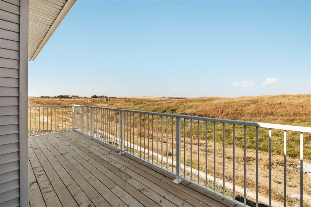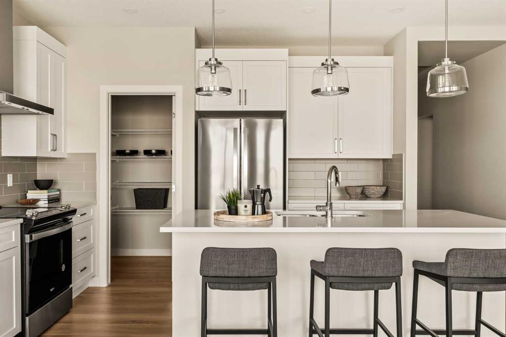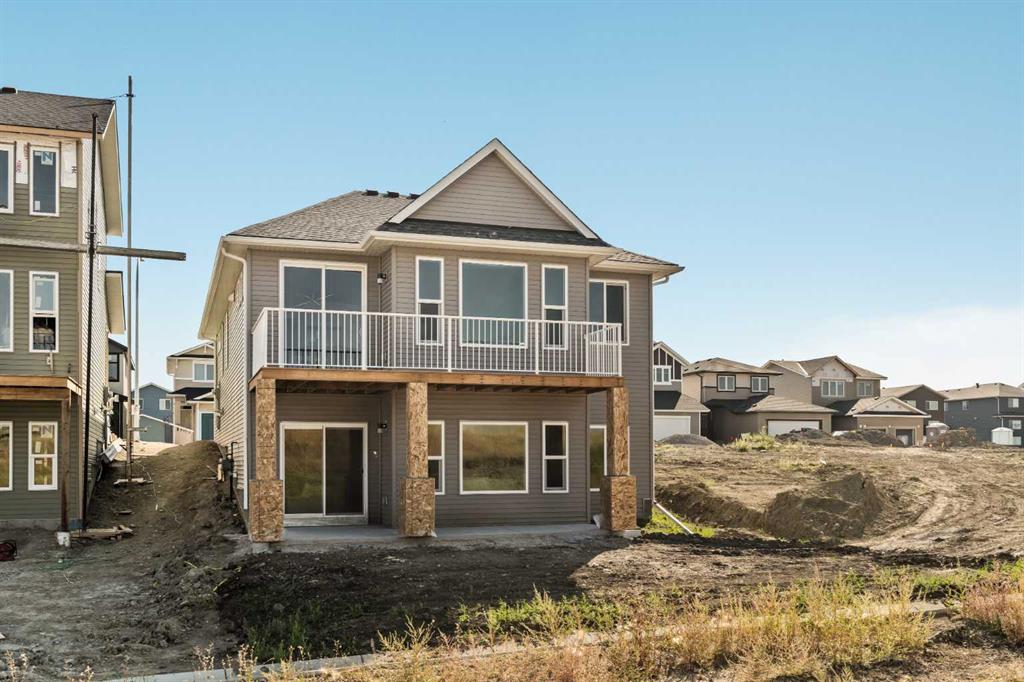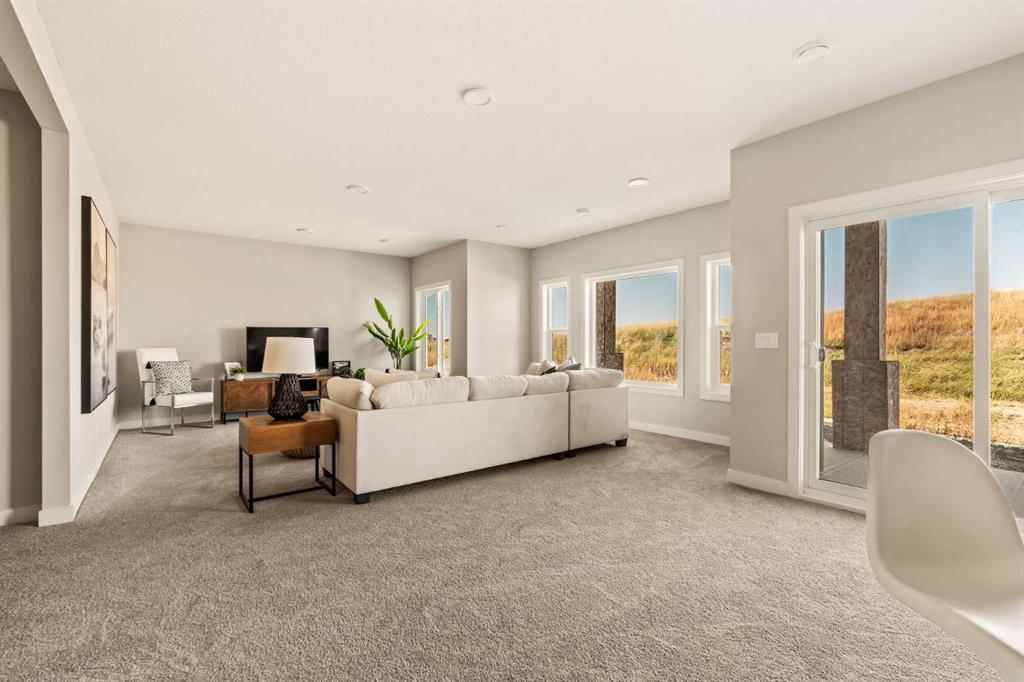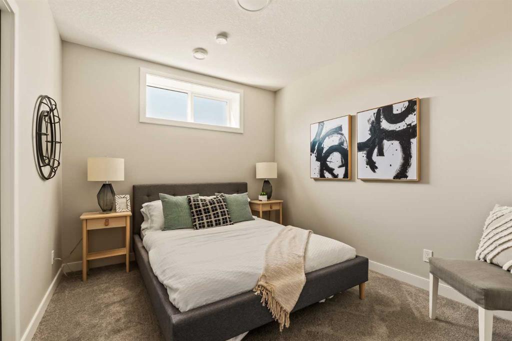 An incredible opportunity awaits in this brand new move-in ready Walkout Bungalow in the heart of Crossfield! Offering 2 living areas, 4 bedrooms, 2.5 bathrooms and nearly 2,200 square feet of developed space over two levels + an oversized double attached garage, this home is perfect for those looking to downsize without compromise or for a family! The bright and open main living area features a central kitchen that overlooks both living and dining spaces – making it the perfect space for entertaining. The expansive kitchen is complete with timeless white shaker cabinets accented by a subway tile backsplash. The light quartz countertops create a clean and seamless look while providing a bright and clean living space. The kitchen is complete with a large 5′ deep corner pantry with endless storage, a slide-in range, chimney hood fan and suite of stainless steel appliances. The 9’x10′ dining area has ample space for a large dining table and the kitchen island offers additional seating space. The main living area has a central fireplace, perfect for cozy winter nights, and a wall of windows across the back of the home allow natural light to flood the main living space all day long. Patio doors off of the main dining area provide access to the large 23′ wide deck, with ample space for a cooking area and lounging space. The large primary suite has windows centering the bedframe with ample space for a king-sized bed and the intelligently designed niche is the perfect space for a wardrobe – providing a comfortable primary suite that can accommodate a full bedroom set. The primary suite is complete with a 5pc en suite including dual undermount sinks with quartz countertop, a soaker tub, walk-in shower and a large walk-in closet. The main level is completed with a full second bedroom, which could be a home office space, and a full bathroom – providing the ideal layout for multi-generational living or the perfect bedroom for a younger child. Laundry is located on the main level, providing added convenience to everyday living. The lower level has been professionally developed to mirror the same design aesthetic throughout. With 9′ ceilings and a wall of windows on the walkout basement, the expansive ~27’x17′ rec room offers ample space for a TV area, games space and home gym if desired! The basement is complete with two more bedrooms, a full bathroom and endless storage! A covered patio on the lower level walkout basement is the perfect space to relax while overlooking your fully private backyard. Ideal for those wanting a lower-maintenance lifestyle and single level-living, this beautiful new home is move-in ready in the charming small town of Crossfield! With the endless amenities of Airdrie and Calgary just minutes away, this property offers a tranquil lifestyle without compromise! This home comes with full Builder Warranty + Alberta New Home Warranty allow you to purchase with peace of mind.