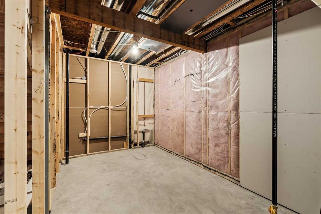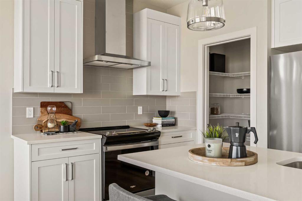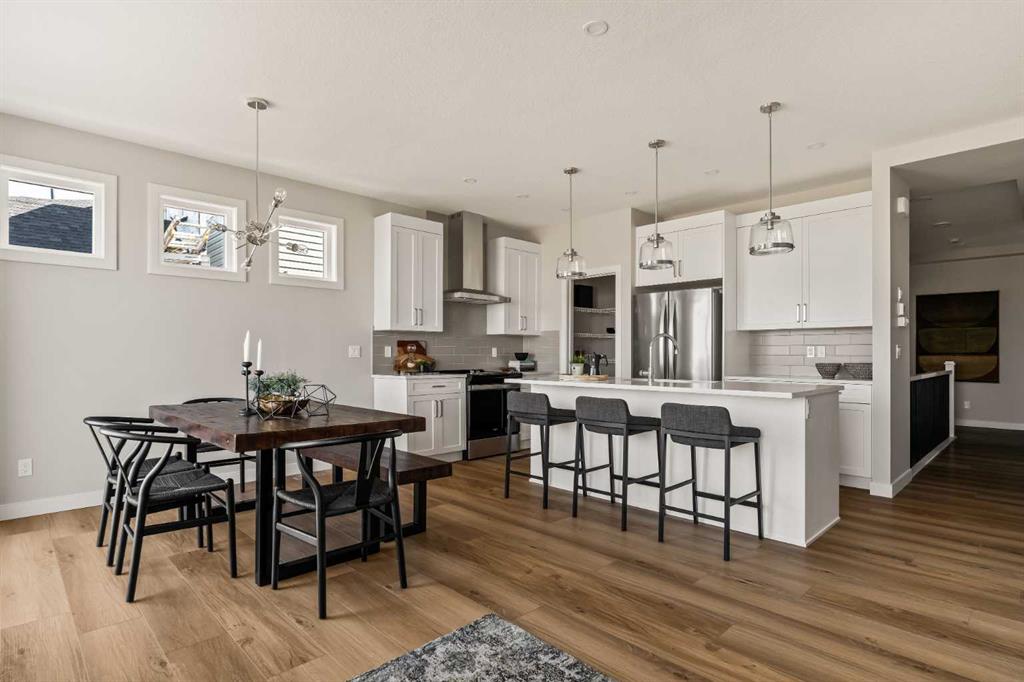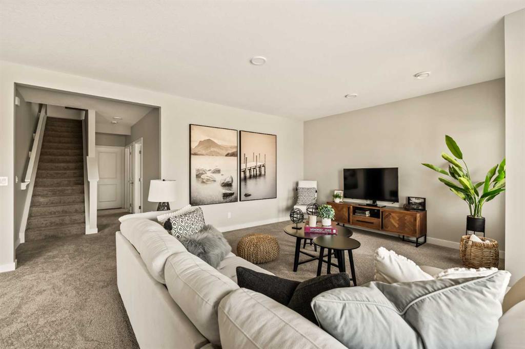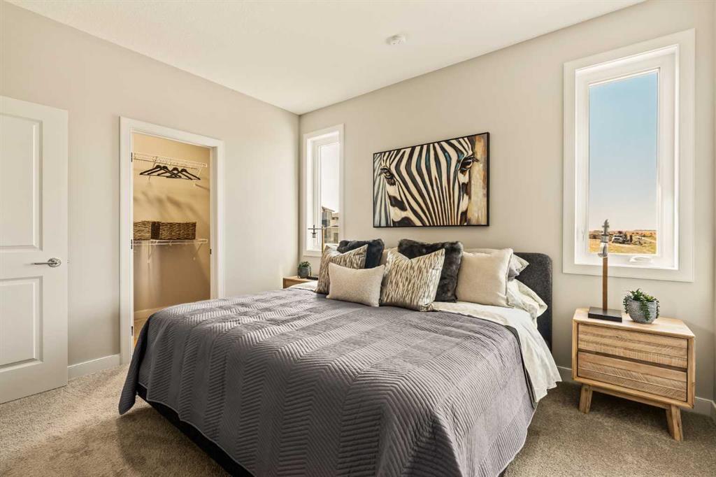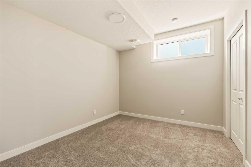 An incredible opportunity awaits in this brand new move-in ready Walkout Bungalow in the heart of Crossfield! Offering 2 living areas, 4 bedrooms, 2.5 bathrooms and nearly 2,200 square feet of developed space over two levels + an oversized double attached garage, this home is perfect for those looking to downsize without compromise or for a family! The bright and open main living area features a central kitchen that overlooks both living and dining spaces – making it the perfect space for entertaining. The expansive kitchen is complete with timeless white shaker cabinets accented by a subway tile backsplash. The light quartz countertops create a clean and seamless look while providing a bright and clean living space. The kitchen is complete with a large 5′ deep corner pantry with endless storage, a slide-in range, chimney hood fan and suite of stainless steel appliances. The 9’x10′ dining area has ample space for a large dining table and the kitchen island offers additional seating space. The main living area has a central fireplace, perfect for cozy winter nights, and a wall of windows across the back of the home allow natural light to flood the main living space all day long. Patio doors off of the main dining area provide access to the large 23′ wide deck, with ample space for a cooking area and lounging space. The large primary suite has windows centering the bedframe with ample space for a king-sized bed and the intelligently designed niche is the perfect space for a wardrobe – providing a comfortable primary suite that can accommodate a full bedroom set. The primary suite is complete with a 5pc en suite including dual undermount sinks with quartz countertop, a soaker tub, walk-in shower and a large walk-in closet. The main level is completed with a full second bedroom, which could be a home office space, and a full bathroom – providing the ideal layout for multi-generational living or the perfect bedroom for a younger child. Laundry is located on the main level, providing added convenience to everyday living. The lower level has been professionally developed to mirror the same design aesthetic throughout. With 9′ ceilings and a wall of windows on the walkout basement, the expansive ~27’x17′ rec room offers ample space for a TV area, games space and home gym if desired! The basement is complete with two more bedrooms, a full bathroom and endless storage! A covered patio on the lower level walkout basement is the perfect space to relax while overlooking your fully private backyard. Ideal for those wanting a lower-maintenance lifestyle and single level-living, this beautiful new home is move-in ready in the charming small town of Crossfield! With the endless amenities of Airdrie and Calgary just minutes away, this property offers a tranquil lifestyle without compromise! This home comes with full Builder Warranty + Alberta New Home Warranty allow you to purchase with peace of mind.