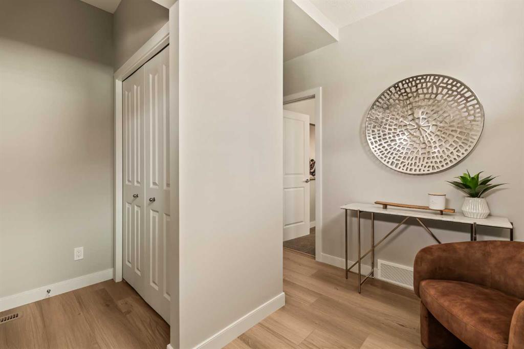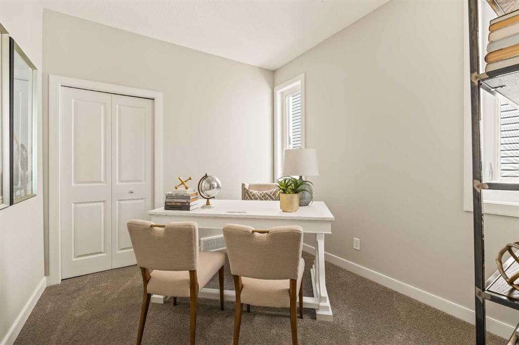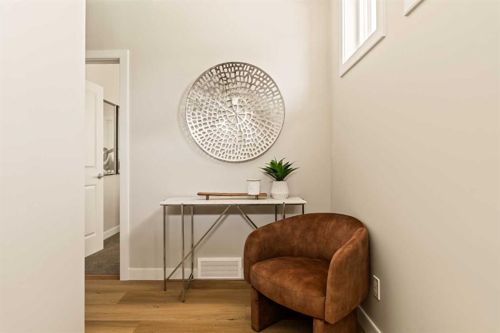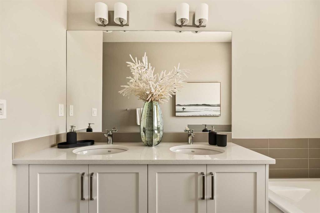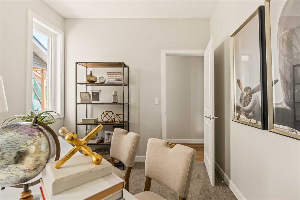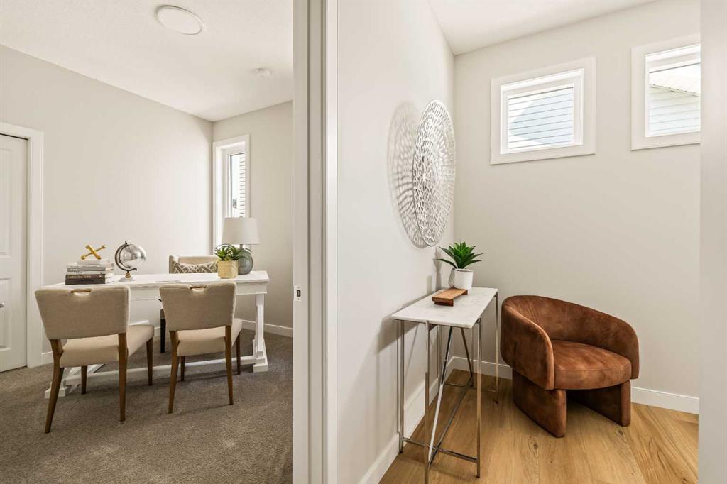 An incredible opportunity awaits in this brand new move-in ready Walkout Bungalow in the heart of Crossfield! Offering 2 living areas, 4 bedrooms, 2.5 bathrooms and nearly 2,200 square feet of developed space over two levels + an oversized double attached garage, this home is perfect for those looking to downsize without compromise or for a family! The bright and open main living area features a central kitchen that overlooks both living and dining spaces – making it the perfect space for entertaining. The expansive kitchen is complete with timeless white shaker cabinets accented by a subway tile backsplash. The light quartz countertops create a clean and seamless look while providing a bright and clean living space. The kitchen is complete with a large 5′ deep corner pantry with endless storage, a slide-in range, chimney hood fan and suite of stainless steel appliances. The 9’x10′ dining area has ample space for a large dining table and the kitchen island offers additional seating space. The main living area has a central fireplace, perfect for cozy winter nights, and a wall of windows across the back of the home allow natural light to flood the main living space all day long. Patio doors off of the main dining area provide access to the large 23′ wide deck, with ample space for a cooking area and lounging space. The large primary suite has windows centering the bedframe with ample space for a king-sized bed and the intelligently designed niche is the perfect space for a wardrobe – providing a comfortable primary suite that can accommodate a full bedroom set. The primary suite is complete with a 5pc en suite including dual undermount sinks with quartz countertop, a soaker tub, walk-in shower and a large walk-in closet. The main level is completed with a full second bedroom, which could be a home office space, and a full bathroom – providing the ideal layout for multi-generational living or the perfect bedroom for a younger child. Laundry is located on the main level, providing added convenience to everyday living. The lower level has been professionally developed to mirror the same design aesthetic throughout. With 9′ ceilings and a wall of windows on the walkout basement, the expansive ~27’x17′ rec room offers ample space for a TV area, games space and home gym if desired! The basement is complete with two more bedrooms, a full bathroom and endless storage! A covered patio on the lower level walkout basement is the perfect space to relax while overlooking your fully private backyard. Ideal for those wanting a lower-maintenance lifestyle and single level-living, this beautiful new home is move-in ready in the charming small town of Crossfield! With the endless amenities of Airdrie and Calgary just minutes away, this property offers a tranquil lifestyle without compromise! This home comes with full Builder Warranty + Alberta New Home Warranty allow you to purchase with peace of mind.