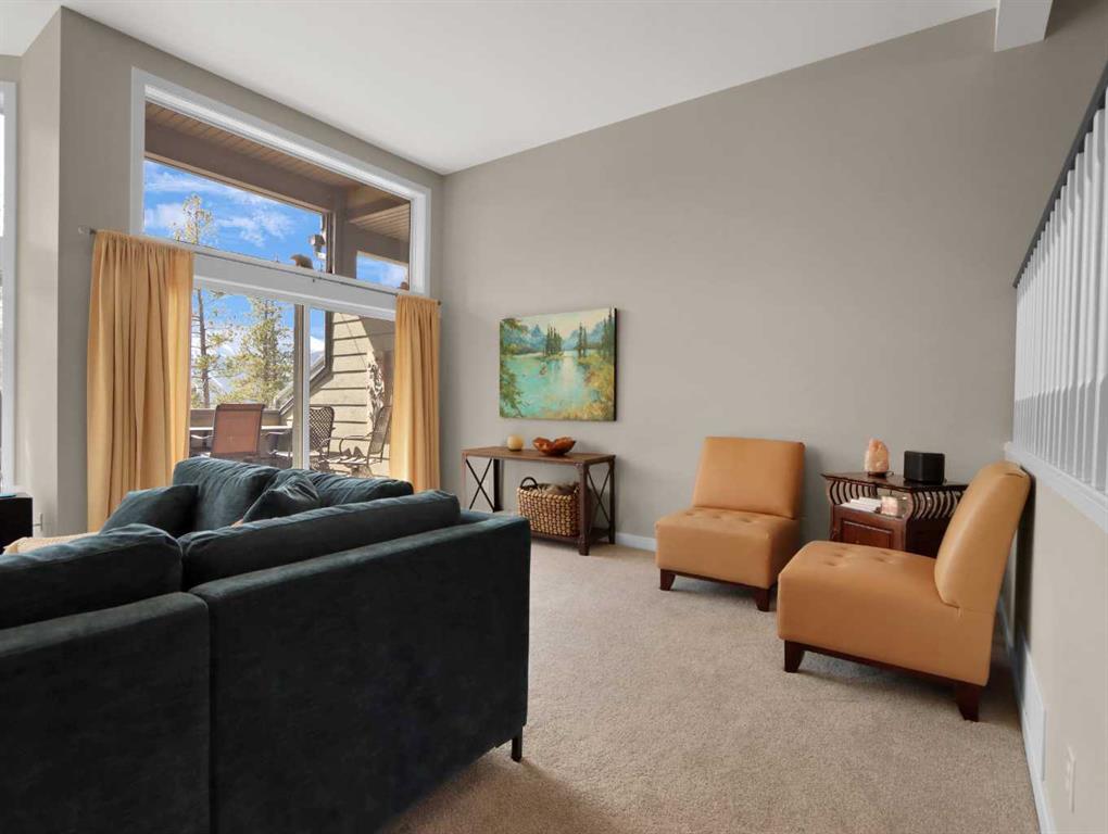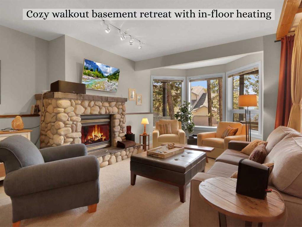 Immerse yourself in breathtaking mountain views from every angle of this 3 bedroom open-plan 2,785 sqft half duplex in Silvertip. The grand foyer leads to a living room with soaring cathedral ceilings, a striking stone-surround gas fireplace, and an impressive wall of south-facing windows. Multiple decks throughout the property provide unparalleled vantage points for soaking in the sun & mountain views. A few steps up is the dining room and spacious kitchen, complete with a versatile nook/office area. Upstairs, the generous primary suite boasts vaulted ceilings, captivating views, and a luxurious 5-pce ensuite. A second large bedroom with a 4-pce ensuite and a laundry room complete this floor. The walkout lower level features a 3rd bedroom & family room (or 4th bedroom) with another stone-surround gas fireplace, south-facing windows, a view patio, a wet bar, and a 4-pce bath-all with in-slab heating. A heated double garage and ample storage make this home truly exceptional.