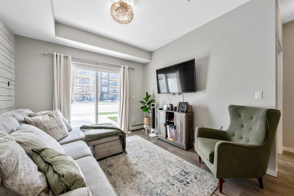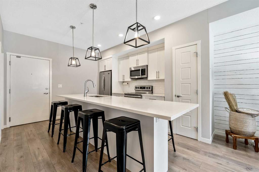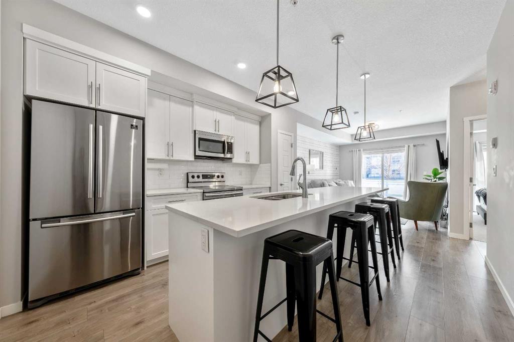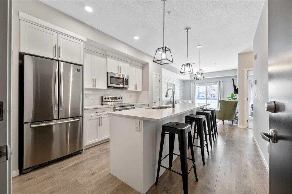 Welcome to this beautifully maintained GROUND-FLOOR apartment in the vibrant and highly walkable community of SETON. Offering a bright and functional 1 BEDROOM, 1 BATHROOM layout, this home is a fantastic option for first-time buyers, downsizers, investors, or anyone looking for low-maintenance living in one of Calgary’s most exciting southeast communities. Inside, you’ll appreciate the modern open-concept design featuring VINYL PLANK FLOORING, stylish lighting, QUARTZ COUNTERTOPS, stainless steel appliances, a subway tile backsplash, and a large kitchen island with seating, creating an inviting space for everyday living and entertaining. The living room is comfortable and well laid out, with sliding patio doors that bring in natural light and provide direct access to your private ground-floor patio.