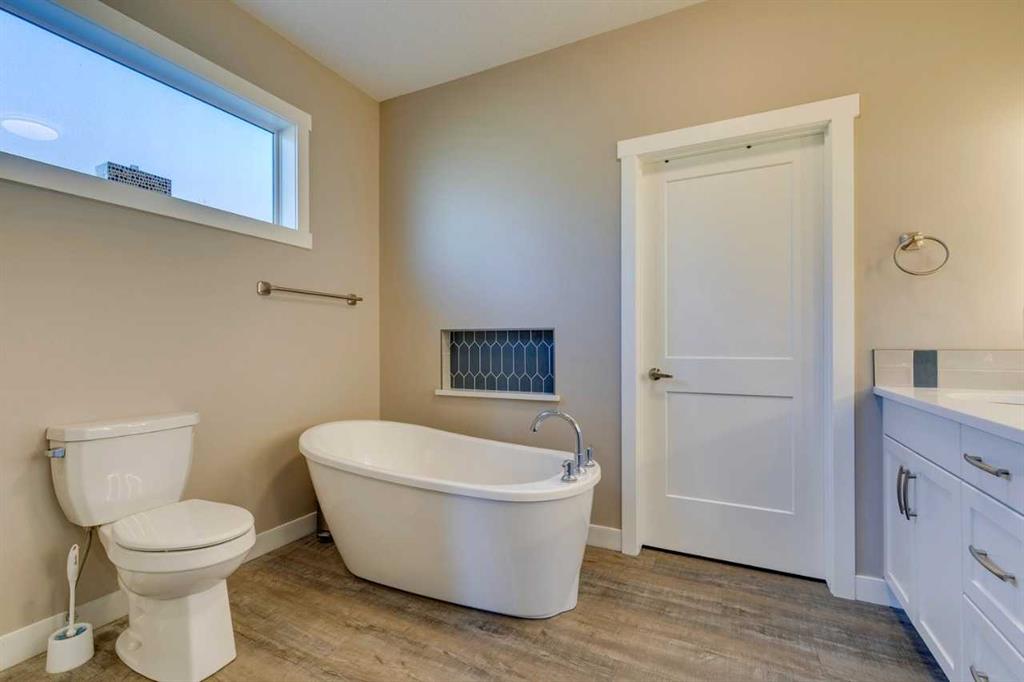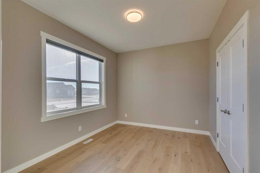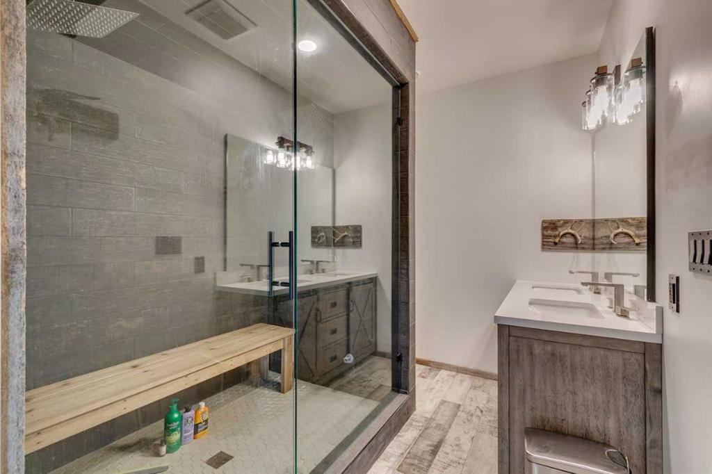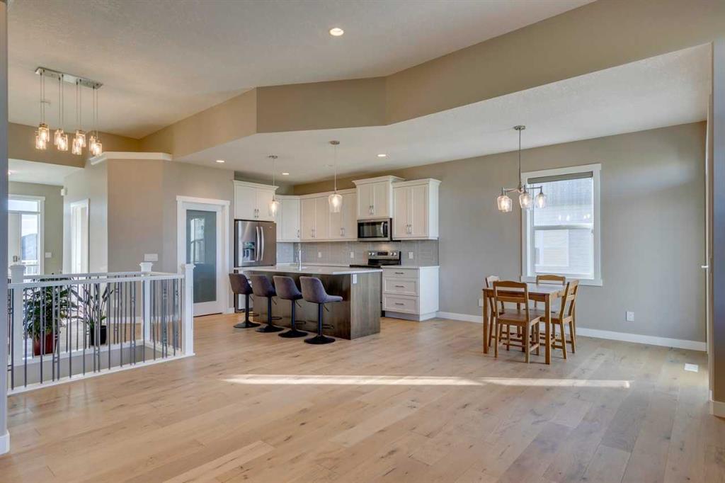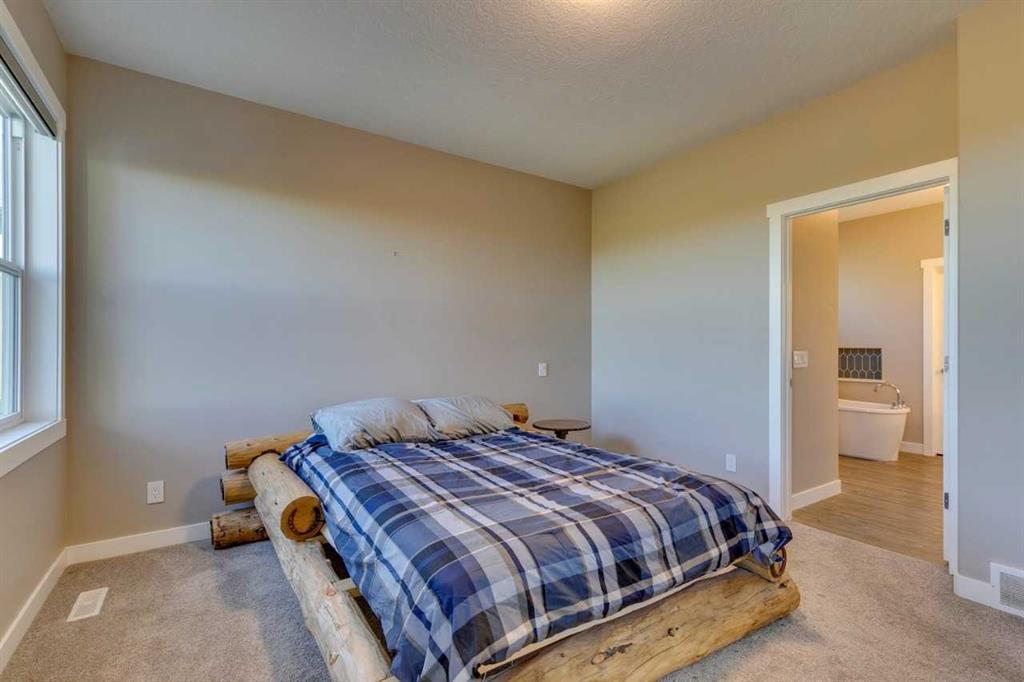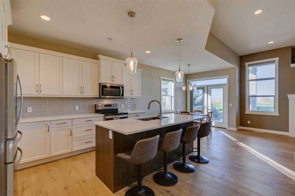 Beautifully maintained walk-out bungalow located in a quiet cul-de-sac in Speargrass, backing onto the golf course with mountain and sunset views. The kitchen features a walk-in pantry, modern cabinetry with under-cabinet lighting, quartz countertops, and a large centre island that opens to a covered outdoor living space. The primary bedroom includes a five-piece ensuite with soaking tub, wall niche, separate shower, dual sinks with backlit mirrors, and a walk-in closet with automatic lighting and direct access to the laundry room. A second bedroom, which can also serve as a home office, is located on this level along with a guest bathroom and access to the oversized 25×24 double garage. The Walk-Out Basement finished in 2024 features an additional bedroom, another full bath with 3 person steam room, gym, bar/area and storage with potential for a 4th bedroom development. Exterior highlights include an extended driveway and the opportunity to landscape the backyard to your preference. Additional features include central air conditioning and automated window blinds on remote. Conveniently located approximately 40 minutes from Calgary’s South Health Campus, this home combines comfort, functionality, and a scenic setting.