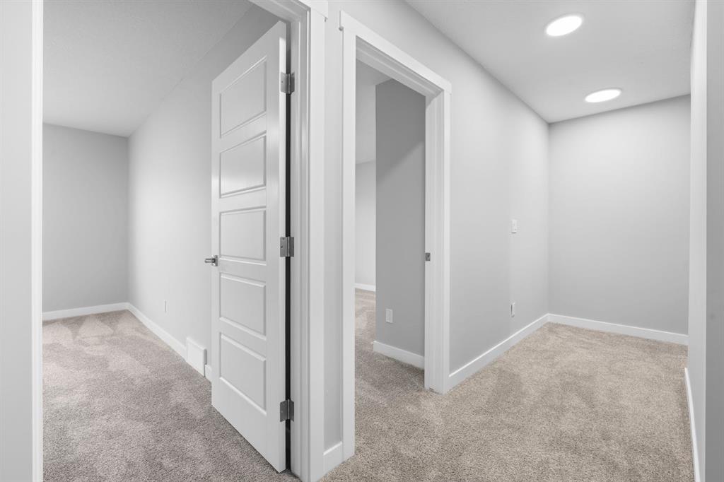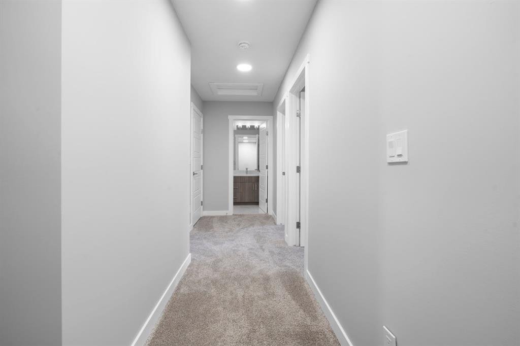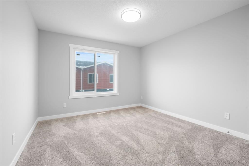 Welcome to this elegant brand-new 3-storey townhome with double attached garage, offering 4 bedrooms and 3.5 bathrooms in the desirable community of Redstone. Designed with upscale modern finishes, this home features quartz countertops, full-height glossy cabinetry, stainless steel appliances, soft-close drawers and cabinets, stacked front-load washer & dryer, and energy-efficient high-performance windows. A rare main-floor studio bedroom with wet bar and 4-pc ensuite provides an ideal private space for elderly family members, guests, or independent living. The open-concept second level showcases a chef-inspired kitchen with large island, pantry, dedicated dining area, home office/den with frosted French doors, and an expansive living room opening to an east-facing balcony, lighting, and privacy screen. Upper level includes a spacious primary suite with walk-in closet and ensuite, two additional bedrooms, full bath, and upper-floor laundry. Low condo fees, central greenspace courtyard, visitor parking, and quick access to Stoney Trail complete this exceptional offering. **Photos are of similar unit in the complex, all from the same floor plan, exterior & interior colors and layout may differ. Photos with furniture are virtually staged. Floor plans are attached in the supplements for this unit.