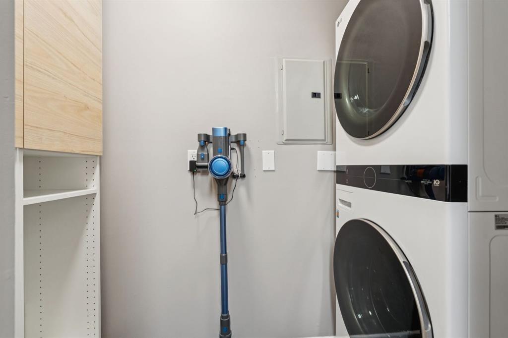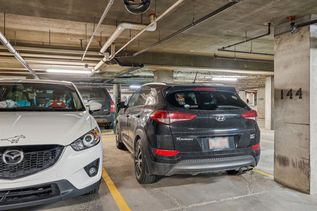 Additional conveniences include in-suite laundry with ample storage, two titled heated underground parking stalls, a separate storage unit, and underground guest parking.
