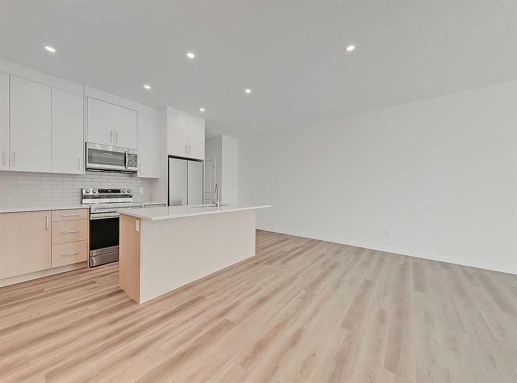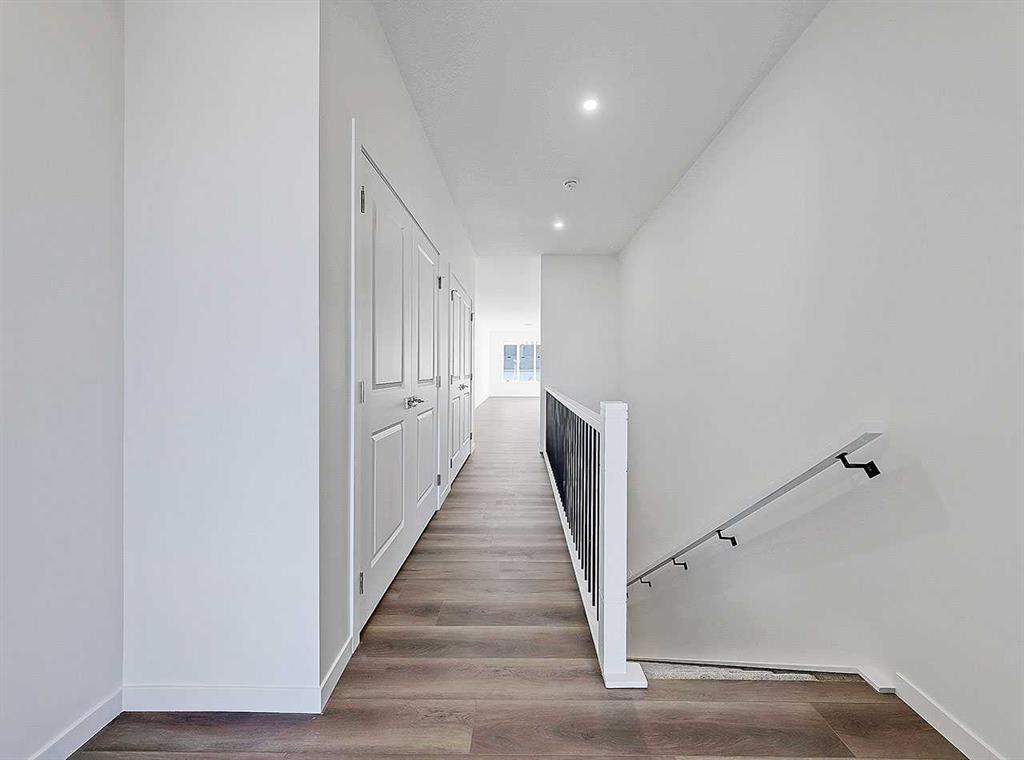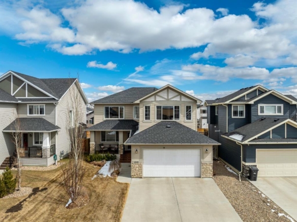 Inside, the home immediately impresses with elevated finish selections and a thoughtfully optimized layout designed for exceptional main-floor living. The stunning front entry features a custom-built railing, 9’ ceilings, an 8’ triple-pane door, and two walk-in closets offering ample storage. The chef-inspired kitchen showcases ceiling-height cabinetry locally crafted in Airdrie, all custom-made with soft-close technology, and paired with a fully upgraded premium appliance package. Timeless 3cm quartz countertops are featured throughout the home, creating a cohesive and elegant finish.