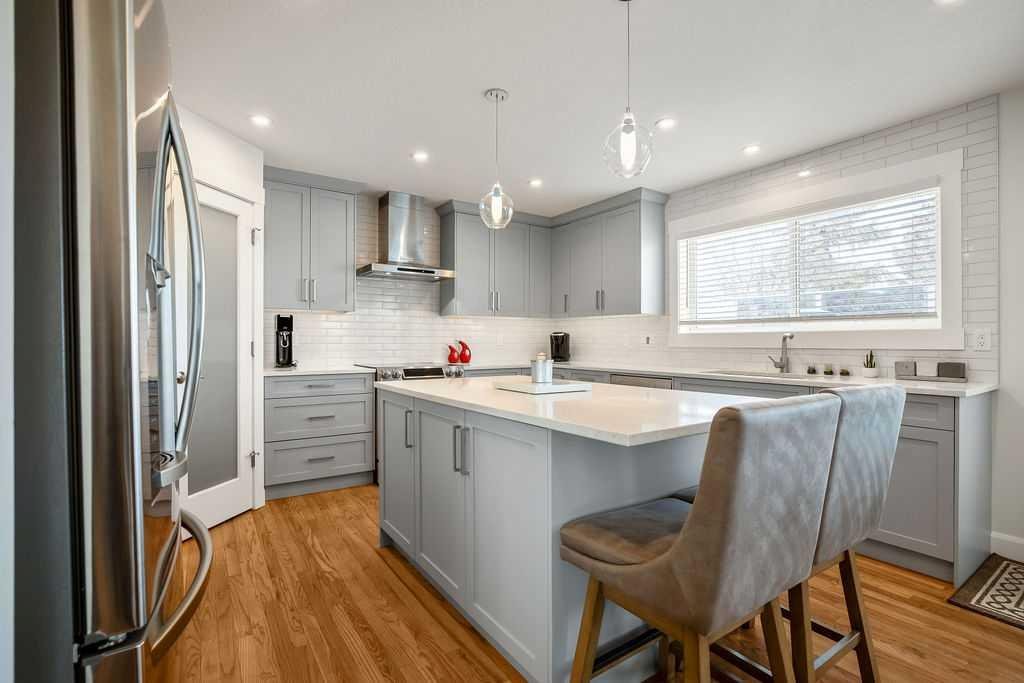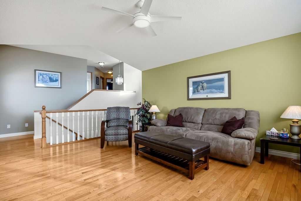 Lake living at its finest! You and your family will enjoy swimming, boating, fishing, and skating in the community with the Rocky mountains as your backdrop. Schools and shopping are also right there. This spacious two storey home shows pride of ownership the moment you see it. You enter the home to an open plan with a large dining room and built in cabinet. The real treat is the newly renovated island kitchen. Boasting tonnes of cabinetry, a corner pantry, quartz counters and stainless steel appliances including an induction stove! Relax in the living room and enjoy the gas fireplace. Real hardwood flooring looks great and is located on both the main and upper floor. Kids will hang out in the large bonus room featuring vaulted ceilings and lots of light. All bedrooms are well sized and the master bedroom has a walk in closet and four piece en suite. Need more space. Well, get ready for the fully finished walk out level. It has a rec room, fourth bedroom, three piece bath, and ample storage. Enjoy outdoor living on either the low maintenance deck or on the fully lit walkout level patio. Escape the heat with the central air conditioning. The home also has built in soffit lights to provide better visibility and style. This just might be the ideal family home!
