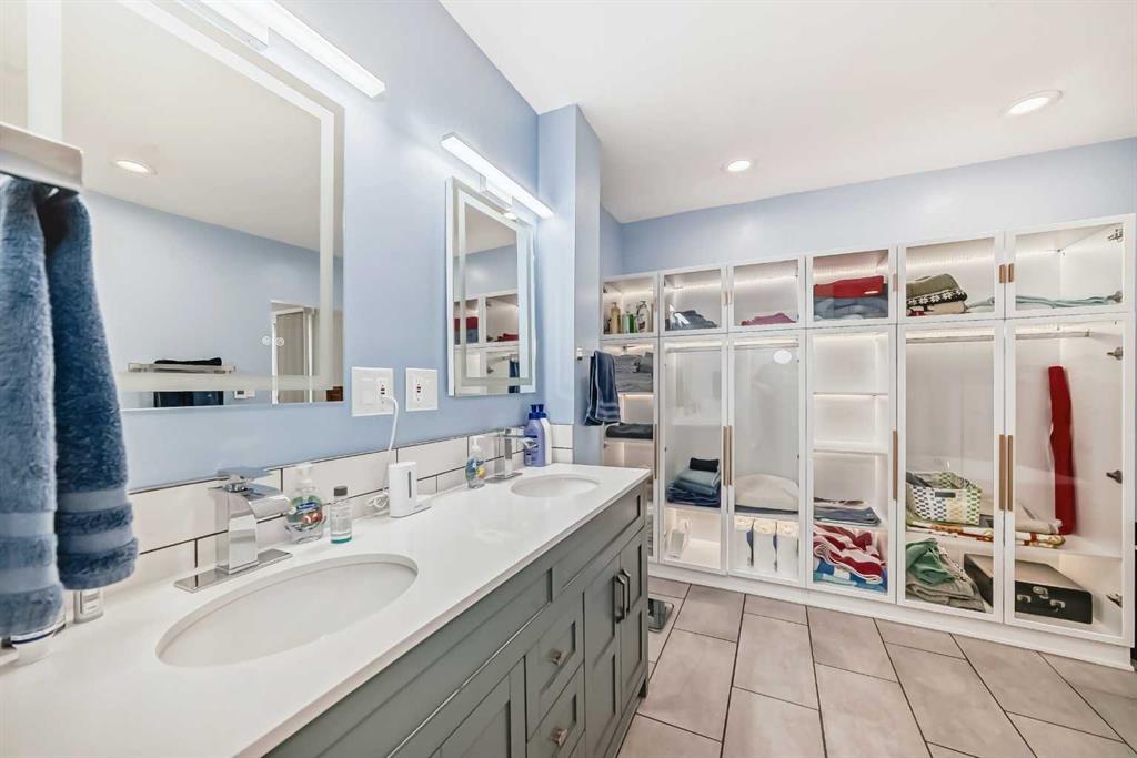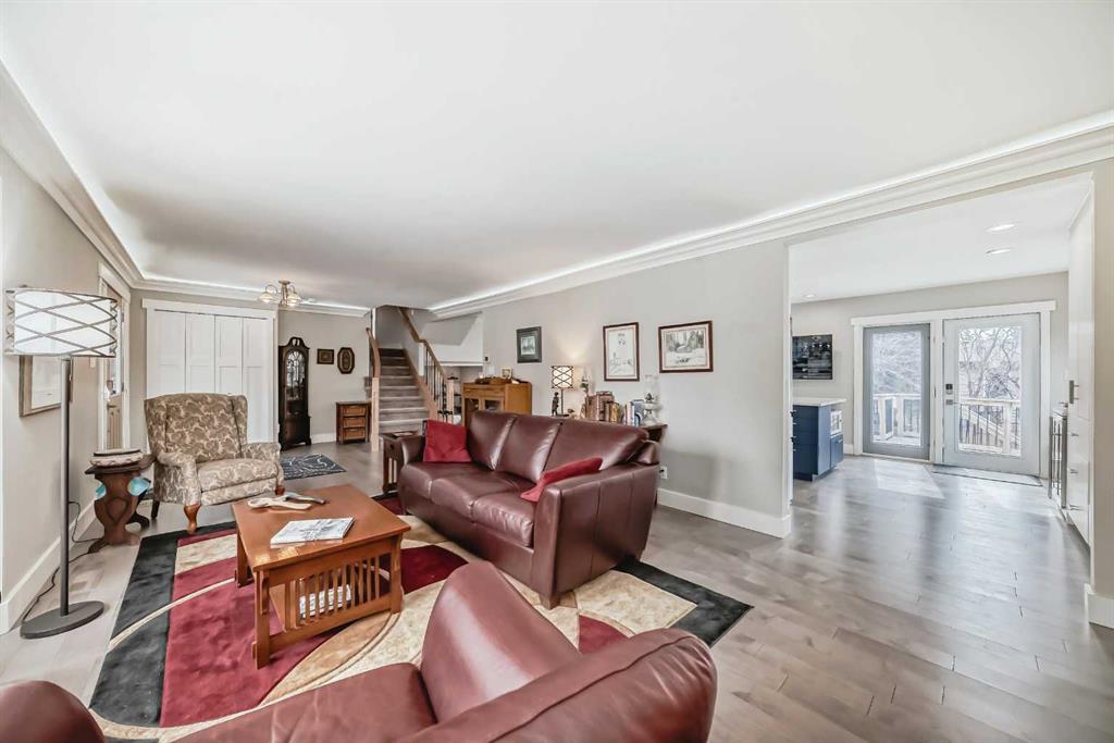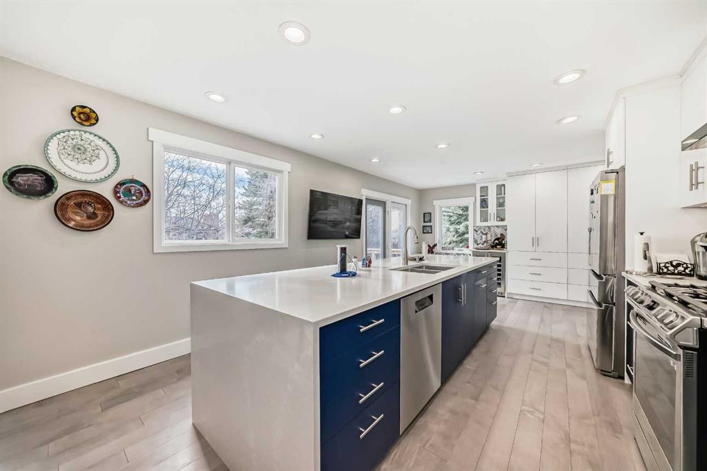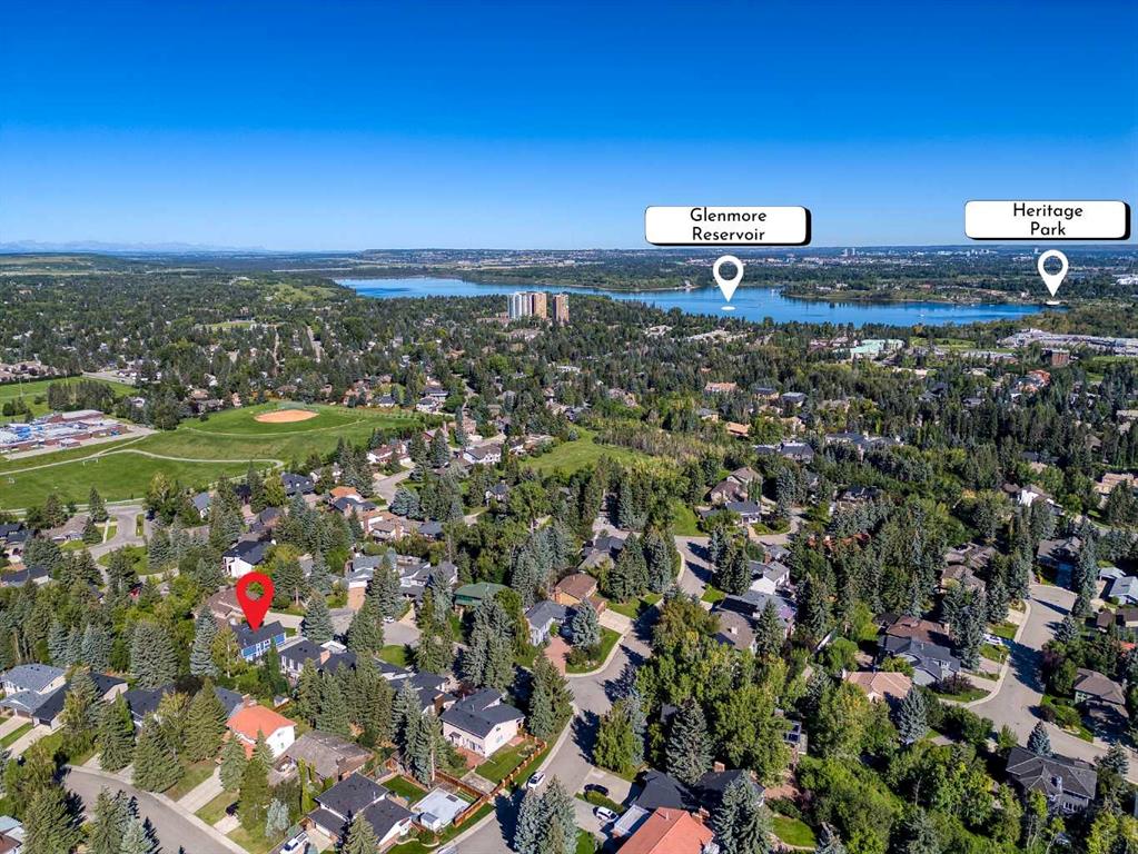 Open House Saturday, Jan 17th between 1:00-3:00 pm! New Price! Rarely available in this prestigious location! Come home to your unique 2 storey split home located on a huge pie lot, nearly a quarter acre with a south-southwest backyard, nestled in a quiet cul-de-sac! Enjoy the tranquility, peaceful and park-like yard with mature trees and space to play or relax near the patio stone fire pit. Multi year renovation, with all permits in place, includes upgraded windows, smart home system, smooth ceilings throughout 3,400+ square feet of finished space, a truly stunning transformation. Enter into the main level showcasing engineered hardwood, adjacent living room with back lit crown mouldings and a raw edge, custom milled fireplace mantel complimenting the remote controlled gas fire. The expansive kitchen boasts an impressive 11′ quartz island with waterfall edge, sink with touch sensor faucet, and hidden USB, electrical outlets and wireless phone charger. High-end stainless steel appliance package includes a gas range with pot filling faucet, dramatic hood fan, separate refrigerator and wine fridge, complimented with detailed backsplash. Featuring soft close cabinet hinges and plenty of pantry storage, the kitchen is naturally sunlit with French doors and beautiful windows. Entertain guests with the open concept dining overlooking the family room. Step down to the walkout level into the family room designed with luxury vinyl plank flooring and multiple focal points being the breath taking stonework, gas fireplace and patio door. Conveniently the guest bathroom and laundry are near the garage entrance. Head upstairs to the primary wing redesigned with a vast sitting area, private balcony and luxurious en-suite! Rejuvenate with heated tile flooring, huge walk-in shower equipped with rain shower head and multiple jets or soak in the stand alone bathtub. LED mirrors rimmed with lighting soothe the mood over the twin sinks. The primary wing expands into the loft with a dormer and skylight allowing in rays of sunlight. Smart home lighting is controlled from the bedside switch all the way to the en-suite! The upper level has two more large bedrooms, a bonus room and full bathroom also with heated tile flooring. The fully finished basement has daylight pouring into the recreation room, another full luxury bathroom next to the fourth bedroom, den, workshop and utility room. Enjoy indoor / outdoor living with the low maintenance deck overlooking the yard and patio with spaces to host large gatherings. Double garage with twin doors, plenty of parking for your family and friends! Close proximity to trails, Southland Leisure Centre, Rockyview Hospital, Heritage Park, Glenmore Park, shopping and sought after schools! Book your showing today!