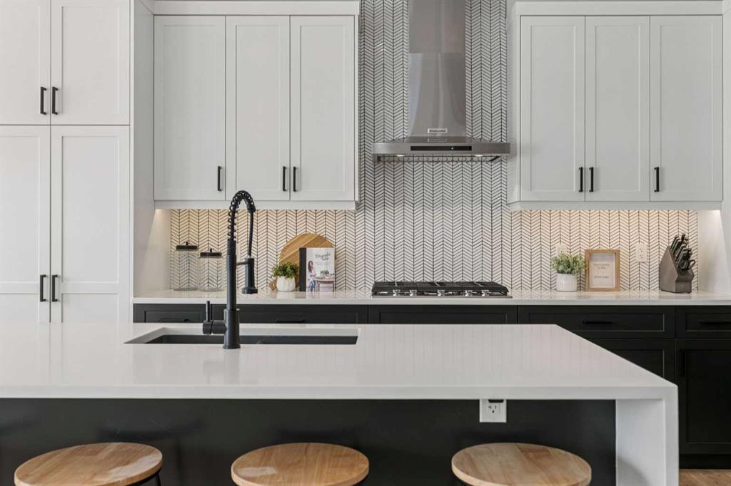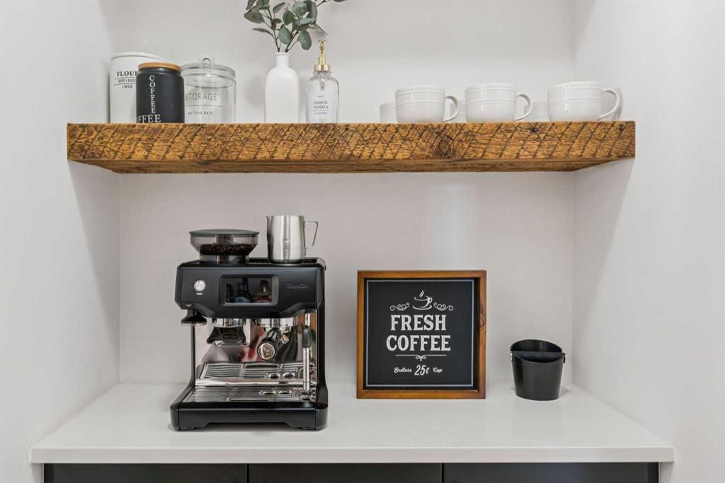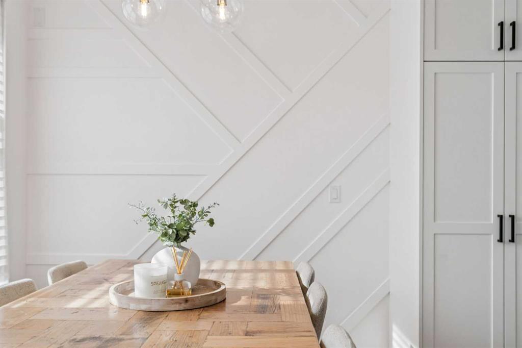 The GOURMET KITCHEN is a chef’s dream, complete with newly installed KITCHEN-AID STAINLESS STEEL APPLIANCES with a GAS COOKTOP, WALK-THROUGH PANTRY with COFFEE BAR, CUSTOM SHELVING and QUARTZ COUNTERTOPS with a WATERFALL EDGE on both sides of the island. Stylish TWO-TONED CABINETRY provides ample storage and prep space, while the adjoining dining area with a CUSTOM FEATURE WALL creates the perfect setting for entertaining family and friends.