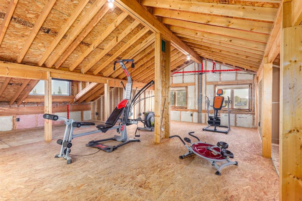 The crown jewel of this property is the oversized, multi-level shop. Designed for versatility and future potential, it features steel post construction, 200-amp electrical service, and rough-in plumbing and heating. A 14-foot drive-through door provides easy access for RVs, boats, or commercial vehicles. The heated main bay offers abundant room for projects or storage, while the second level is ready for a potential suite (subject to municipal approval) complete with a private balcony and breathtaking mountain views. The third level is currently used as a gym but could easily be transformed into a theatre room, recreation area, or additional storage space.