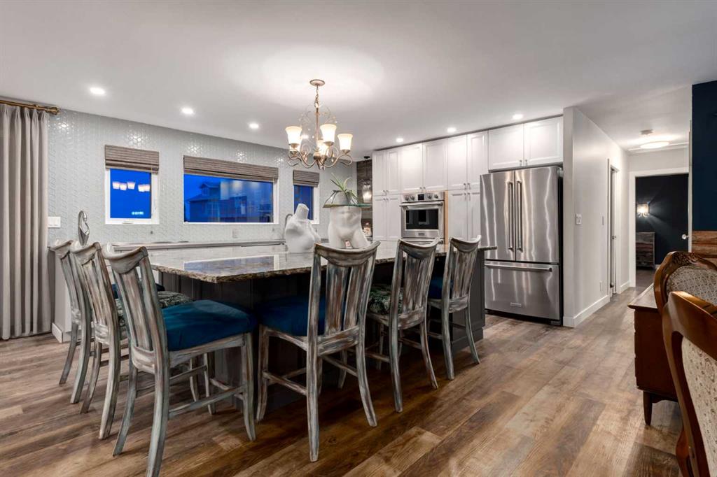 The open-concept main floor is drenched in natural light, with large windows capturing sweeping rural vistas. The designer kitchen, renovated in 2018, showcases custom cabinetry, granite counters, a large sit-up island, and premium stainless-steel appliances — perfect for entertaining or family gatherings. The main floor hosts two generous bedrooms, including a primary retreat with a luxurious five-piece ensuite featuring a freestanding tub, double sinks, and glass shower. A former third bedroom has been converted into a dream walk-in closet with window — an elegant dressing sanctuary. Two additional bedrooms on the lower level make this layout ideal for families, guests, or multigenerational living.