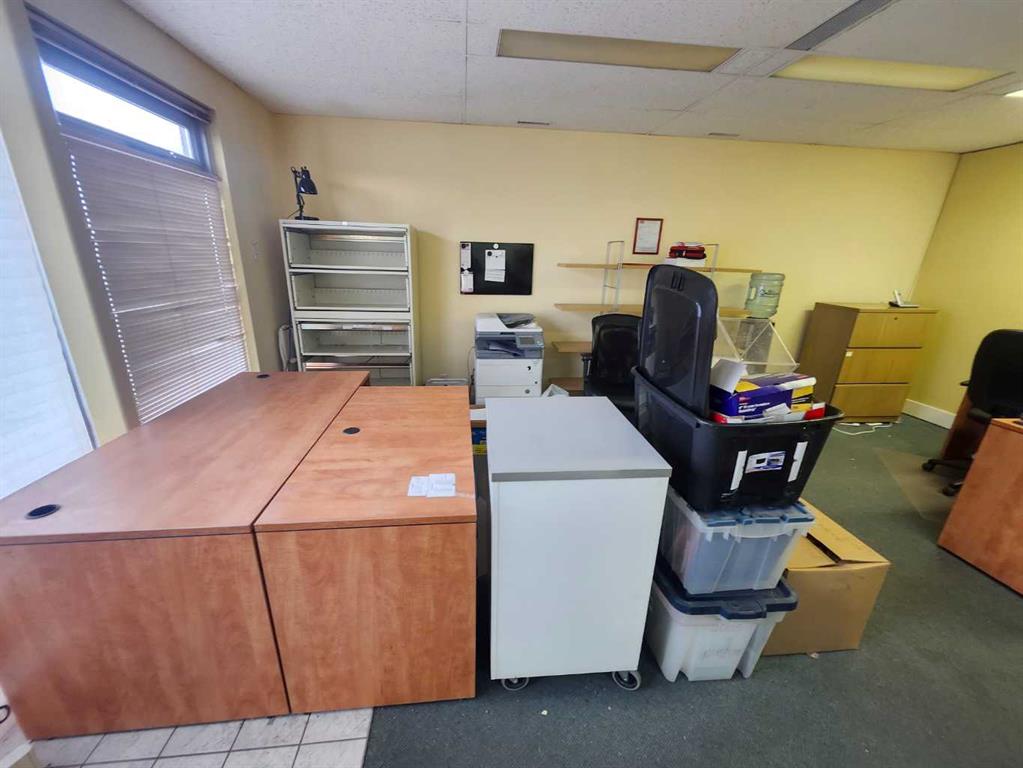 The front of the unit offers two private offices, a welcoming reception and sitting area, and a compact kitchen, creating an efficient and professional environment for staff and visitors. The rear opens into a spacious warehouse/work area with 14 ft ceilings, ideal for equipment, light manufacturing, or additional storage requirements.
