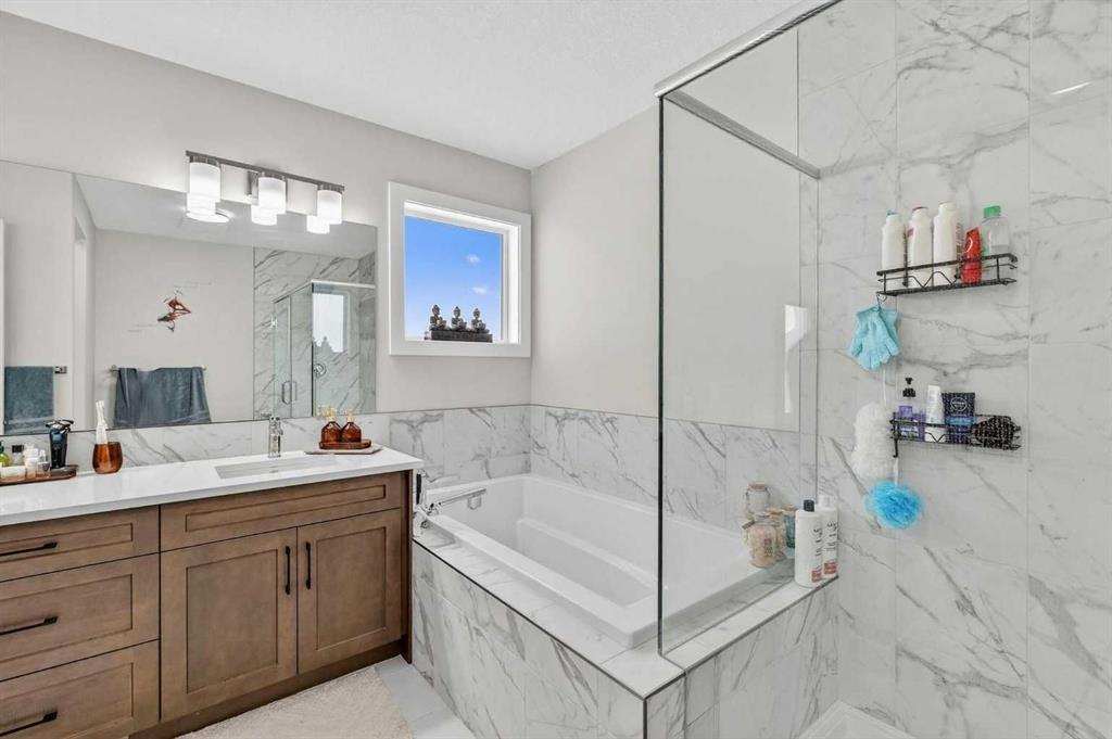The main level features a bright, open-concept layout with modern finishes throughout. The kitchen is a true standout, thoughtfully designed with quartz countertops, a large central island and an abundance of sleek cabinetry. There is a spice kitchen with a gas stove and extra cabinetry, perfect for those who love to cook or entertain. This highly functional setup offers added convenience while keeping the main kitchen clean and open. The dining area flows seamlessly to the upper deck overlooking green space, while the spacious living room offers a comfortable gathering space filled with natural light. A rare MAIN FLOOR BEDROOM AND FULL BATH provide excellent flexibility for guests, extended family, or a home office. Upstairs, the home continues to impress with four generously sized bedrooms and a thoughtfully designed layout. The primary bedroom is a true retreat, featuring large windows, a custom walk-in closet with built-in cabinetry, and a beautifully appointed ensuite with dual sinks, quartz countertops, a deep soaker tub, and a separate glass-enclosed shower. The upper level also includes a full bathroom, convenient upper-floor laundry, and a versatile bonus/flex area that perfect for a family room, study space, or play area. The illegal walkout basement suite is fully self-contained and thoughtfully designed, offering two bedrooms, a modern full kitchen, a comfortable living area, a full bathroom, separate laundry, and a private entrance. Large windows and walkout access ensure the space feels bright and welcoming, making it ideal as a mortgage helper, rental investment, or multi-generational living solution. Additional highlights include a double attached garage, contemporary finishes throughout, and a prime location backing onto green space while remaining close to schools, parks, shopping, and major commuter routes. This is a rare opportunity to own a spacious, income-generating home in one of Calgary’s fastest-growing communities. Don’t miss your chance to see this one today.