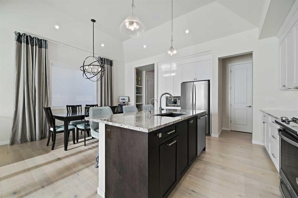 Experience refined living in this luxurious semi-detached villa bungalow, perfectly situated in the prestigious community of Riverstone — just steps from the tranquil Bow River and scenic walking and running paths. From the moment you step inside, you’ll be captivated by the home’s 10-foot ceilings, open-concept design, and abundant natural light that create an atmosphere of effortless elegance. The chef-inspired kitchen is a true showpiece, featuring stainless steel appliances, granite countertops, and an oversized island ideal for both culinary creativity and stylish entertaining. The living room exudes sophistication with its gas fireplace as the focal point and double patio doors leading to a private backyard oasis. The primary suite is a serene retreat complete with a spa-like ensuite featuring a dual vanity, heated floors, water closet, and a beautifully appointed California walk-in closet. Conveniently located off the mudroom/laundry area, a two-piece powder room and double attached garage provide both practicality and ease. Lower level offers exceptional versatility with 2 spacious bedrooms, a full bathroom, and an expansive recreation area perfect for entertaining or relaxing. A dedicated gym, home office, or den adds even more flexibility to suit your lifestyle. Every closet throughout the home is generously sized, offering abundant storage and thoughtful design at every turn. Additional highlights include central air conditioning, professional landscaping, Gemstone exterior lighting, fully finished drywalled garage, underground irrigation, and upgraded dishwasher, washer and dryer. Discover the perfect harmony of comfort, style, and quality craftsmanship in this remarkable Riverstone residence — a home that truly exceeds expectations!