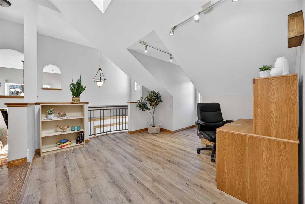 Step inside to a grand, light-filled entryway featuring soaring vaulted ceilings, elegant architectural details while your eyes are drawn to the stunning balconies above that capture the imagination. Arched windows…skylights…layers of Elegance! With rich hardwood floors and a beautiful brick-faced wood-burning Fireplace, the Living room flows seamlessly into the Kitchen and is framed by tranquil views of your expansive treed lot and surrounding wildlife. Windows and Skylights that capture the sunlight and beauty of nature create an ambiance of peaceful living and your own piece of paradise. The Kitchen is finished with gleaming white cabinets trimmed with natural wood. Built in display shelves and desk, a center island, and a corner sink that enjoys the views through two windows to the backyard. Upstairs, the home continues to impress with 3 bedrooms and a lofted, open-to-below design that enhances the sense of space and light. The primary suite is a peaceful retreat featuring vaulted ceilings, a walk-in closet, 4-piece ensuite including a jetted tub and glass shower beautifully designed with a glass block wall to bring in the light with your privacy in mind. This primary suite offers plenty of room to unwind. A bonus area completes this level and would make a perfect office or place for the kids to escape to with a conveniently located laundry room upstairs. The Basement level is fully finished with a 4th bedroom and 4-piece ensuite with heated floors. Family room, flex space and ample storage. This home offers Multiple living areas ideal for families or entertaining. Let’s not forget about the TRIPLE CAR GARAGE, attached, with plenty of room for vehicles, toys, or workshop space. Step out onto the multilevel deck to enjoy and relax for an evening BBQ and morning coffee. Round the corner and step up to the upper levels with a convenient side entry/mudroom access or even hot tub access one day. The backyard has plenty of space to enjoy the natural surroundings. Making memories in your backyard is easy with the firepit, large trees, garden. No need for camping when you can experience it in your yard. This is an opportunity to live the dream, removed from the city, yet still within a short drive to take advantage of the conveniences the City has to offer.
