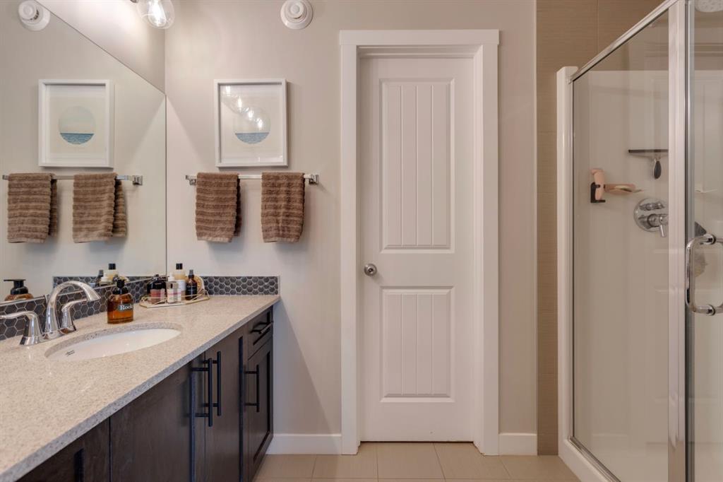 The main level is open, bright and functional — featuring 9 ft ceilings, quartz countertops, upgraded cabinetry, stainless steel appliances and thoughtful layout for both day-to-day living and hosting. Upstairs, the primary suite is a standout: a custom walk-in closet with upgraded shelving and a private ensuite equipped with a double shower head system — a detail rarely found at this price point.