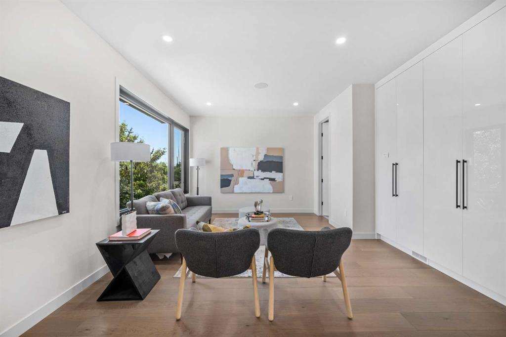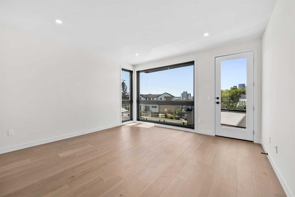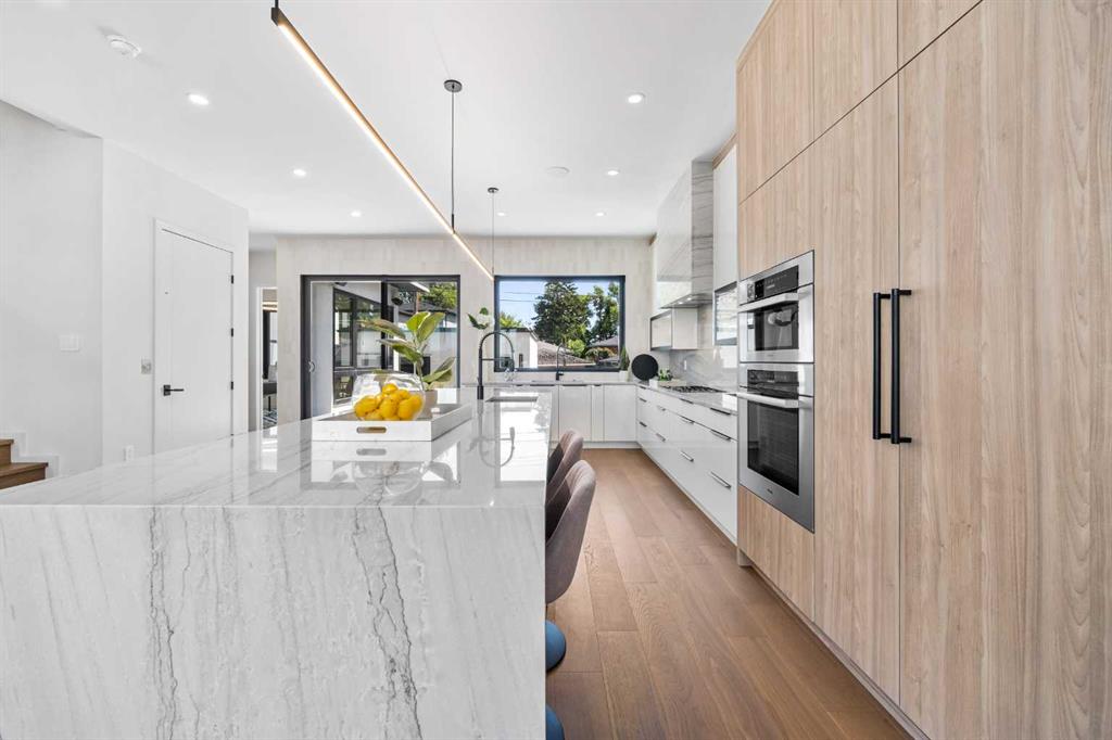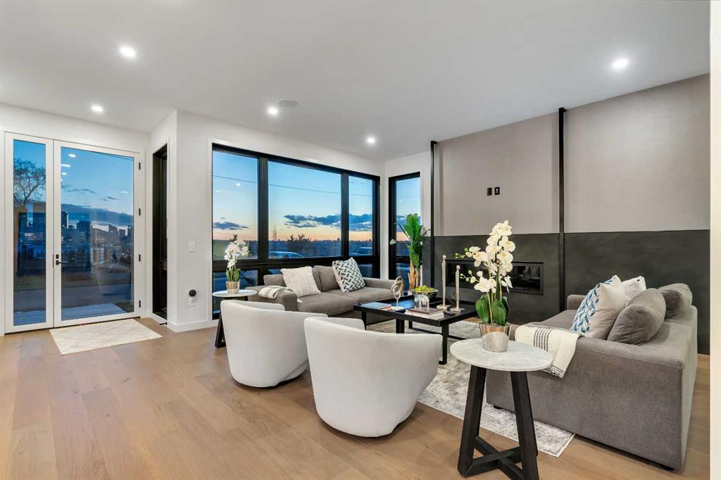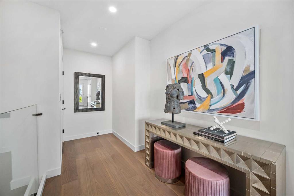An architectural masterpiece by Silverpoint Custom Homes and Paul Lavoie Interior Design. Perched on a spectacular lot overlooking Bridgeland, and offering breathtaking views of the City and Rocky Mountains. A 5,200-square-foot gem, which seamlessly blends Hollywood Hills vibes, in a meticulous and one of a kind design. A fantastic open floor plan with a separate formal living and dining rooms overlooking the city. Boasting a truly magnificent kitchen, featuring a 13ft waterfall island and all MIELE appliances. Hardwood floors weave throughout the four levels including the basement, creating a harmonious atmosphere of seamless design. The main level surprises you with a hidden coat closet, a spacious mudroom, and a private den overlooking a backyard oasis with a large deck, (hot-tub ready) Move effortlessly between levels via the elevator or a captivating floor to ceiling glass-walled staircase leading to three generous bedrooms and a master top suite, simply like no other. The second floor offers 3 spacious bedrooms with panoramic city views from 2 bedrooms, private balconies, and a separate family lounge with access to a full guest bath. A fabulous laundry room and linen closet complete this level, not to mention large picture windows offering fulll sunrise worthy east views. The third-floor PRINCIPAL BEDROOM is a showstopper with a HUGE BALCONY showcasing the best panoramic city and mountain vews. A separate lounge area with coffee bar, fridge and a built in TV LIFT separate the bedroom area. As you enter the ensuite, flooded with natural light, a magical SMARTGLASS window gives you the option of privacy, or to enjoy the fabulous city views while soaking in the tub. A luxurious dual vanity, dual spa shower area surrounded by glass, featuring heated floors and shower bench. The walk-in wardrobe suite is a one of a kind dream space, with built in’s that will rival a designer shop. Large skylights, a huge window and your own washer/dryer, make this the perfect dressing area. The lower level caters to the extended family and features a media area with full bar, gym, and a large bedroom. A full bath including a steam shower completes this level with all heated hardwood flooring. The outdoor spaces surrounding the house lets you indulge in extended year round outdoor living. A large front patio with a fire pit option, and seating lets you indulge in the west city and mountain views. The rear yard offers you a great dining space, and private relaxation areas with an optional hot tub, and a multi purpose sports area or green space. This home as expected includes all Smart home features, an elevator, extensive internal glass walls, AC, infloor heat, and an oversized garage with a full third car garage option which can be built prior to possession for the buyer at cost. An amazingly unique home with modern, yet classic design elements, encompassing every luxury option a discerning home owner would desire in their dream home.