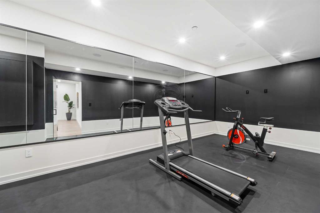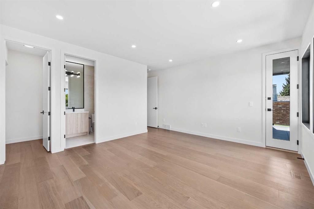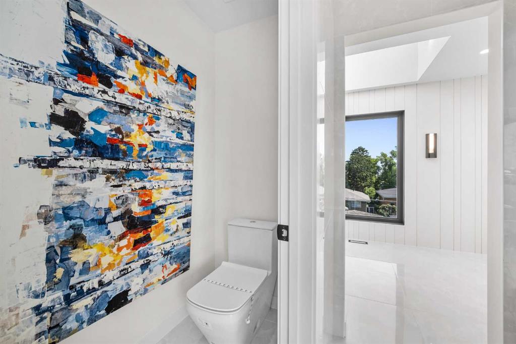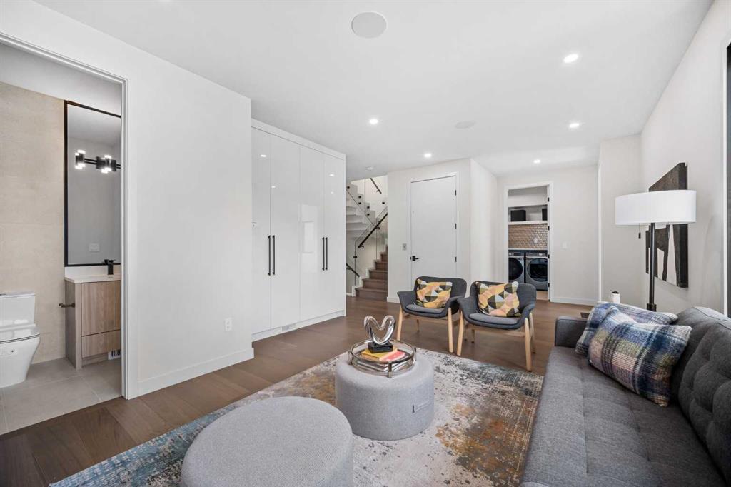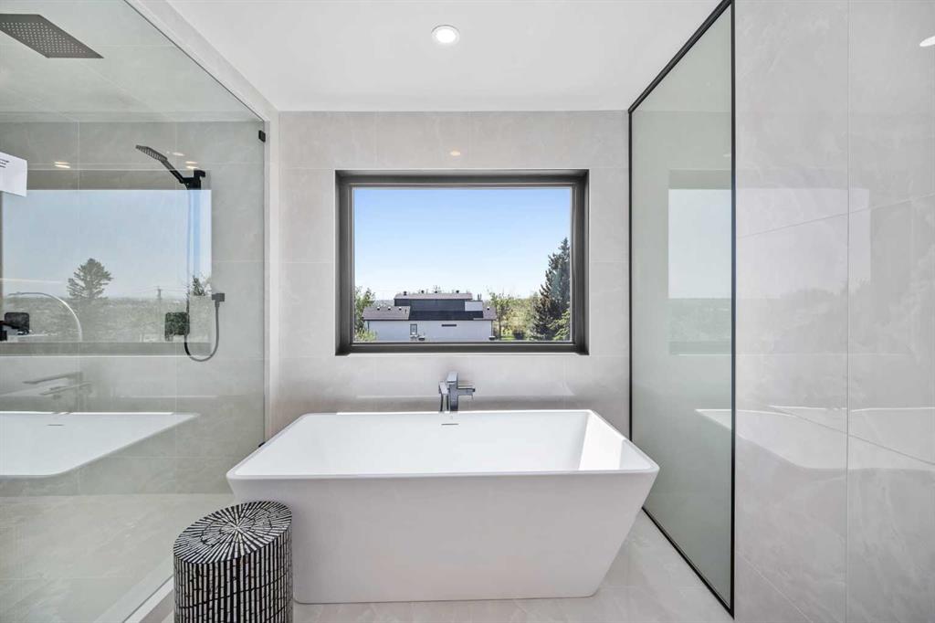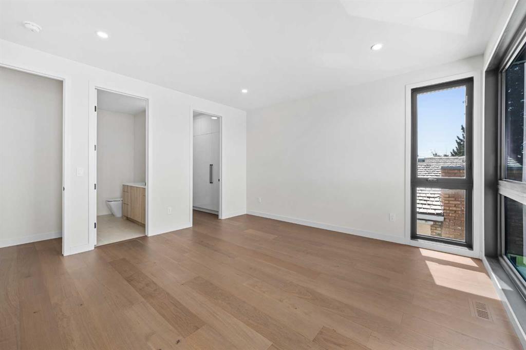An architectural masterpiece by Silverpoint Custom Homes and Paul Lavoie Interior Design. Perched on a spectacular lot overlooking Bridgeland, and offering breathtaking views of the City and Rocky Mountains. A 5,200-square-foot gem, which seamlessly blends Hollywood Hills vibes, in a meticulous and one of a kind design. A fantastic open floor plan with a separate formal living and dining rooms overlooking the city. Boasting a truly magnificent kitchen, featuring a 13ft waterfall island and all MIELE appliances. Hardwood floors weave throughout the four levels including the basement, creating a harmonious atmosphere of seamless design. The main level surprises you with a hidden coat closet, a spacious mudroom, and a private den overlooking a backyard oasis with a large deck, (hot-tub ready) Move effortlessly between levels via the elevator or a captivating floor to ceiling glass-walled staircase leading to three generous bedrooms and a master top suite, simply like no other. The second floor offers 3 spacious bedrooms with panoramic city views from 2 bedrooms, private balconies, and a separate family lounge with access to a full guest bath. A fabulous laundry room and linen closet complete this level, not to mention large picture windows offering fulll sunrise worthy east views. The third-floor PRINCIPAL BEDROOM is a showstopper with a HUGE BALCONY showcasing the best panoramic city and mountain vews. A separate lounge area with coffee bar, fridge and a built in TV LIFT separate the bedroom area. As you enter the ensuite, flooded with natural light, a magical SMARTGLASS window gives you the option of privacy, or to enjoy the fabulous city views while soaking in the tub. A luxurious dual vanity, dual spa shower area surrounded by glass, featuring heated floors and shower bench. The walk-in wardrobe suite is a one of a kind dream space, with built in’s that will rival a designer shop. Large skylights, a huge window and your own washer/dryer, make this the perfect dressing area. The lower level caters to the extended family and features a media area with full bar, gym, and a large bedroom. A full bath including a steam shower completes this level with all heated hardwood flooring. The outdoor spaces surrounding the house lets you indulge in extended year round outdoor living. A large front patio with a fire pit option, and seating lets you indulge in the west city and mountain views. The rear yard offers you a great dining space, and private relaxation areas with an optional hot tub, and a multi purpose sports area or green space. This home as expected includes all Smart home features, an elevator, extensive internal glass walls, AC, infloor heat, and an oversized garage with a full third car garage option which can be built prior to possession for the buyer at cost. An amazingly unique home with modern, yet classic design elements, encompassing every luxury option a discerning home owner would desire in their dream home.