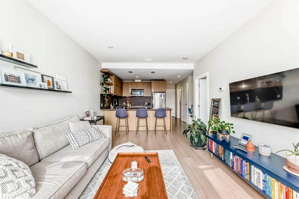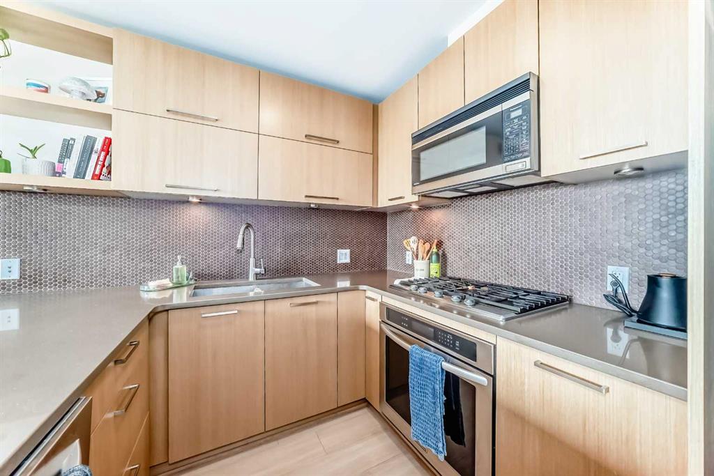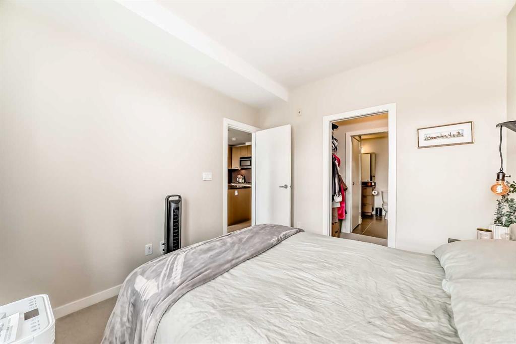 This well-maintained 1-bedroom apartment offers a bright, open, and functional layout designed for modern living. The gourmet kitchen features stainless steel appliances including a built-in oven and gas cooktop, quartz countertops, under-cabinet lighting, a sleek backsplash, and ample cabinetry with a large pantry. The living area boasts 9’ ceilings and floor-to-ceiling windows that fill the space with natural light and capture city views. The spacious queen-size bedroom includes a walk-through closet leading to the ensuite. Enjoy your private east-facing balcony with a BBQ gas hookup overlooking a quiet street. Building amenities include two fitness centers, a bike storage room, car wash bay, dog wash station, visitor parking, and a beautifully landscaped courtyard with seating areas. This unit comes complete with a titled underground parking stall, an assigned storage locker, in-suite laundry, and extra storage space. Located within walking distance to restaurants, cafés, shops, the downtown core, public transit, and river pathways—this home is perfect for professionals seeking a convenient urban lifestyle!