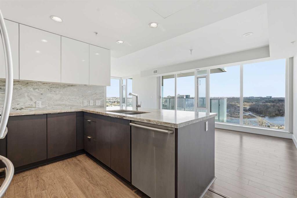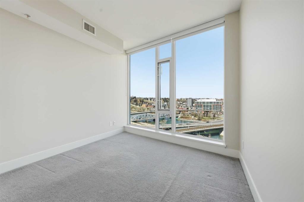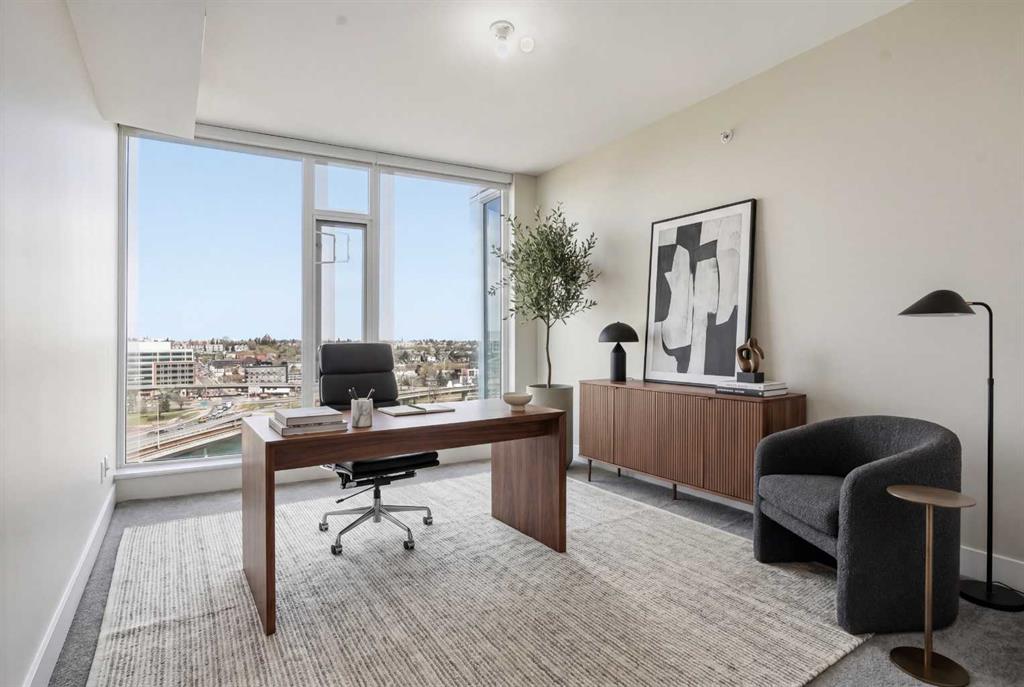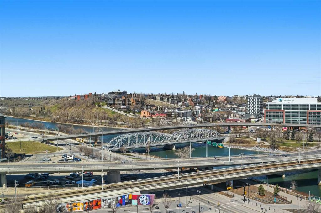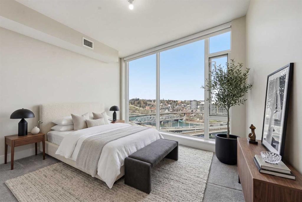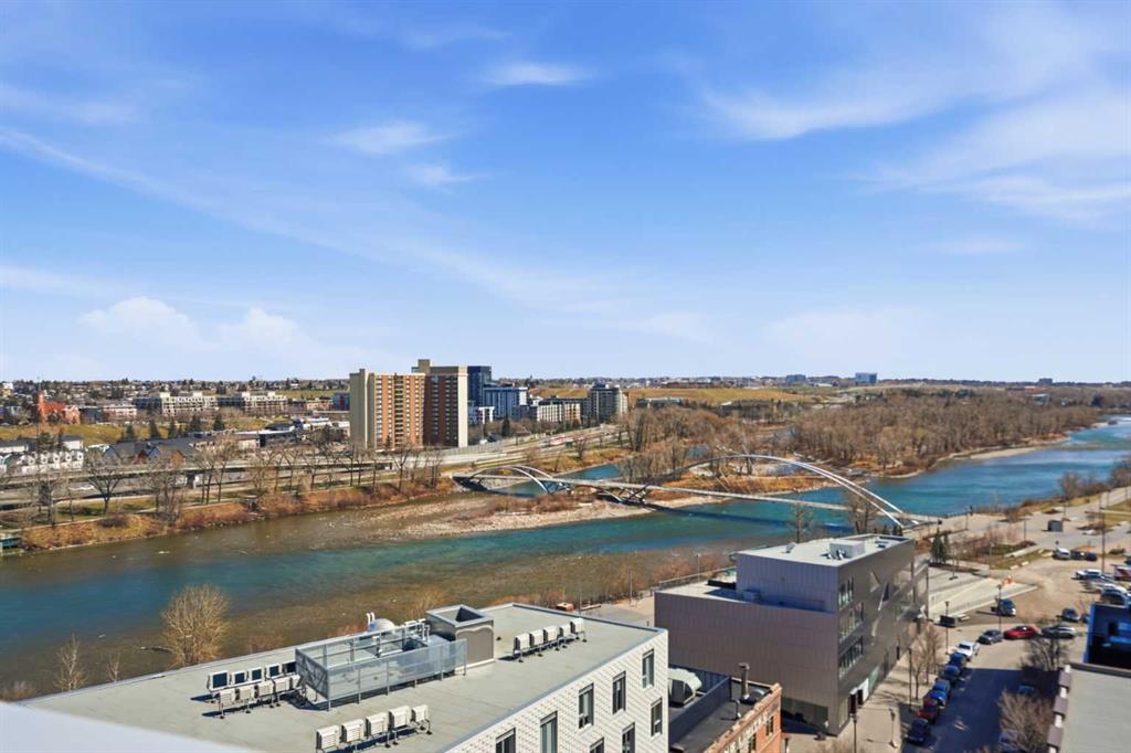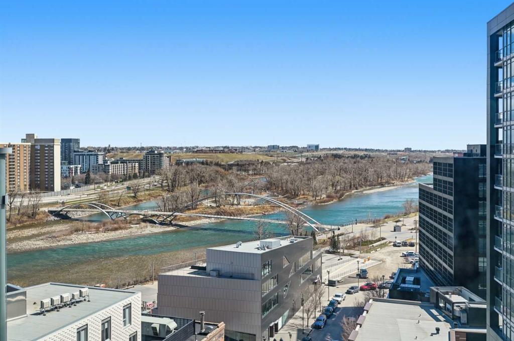 Welcome to Evolution in Calgary’s vibrant East Village. This well-appointed 2 bed, 2 bath + den unit which offers 1,097 sq. ft. of thoughtfully designed living space, featuring unobstructed NE river views from the 12th floor. Enjoy modern concrete construction, floor-to-ceiling windows, and a bright, open-concept layout that balances downtown convenience without compromising on space. The home showcases 2 spacious bedrooms, including a primary retreat with dual vanities and a luxurious glass shower and deep soaker tub. The versatile den is perfect for a home office or additional storage. Indoor and outdoor living spaces are ideal for entertaining, complemented by ample in-suite storage and laundry. Additional highlights include secure underground tandem parking, separate storage locker, and full building concierge services. Residents enjoy premium amenities such as a fitness centre, sauna/steam room, owners’ lounge, and a landscaped courtyard with BBQs. Located just steps from the Bow River pathway system, cafés, shops, the Central Library, Studio Bell, and downtown, this home offers the best of urban living in one of Calgary’s most walkable and sought-after communities.