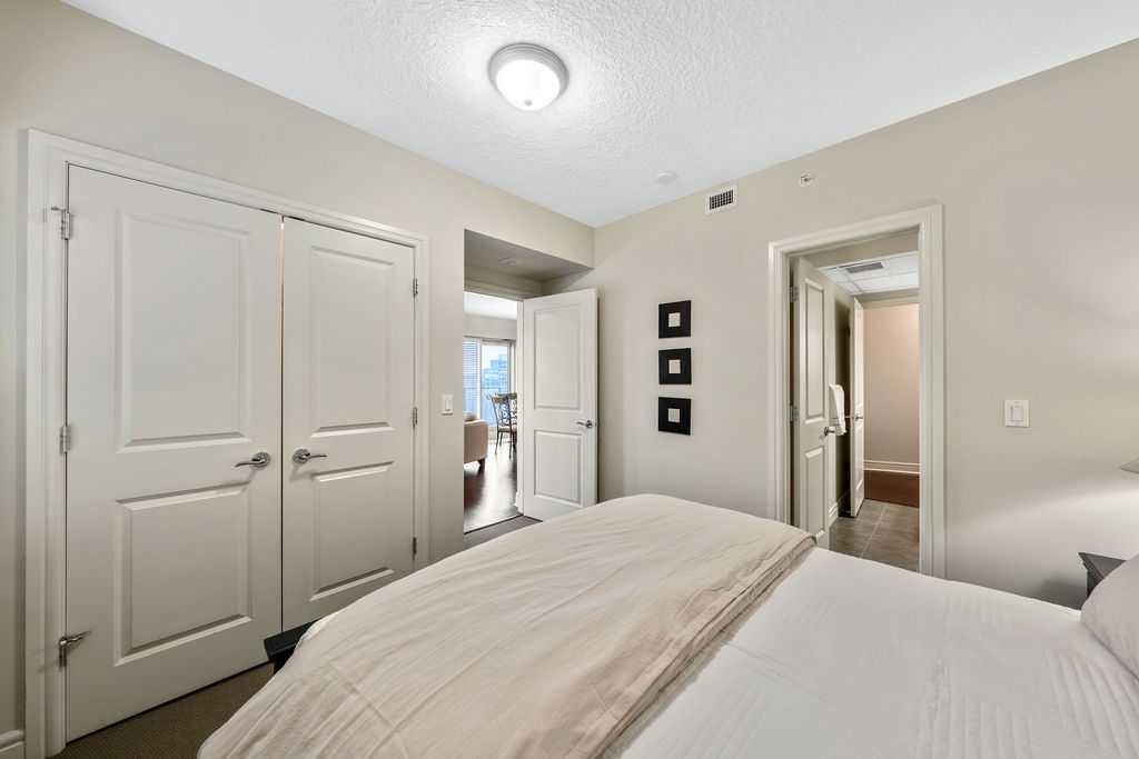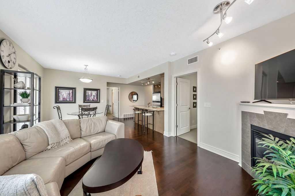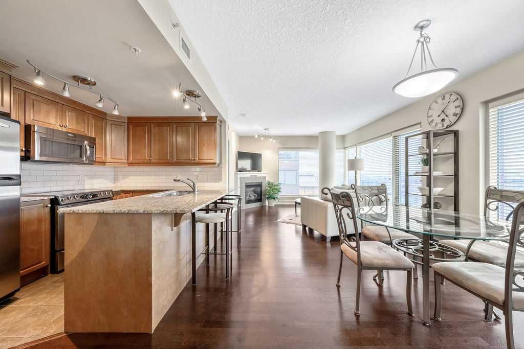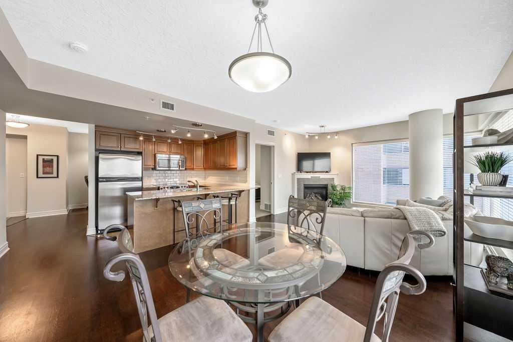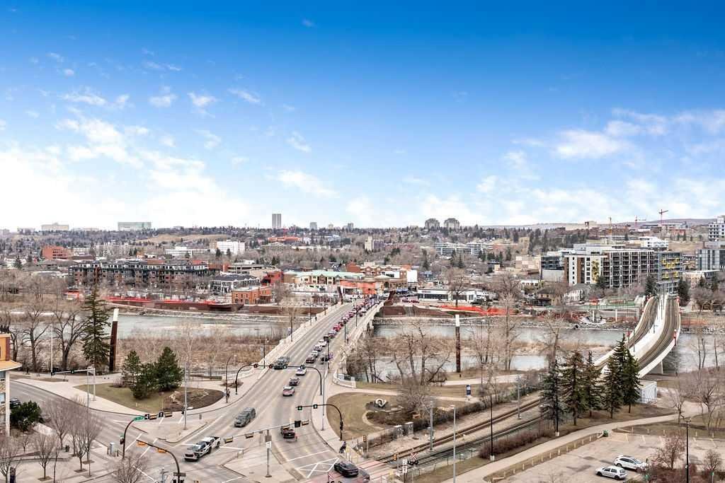 Wake up to sweeping river and city views—this is downtown living at its most effortless. Perched on the 12th floor of Five West Phase I, this newly-painted IMMACULATE fully furnished executive condo offers a rare blend of comfort, convenience, and iconic north & west-facing vistas stretching from the Bow River and Peace Bridge to Kensington and COP – and beyond. Designed with both style and function in mind, the open-concept layout is framed by floor-to-ceiling windows, allowing natural light to pour through the space while showcasing the surrounding cityscape. Engineered hardwood flooring adds warmth and continuity throughout the main living areas. Step outside to your private balcony, complete with a natural gas line for BBQ, where the views become part of your everyday routine. Morning coffee, evening sunsets, and the energy of the city below all come together in this inviting outdoor extension of the home. The kitchen and living areas flow seamlessly, ideal for entertaining or relaxed day-to-day living, while the primary bedroom offers a quiet, comfortable retreat. A versatile second bedroom or office provides flexibility for guests or work-from-home needs. Additional features include titled, heated underground parking and a separate storage locker, along with the ease of a fully furnished, move-in-ready offering. Five West Phase I delivers a true lock-and-leave lifestyle with concierge service, a resident lounge, and an outdoor terrace. Just steps to the Bow River pathways, Prince’s Island Park, top-tier dining, shopping, and transit, this is a location that connects you to the very best of the city. A polished and sophisticated offering for those seeking elevated urban living with unmatched convenience and views.