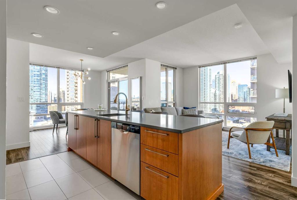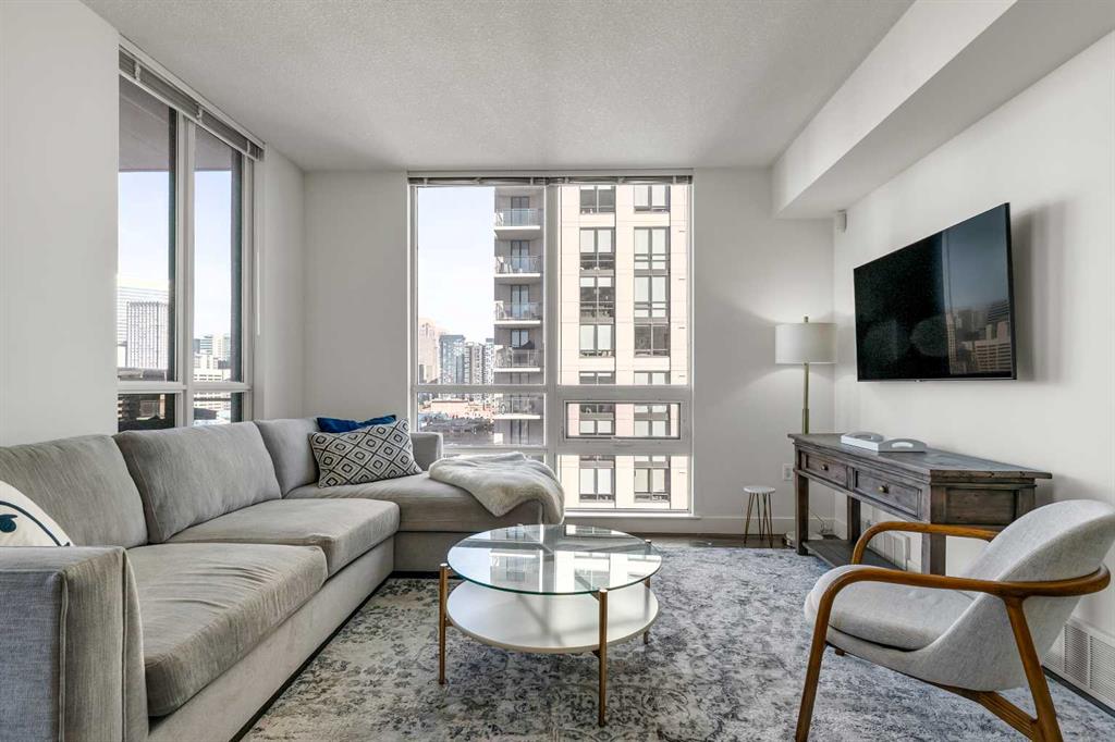 Impeccably designed and move-in ready, this stunning END UNIT in the heart of the BELTLINE offers a rare opportunity to purchase a FULLY FURNISHED home showcasing high-end pieces from POTTERY BARN and WEST ELM. Every item inside is included, creating a seamless, stylish, and effortless transition for the new owner. Expansive FLOOR-TO-CEILING WINDOWS frame sweeping CITY VIEWS, filling the open-concept living space with natural light. A PRIVATE FOYER introduces the thoughtfully designed layout, where the living room separates both bedrooms for OPTIMAL PRIVACY. The spacious living area invites relaxation with contemporary furnishings, while the dining room opens through patio sliders to a COVERED BALCONY, perfect for indoor-outdoor entertaining. A GALLEY-STYLE KITCHEN features FULL-HEIGHT CABINETRY, QUARTZ COUNTERTOPS, STAINLESS STEEL APPLIANCES, and a LARGE ISLAND with an EATING BAR that comfortably seats four. The PRIMARY BEDROOM offers a true retreat with a WALK-THROUGH CLOSET leading to a luxurious 5-PIECE ENSUITE complete with DUAL VANITY, STAND-UP SHOWER, and SOAKER TUB. A SECOND BEDROOM with DUAL CLOSETS connects to a 3-PIECE ENSUITE that doubles as a guest bath. Enjoy the convenience of IN-SUITE LAUNDRY, NEW WASHER & DRYER, and an oversized TITLED PARKING STALL located on P-1 (STALL #53). A separate ASSIGNED STORAGE LOCKER provides additional space for seasonal items. Step outside to a COVERED BALCONY with included PATIO FURNITURE and BBQ, all overlooking Calgary’s ever-evolving skyline. Building AMENITIES elevate daily life with a FULL-TIME CONCIERGE, FITNESS CENTRE with STEAM ROOM, PARTY ROOM/OWNERS LOUNGE, LANDSCAPED COURTYARD, RENTABLE GUEST SUITE, VISITOR PARKING, and SECURE BICYCLE STORAGE. Ideal for professionals, investors, or those seeking a low-maintenance urban lifestyle, this residence combines design sophistication with everyday functionality in one of Calgary’s most vibrant downtown communities.