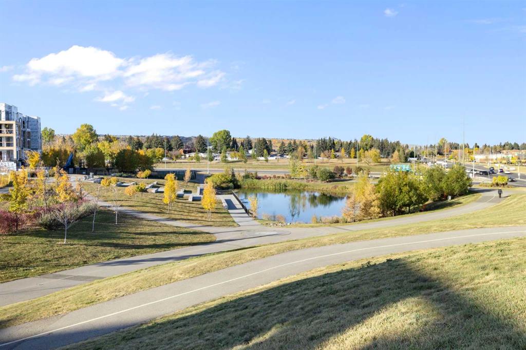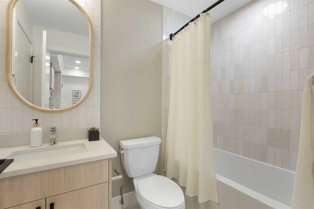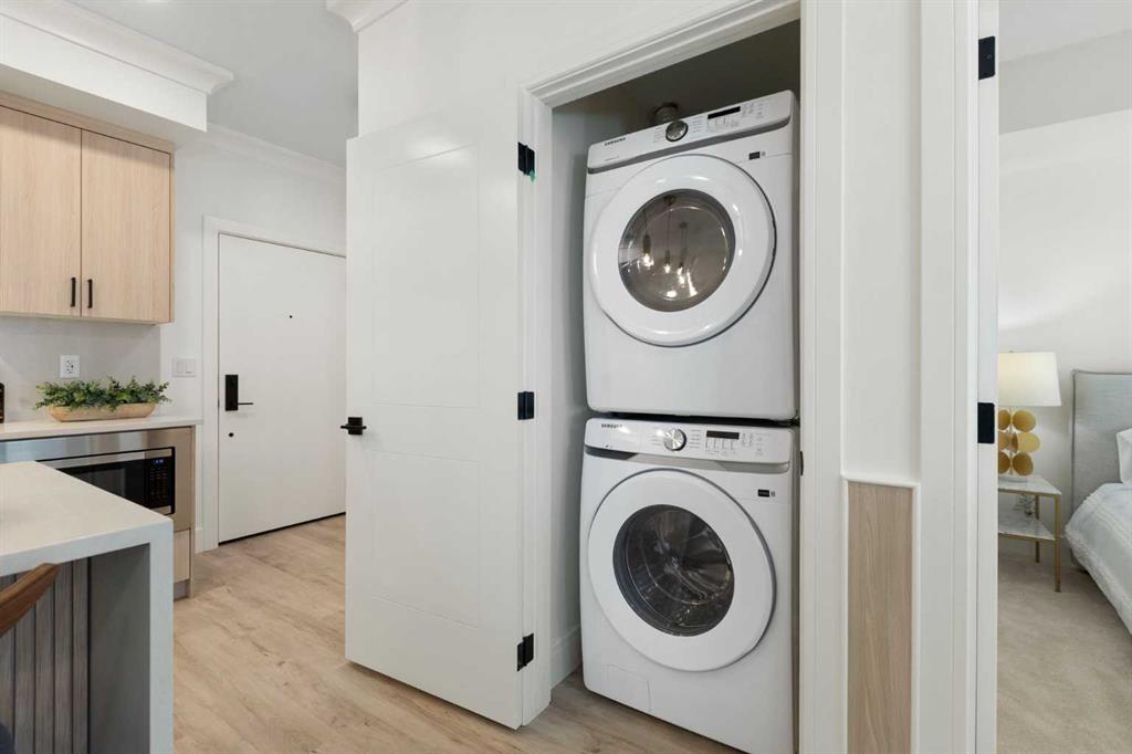 Be the very first to call this pristine, never-lived-in home your own—a sun-filled, modern retreat where every detail feels fresh, flawless, and intentionally designed for the way you live. From the moment you step inside, the open layout draws you in, anchored by a showpiece kitchen where a sleek quartz waterfall island meets premium stainless steel appliances (notice the cabinet front dishwasher and fridge!), an upgraded hood fan, and an oversized sink that makes both cooking and hosting effortless. Natural light pours through oversized windows into both the bedroom and living room, creating a warm, airy atmosphere. Your spacious bedroom easily accommodates a queen bed with nightstands. The bathroom echoes the home’s elevated design with quartz countertops and high-quality fixtures including upgraded tile from the tub to the ceiling, upgraded black rainfall shower head w/ wand & the tile backsplash spans the height of the wall above the beautiful vanity w/ quartz counters! Step outside to your private second-floor balcony—perfect for morning coffee, summer BBQs, or winding down with your favourite beverage as the sun sets. Comfort is elevated with central air conditioning, in-suite laundry, and a titled underground parking stall, plus visitor parking and secure bicycle storage for added convenience. Set within Dean’s Landing in Calgary’s sought-after University District, you’re surrounded by a vibrant, walkable community where trendy cafés, restaurants, and everyday conveniences are just steps from your door. Enjoy easy access to green spaces, bike paths, the University of Calgary, Foothills Medical Centre, and downtown—blending urban energy with neighborhood charm. This unit won’t last long! Call your favourite realtor today to book a private viewing of this beautiful condo.