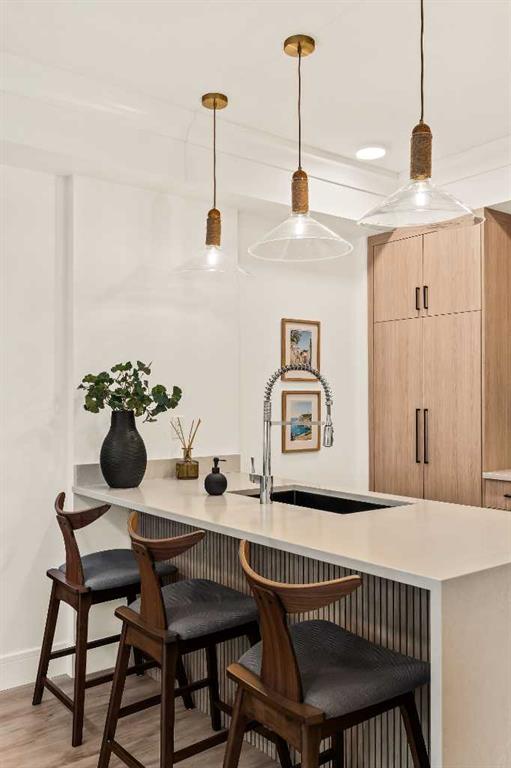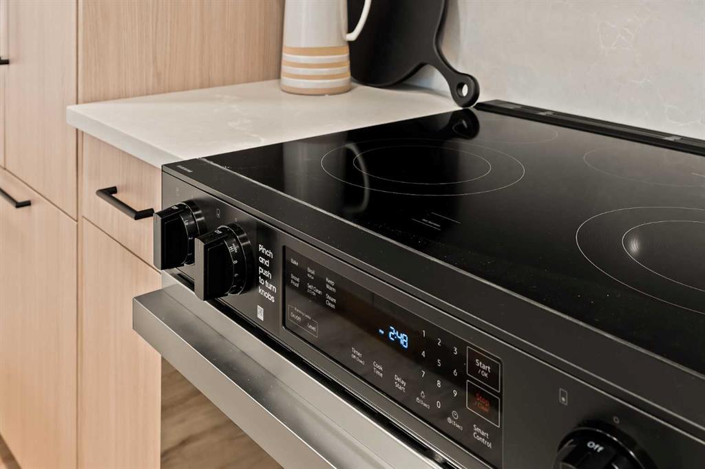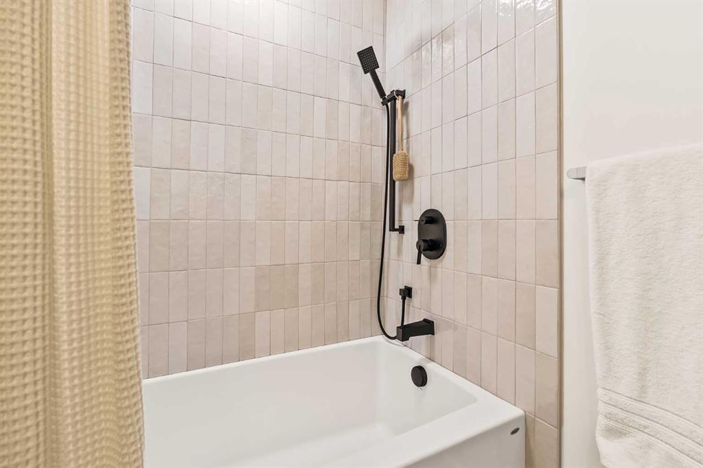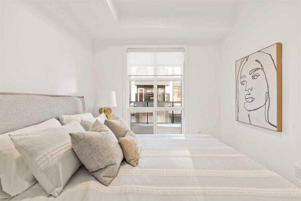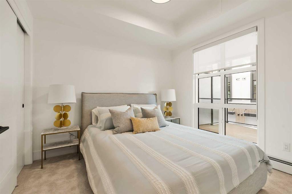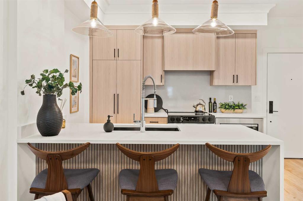 Exceptional value is offered with this brand new property that features nearly 500 square feet of living space and is situated in the central and amenity-rich community of the University District. This 1 bedroom, 1 bathroom condo features low condo fees, offering the perfect opportunity for first-time buyers, investors, or downsizers looking for maintenance-free living. Resilient luxury vinyl plank flooring greets you as you enter the home and flows throughout the main living area. This home offers an open-concept layout with 10-foot ceilings and large South-facing windows that flood the space with natural light throughout the day. The stunning kitchen features quartz countertops, a large peninsula with a waterfall edge and breakfast bar for additional seating, a built-in microwave, and an integrated refrigerator, dishwasher, and range hood, creating a clean and minimalist aesthetic. The kitchen overlooks the living and dining areas – making this the perfect space for entertaining friends and family. The spacious bedroom offers plush carpet underfoot, a double closet, and a large South-facing window. The 4-piece bathroom features a large vanity, a deep bathtub, subway tile backsplash throughout, a linen closet, and ceramic tile flooring. Step outside onto your oversized 178 square foot covered balcony that offers plenty of room for patio furniture, a barbecue, and even garden boxes for those with a green thumb. Additional features that round out this unit include air conditioning, in-unit laundry, and secure underground parking to keep your vehicle safe and out of the elements. This well-managed building offers secure bike storage, an EV vehicle charger, and visitor parking for your guests. Centrally located in the heart of the University District, this property offers the perfect walkable location and is only a short walk to nearby cafes, restaurants, shopping, entertainment, green space, the University of Calgary, Alberta Children’s Hospital, and Market Mall. Within only a 5-minute walk you have top restaurants like OEB Breakfast Co., UNA Pizza + Wine, Native Tongues, and The Banquet. Daily commuting is easy with nearby public transit stops and quick driving access to Shaganappi Trail and 16th Avenue. This property offers the best value in the Dean’s Landing development based on it’s size and price point so don’t miss out on this incredible opportunity!