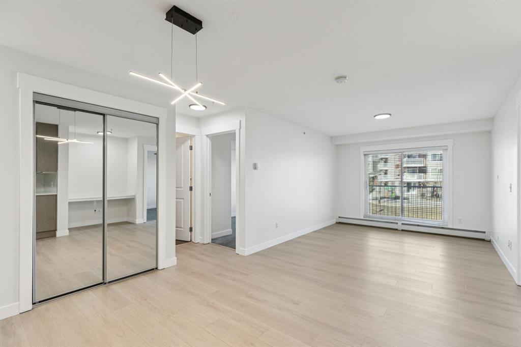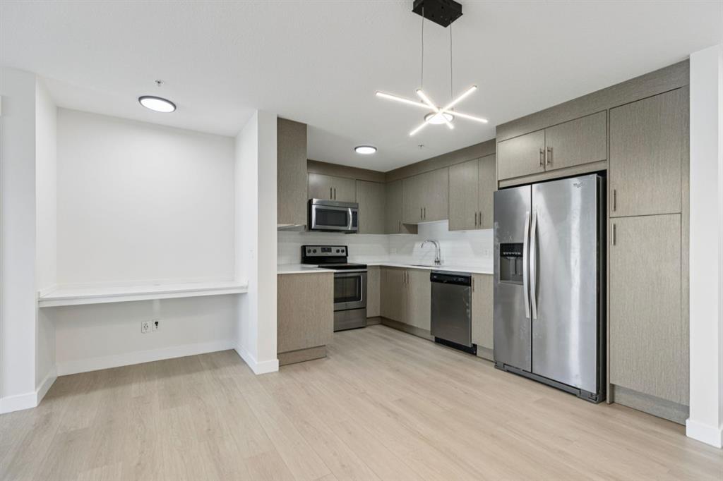 The kitchen features durable quartz countertops and stainless steel appliances, with ample storage and counter space for culinary creations. The open floor plan seamlessly connects the kitchen and living room, offering plenty of space for a dining table and ideal for entertaining. A built-in desk provides convenience for work-from-home needs or a cozy reading nook. The primary bedroom serves as a retreat, lots of natural light fills the room from the large window framing park views, while his/ her closets and 4-piece ensuite enhance privacy and comfort. The versatile second bedroom also enjoys a park view, making it perfect for children, guests or a home family room with its own large closet for added storage.