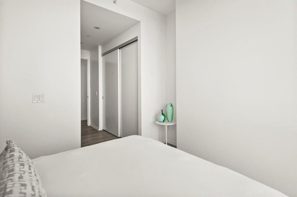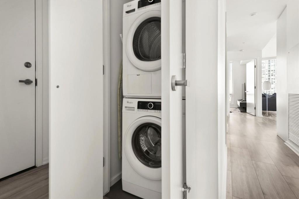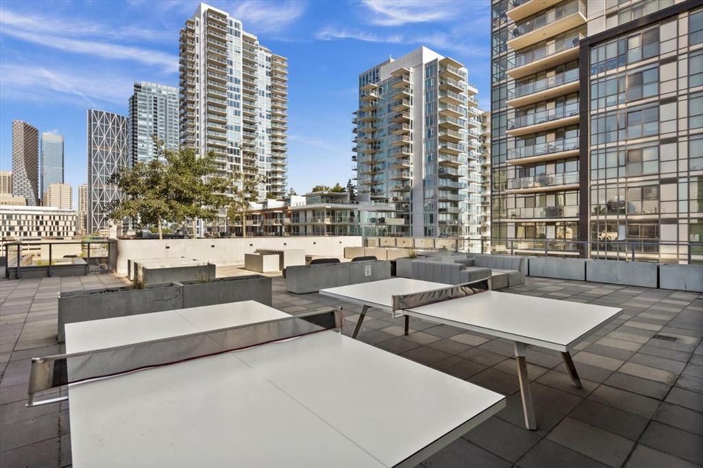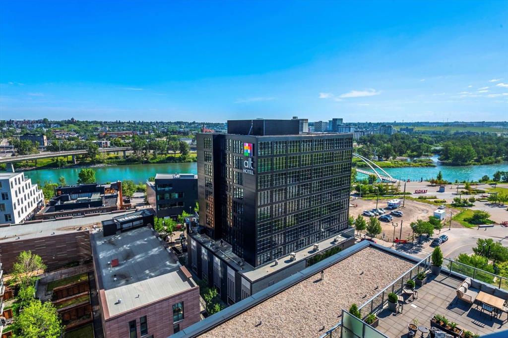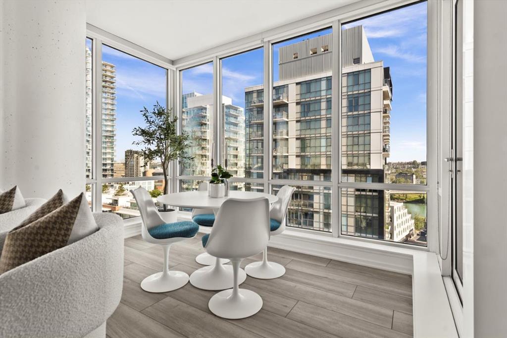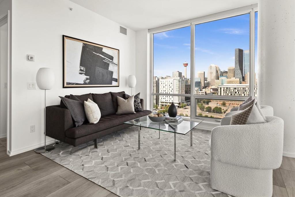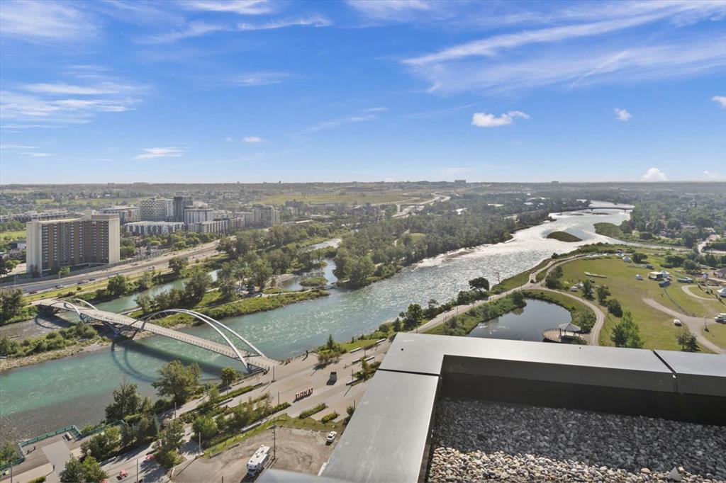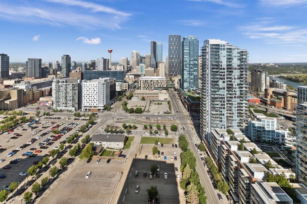 Are you looking for a bright 2 bedroom, 2 bathroom corner condo in Verve? What about one that has gorgeous views of both downtown and the Bow River through floor-to-ceiling windows. This home features 2 bedrooms, den, 2 full bathrooms, and a patio ideal for entertaining or relaxing. Inside, the open-concept layout is great for hosting all your friends for wine. The modern kitchen is equipped with built-in appliances and a spacious island that’s perfect for meal prep or casual dining. The living and dining areas are placed to maximize natural light and panoramic views, while the den adds versatility to suit your lifestyle. The primary suite is a river view retreat with a contemporary ensuite featuring a glass-enclosed walk-in shower. The second bedroom with views of DT with convenient access to the second full bathroom, complete with a deep soaker tub — perfect for unwinding after a long day. Throughout the unit, built-ins offer smart storage solutions, maintaining a clean and refined aesthetic. 9-foot ceilings enhance the sense of space and light throughout. Verve residents enjoy an exceptional amenities, including a fitness centre and party room on the 6th floor, a rooftop observation lounge and deck on the 25th floor, a guest suite, and the convenience of a full-time concierge. This unit also includes a titled underground parking stall and a separate storage locker for added functionality. Located in Calgary’s vibrant East Village, you’re surrounded by some of the city’s best dining, shopping, and entertainment. Enjoy immediate access to scenic river pathways, green spaces, a dog park, playground, and pickleball court. Just a short walk to the C-Train and countless urban amenities, this is truly one of Calgary’s most desirable and walkable communities. Schedule a private viewing before She Gon’!