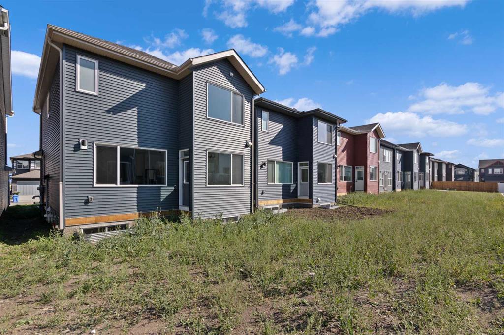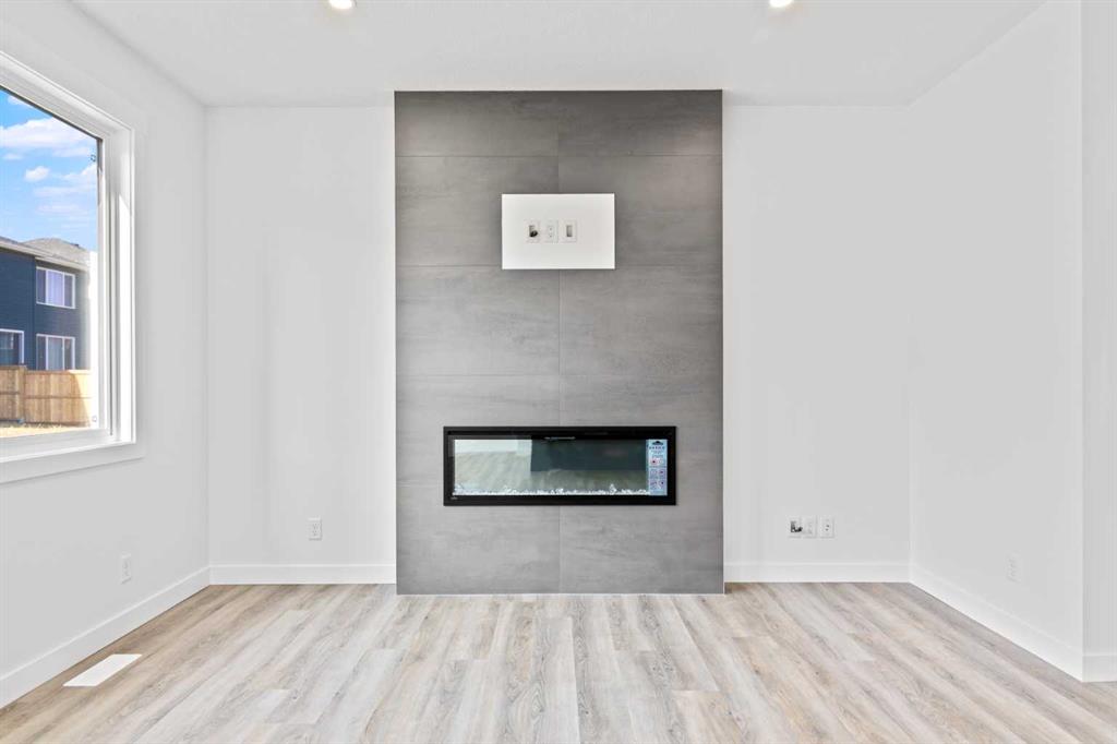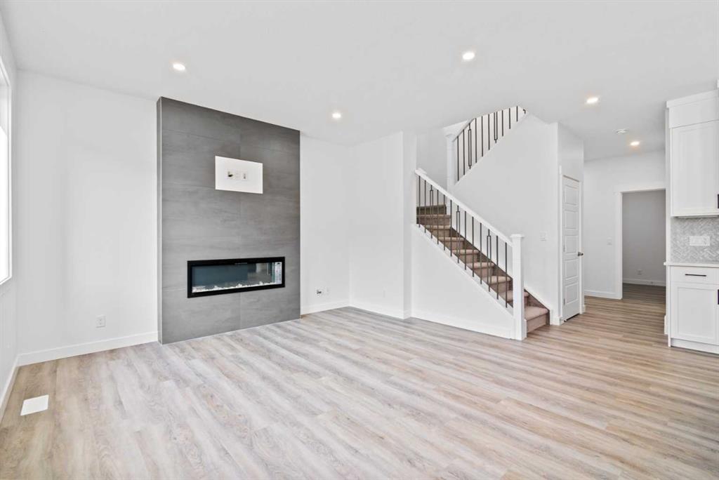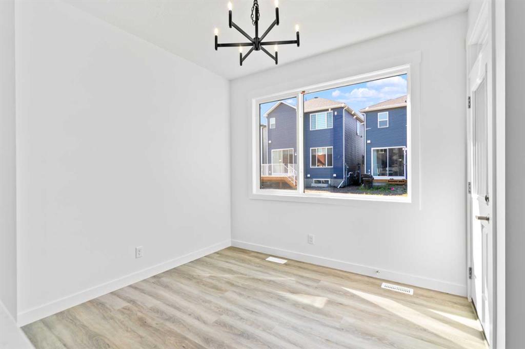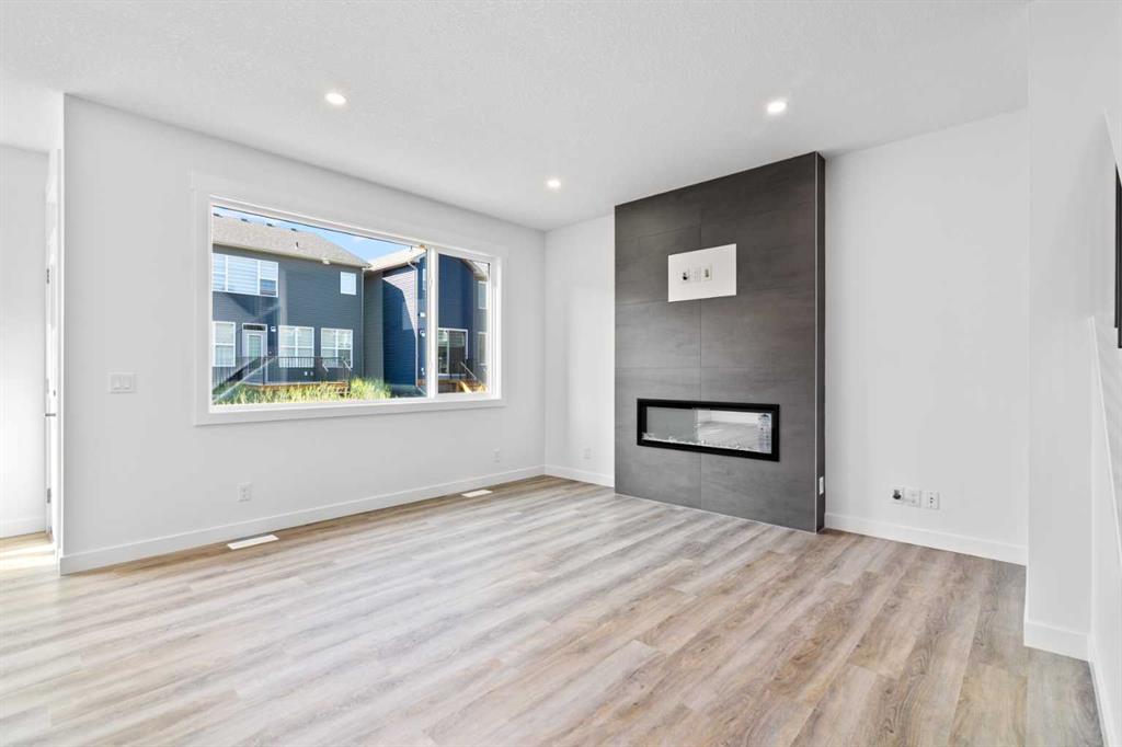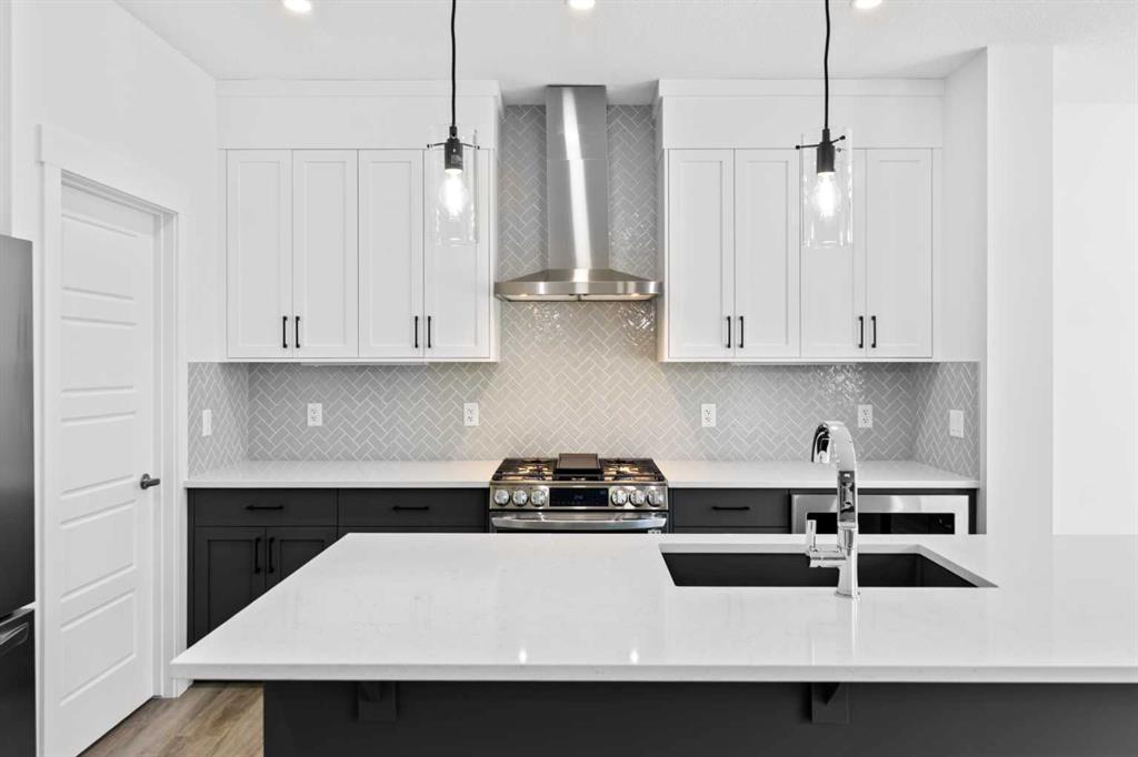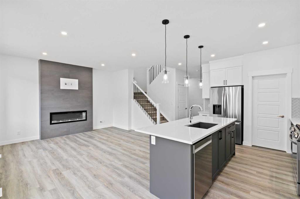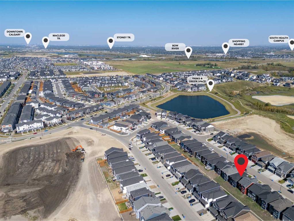 The main floor impresses with 9-foot ceilings, an open-concept upgraded kitchen featuring Level 2 cabinets to the ceiling, a chimney hood fan, built-in microwave, gas range, fridge with water & ice dispenser, and convenient garbage/recycling pullouts. Gather in the spacious living area with a sleek electric fireplace, while oversized triple pane windows fill the home with natural light. Main to upstairs, boasts stylish open railings lead to the private family spaces. With four bedrooms total, there’s room for everyone. The home also includes a 9-foot foundation basement for future development and a separate side entrance, offering potential for a suite (subject to city approval). This is a brand new, never-lived-in 2025 construction, ready for you to make it your own. Located in the beautiful community of Pine Creek, you’ll enjoy a family-friendly atmosphere surrounded by nature with easy access to Calgary’s southwest amenities. Don’t miss your chance to own a move-in ready new build loaded with upgrades!