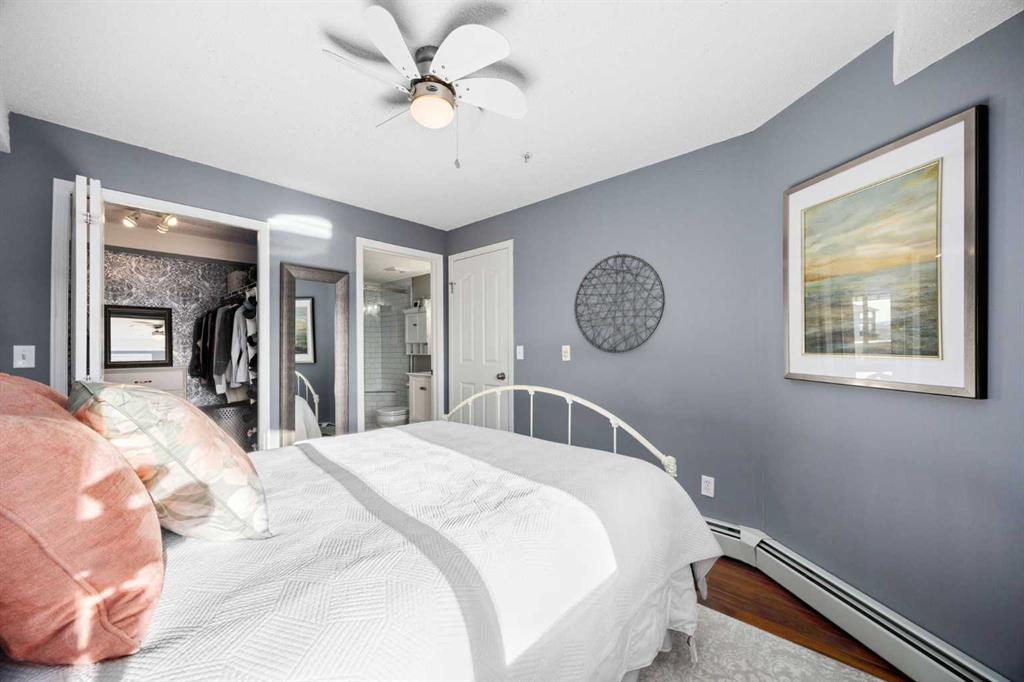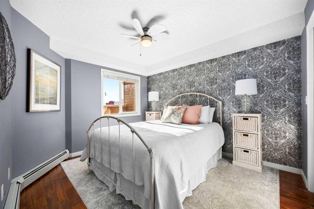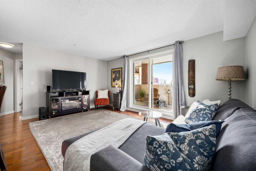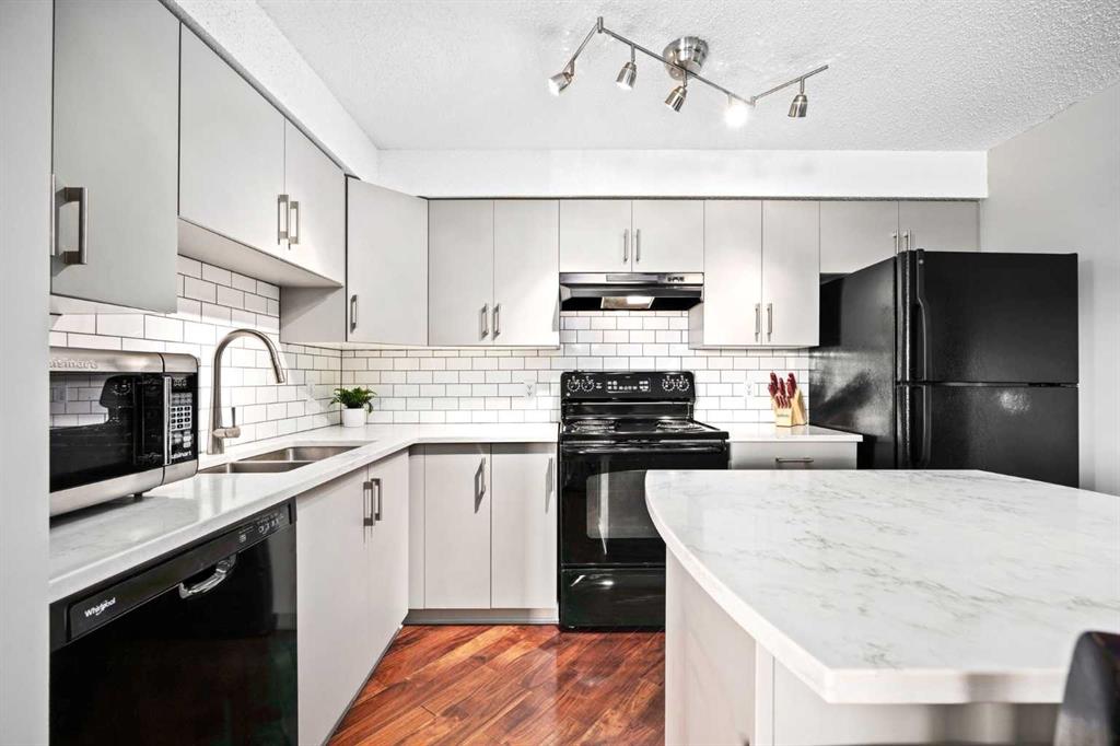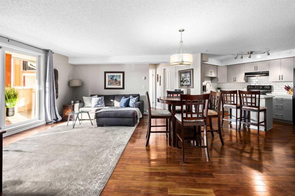 Welcome to one of the largest and most desirable units in this centrally located downtown Cochrane complex! This beautifully maintained 2 bedroom, 2 bathroom condo offers an exceptional open concept layout with stunning hardwood flooring and a bright, functional living space perfect for both everyday living and entertaining. The updated kitchen features quartz countertops, modern finishes, and a brand new dishwasher, flowing seamlessly into the spacious dining and living areas.