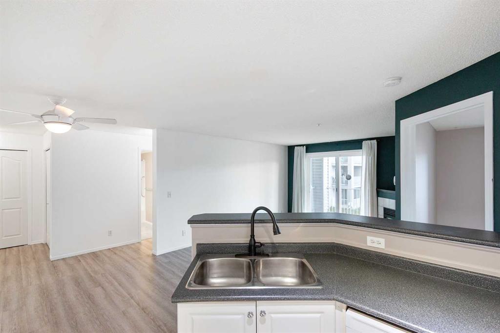 This exceptionally clean condo offers a welcoming layout from the moment you step inside. The entry opens into a spacious, open-concept living room featuring a cozy fireplace and direct access to the balcony, perfect for relaxing. The modern kitchen is bright and functional, complete with white cabinetry, roll-out drawers, generous counter space, and tile flooring. It connects easily to the dining area, which comfortably fits a dining table. The primary bedroom is a great size and includes a walk-in closet and private ensuite. The second bedroom works well for guests, family, or a home office. The main bathroom includes an accessible walk-in style tub/shower conversion designed for ease and safety. Tile flooring runs through the kitchen and bathrooms, with vinyl plank flooring throughout the rest of the home for a clean, updated look. A full laundry room adds everyday convenience, equipped with a full-size washer and dryer plus ample storage. Recent updates include newer windows and a newer patio door, and the assigned parking stall is located right at the front entrance for quick access. Set in the heart of Airdrie, this condo is close to shops, pathways, and parks giving you a comfortable low-maintenance living in a prime area of the city.
