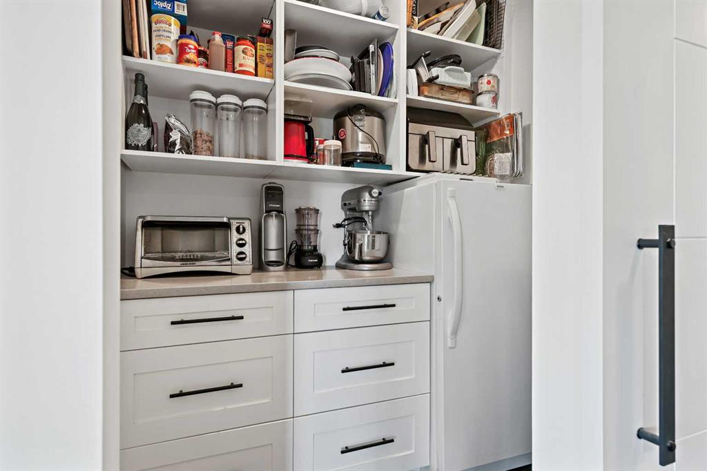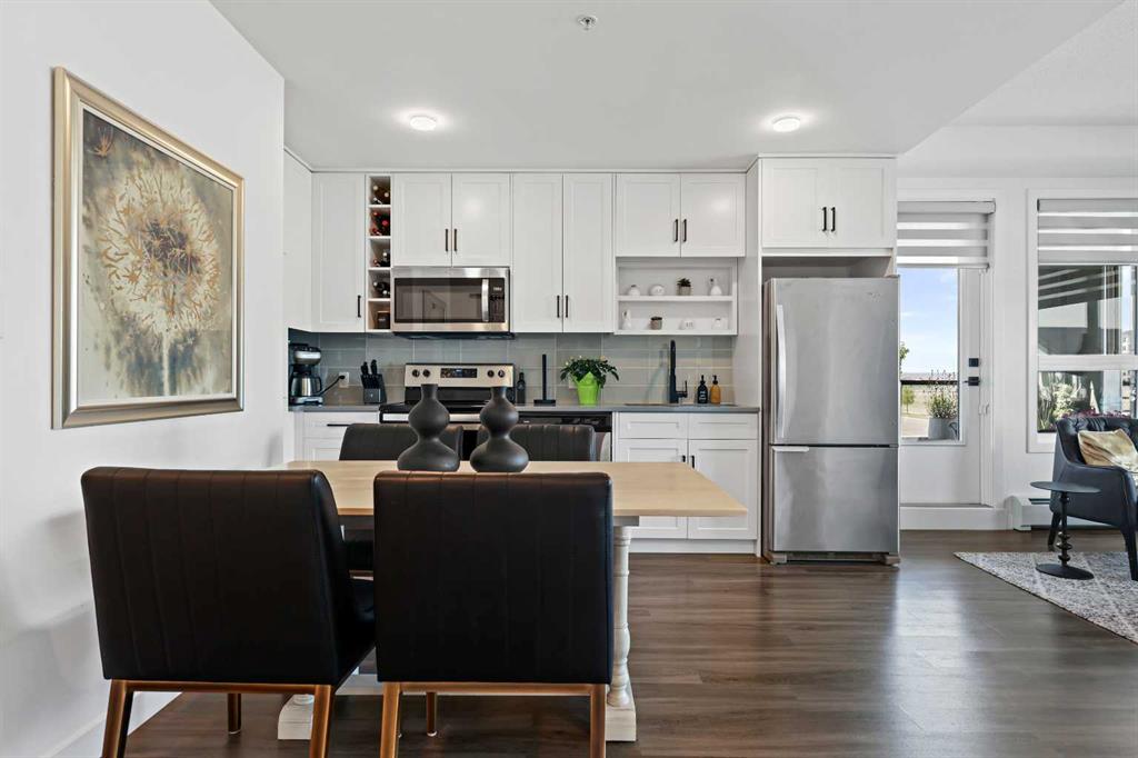 With 855 RMS square feet of well-designed living space, the open-concept layout feels both spacious and inviting. The upgraded shaker-style white maple kitchen features tall upper cabinets, generous counter space, a pantry with extra storage and freezer space, full-height tile backsplash, dual-basin stainless steel sink, and a pull-out faucet. The kitchen flows seamlessly into the dining and living areas, perfect for everyday living or entertaining. Modern white-painted casings, doors, and baseboards add a crisp finish throughout, while convenient in-suite laundry with a stacked washer and dryer offers additional storage.