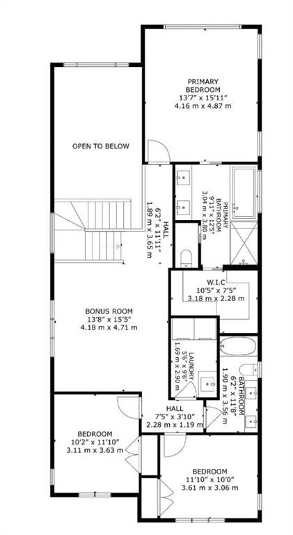 Upstairs, elegant wooden spindle railings overlook the stunning open-to-below living space, enhancing the home’s sense of openness. The spacious bonus room is bright and versatile, with a direct view of the high ceiling below—perfect as an entertainment or family space. The primary bedroom is filled with natural light, featuring one large window along with two additional upgraded picture windows, creating a bright and inviting retreat, complete with modern zebra blinds. The luxurious ensuite includes a double vanity, a relaxing soaker tub, and an upgraded glass shower, complemented by a generously sized walk-in closet. Two additional bedrooms are both bright and thoughtfully designed with extra windows, and they share a clean, well-appointed bathroom. The upper-level laundry room is impressively spacious and includes a sink for added convenience.