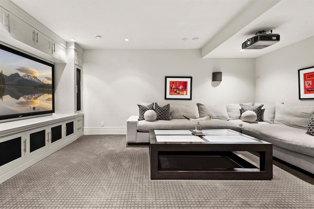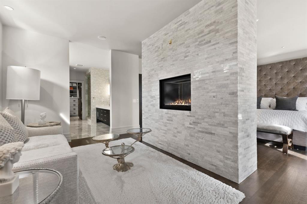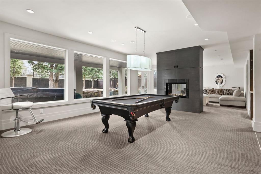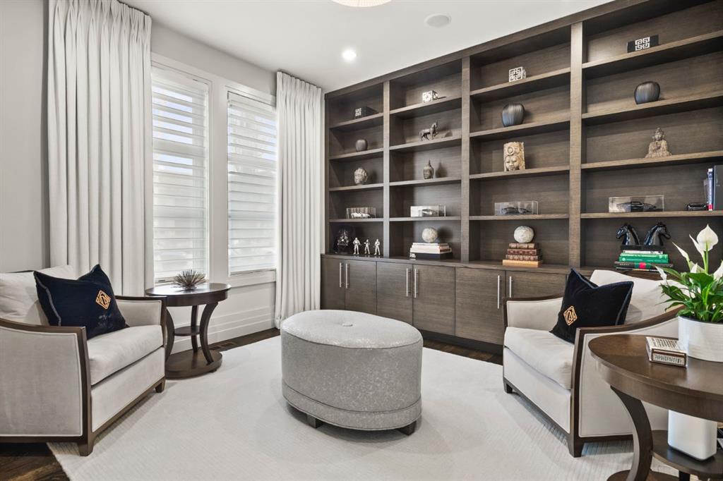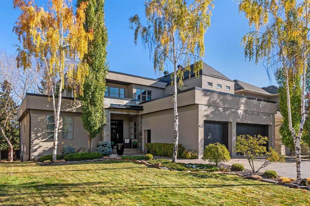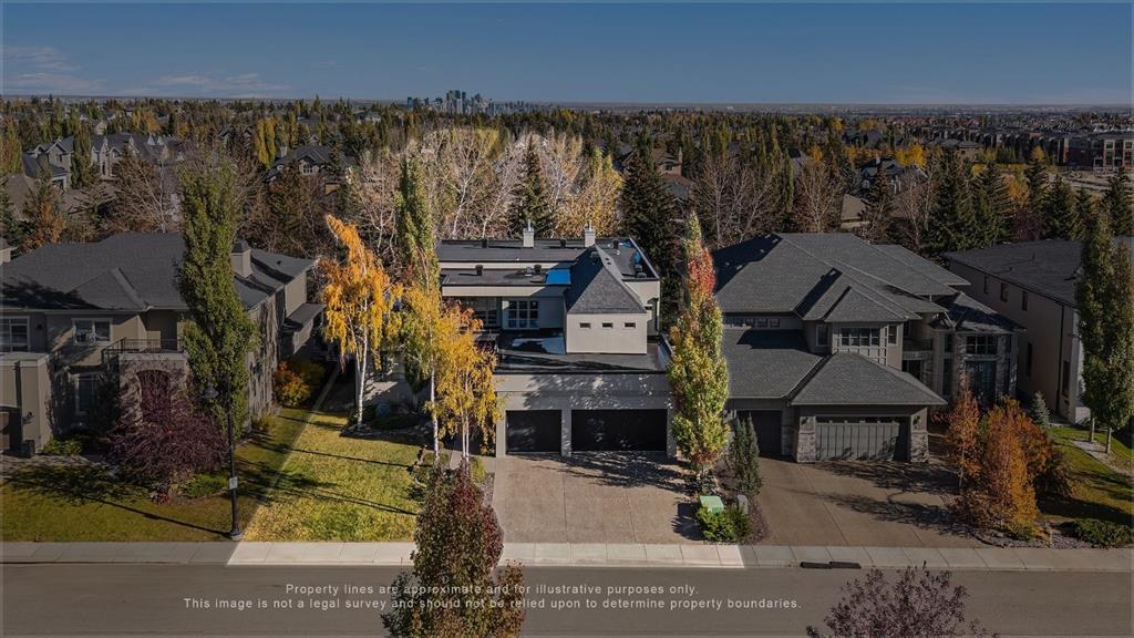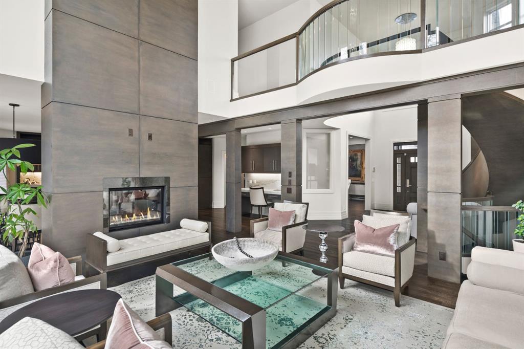 Set in the prestigious community of Aspen Estates, this custom-designed residence makes a striking architectural statement both inside and out, offering over 6,106 sq.ft. of meticulously developed living space and an expansive main level far larger than a traditional two-storey home. The moment you step inside, the soaring 19-ft foyer and living room—with dramatic double-height windows—creates an unforgettable sense of volume, light, and spatial drama, revealing the home’s strong architectural bones and meticulous detailing. Throughout the interior, rift-cut oak serves as a unifying design element, its refined linear grain expressed in both the extensive custom millwork and the sculptural floating staircase, lending a quiet, contemporary elegance that reinforces the home’s architectural coherence. Additional refined materials include recently refinished hardwood flooring, two-inch solid quartzite stone counters, three double-sided floor-to-ceiling fireplaces, heated floors throughout the bathrooms, lower level, and garage, solid core doors, and custom lighting and window coverings. The chef-inspired kitchen is both beautiful and functional, centered around a massive tiered quartz island and outfitted with Sub-Zero and Viking appliances and an expansive butler’s pantry, complemented by a formal dining room, a private office with built-ins, and a generously sized bedroom with full bathroom on this level. Above the open-to-below living area, an architectural catwalk floats through the space, leading to the bedroom wing where the serene primary suite offers extensive built-ins, a large walk-in closet, a marble floor-to-ceiling surround two-way fireplace, a peaceful sitting area, and a spa-inspired ensuite with heated floors, soaker tub, and steam shower, along with two additional bedrooms each with their own ensuite and walk-in closet. The lower level is designed for indulgent relaxation and entertaining, featuring a spacious recreation area, wet bar, theatre room, dedicated fitness room, a fifth bedroom, and a luxurious bathroom with steam shower, all kept perfectly comfortable year-round with in-floor heating and dual A/C units. Outside, the private, tree-lined backyard feels like a secluded retreat, offering upper and lower decks, expansive irrigated greenspace, and exceptional privacy. With Rundle College, the C-Train, Aspen Landing, and Westside Recreation Centre all within walking distance—and Webber Academy, Calgary Academy, and CFIS just minutes away—this home offers a rare blend of architectural beauty, lifestyle convenience, and effortless access to both downtown and the mountains. Make sure to watch YouTube video of home linked to listing!