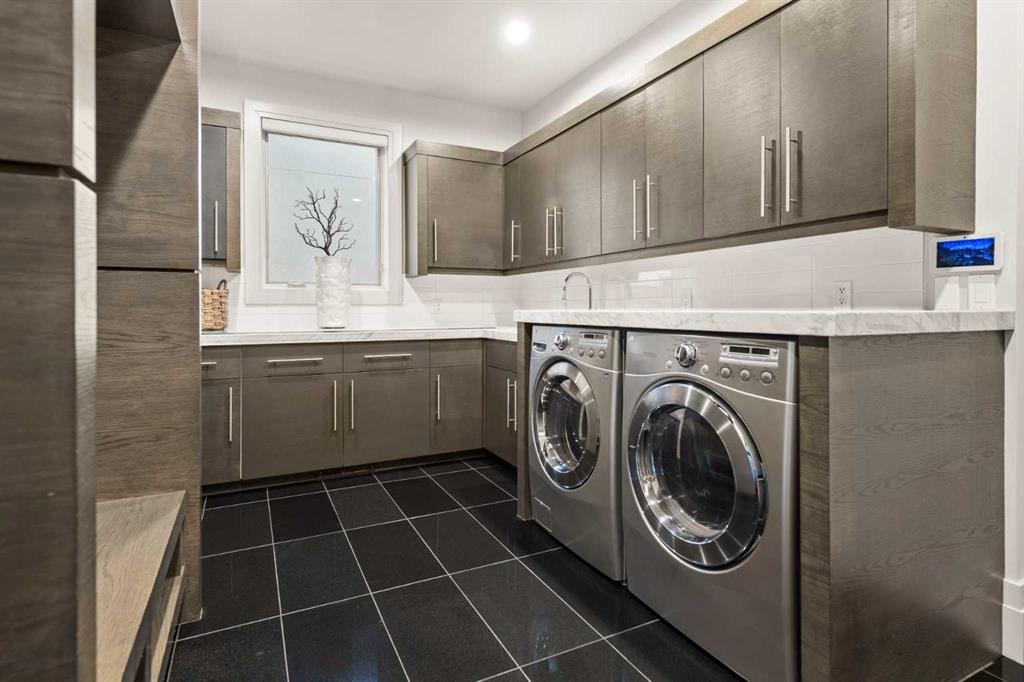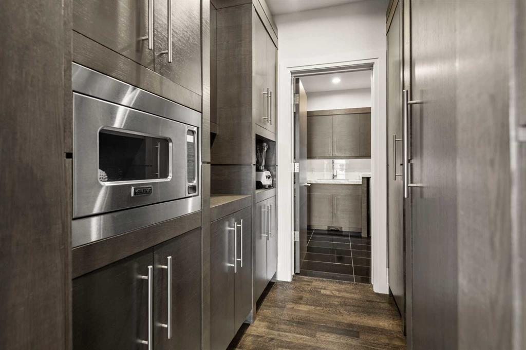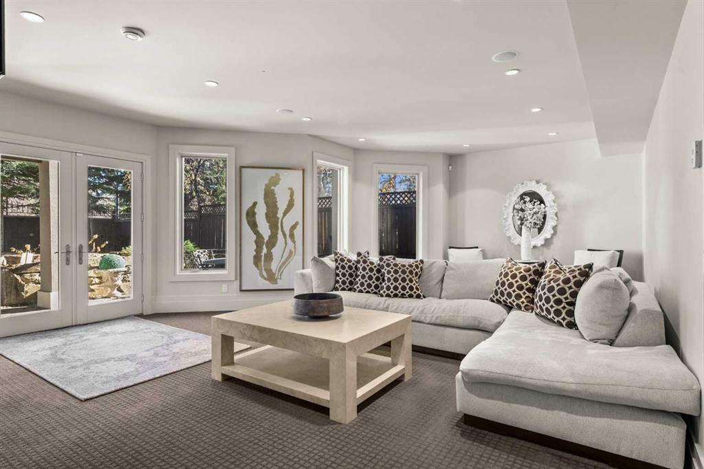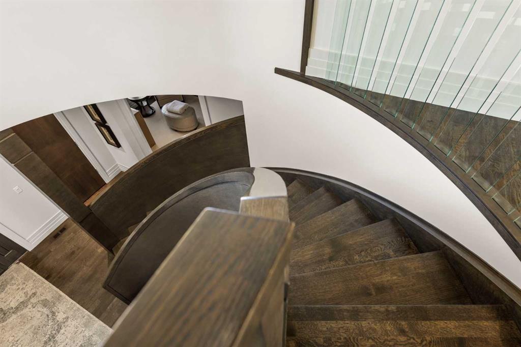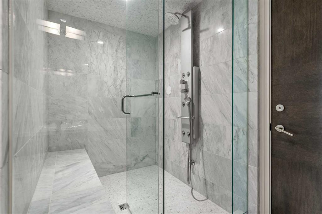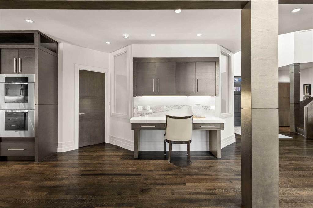 Set in the prestigious community of Aspen Estates, this custom-designed residence makes a striking architectural statement both inside and out, offering over 6,106 sq.ft. of meticulously developed living space and an expansive main level far larger than a traditional two-storey home. The moment you step inside, the soaring 19-ft foyer and living room—with dramatic double-height windows—creates an unforgettable sense of volume, light, and spatial drama, revealing the home’s strong architectural bones and meticulous detailing. Throughout the interior, rift-cut oak serves as a unifying design element, its refined linear grain expressed in both the extensive custom millwork and the sculptural floating staircase, lending a quiet, contemporary elegance that reinforces the home’s architectural coherence. Additional refined materials include recently refinished hardwood flooring, two-inch solid quartzite stone counters, three double-sided floor-to-ceiling fireplaces, heated floors throughout the bathrooms, lower level, and garage, solid core doors, and custom lighting and window coverings. The chef-inspired kitchen is both beautiful and functional, centered around a massive tiered quartz island and outfitted with Sub-Zero and Viking appliances and an expansive butler’s pantry, complemented by a formal dining room, a private office with built-ins, and a generously sized bedroom with full bathroom on this level. Above the open-to-below living area, an architectural catwalk floats through the space, leading to the bedroom wing where the serene primary suite offers extensive built-ins, a large walk-in closet, a marble floor-to-ceiling surround two-way fireplace, a peaceful sitting area, and a spa-inspired ensuite with heated floors, soaker tub, and steam shower, along with two additional bedrooms each with their own ensuite and walk-in closet. The lower level is designed for indulgent relaxation and entertaining, featuring a spacious recreation area, wet bar, theatre room, dedicated fitness room, a fifth bedroom, and a luxurious bathroom with steam shower, all kept perfectly comfortable year-round with in-floor heating and dual A/C units. Outside, the private, tree-lined backyard feels like a secluded retreat, offering upper and lower decks, expansive irrigated greenspace, and exceptional privacy. With Rundle College, the C-Train, Aspen Landing, and Westside Recreation Centre all within walking distance—and Webber Academy, Calgary Academy, and CFIS just minutes away—this home offers a rare blend of architectural beauty, lifestyle convenience, and effortless access to both downtown and the mountains. Make sure to watch YouTube video of home linked to listing!