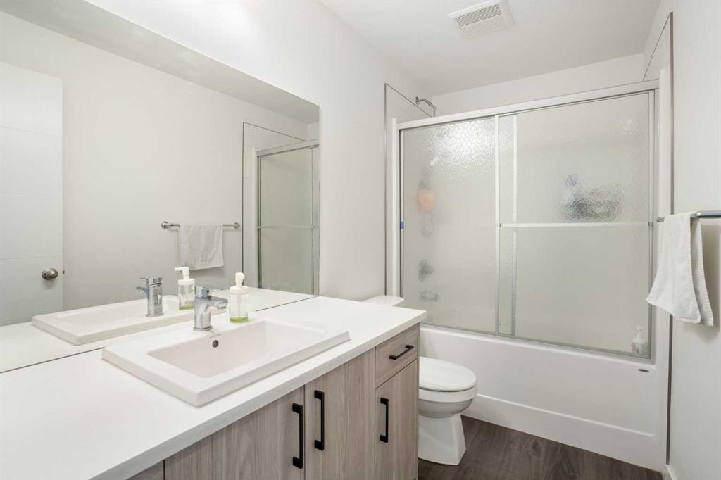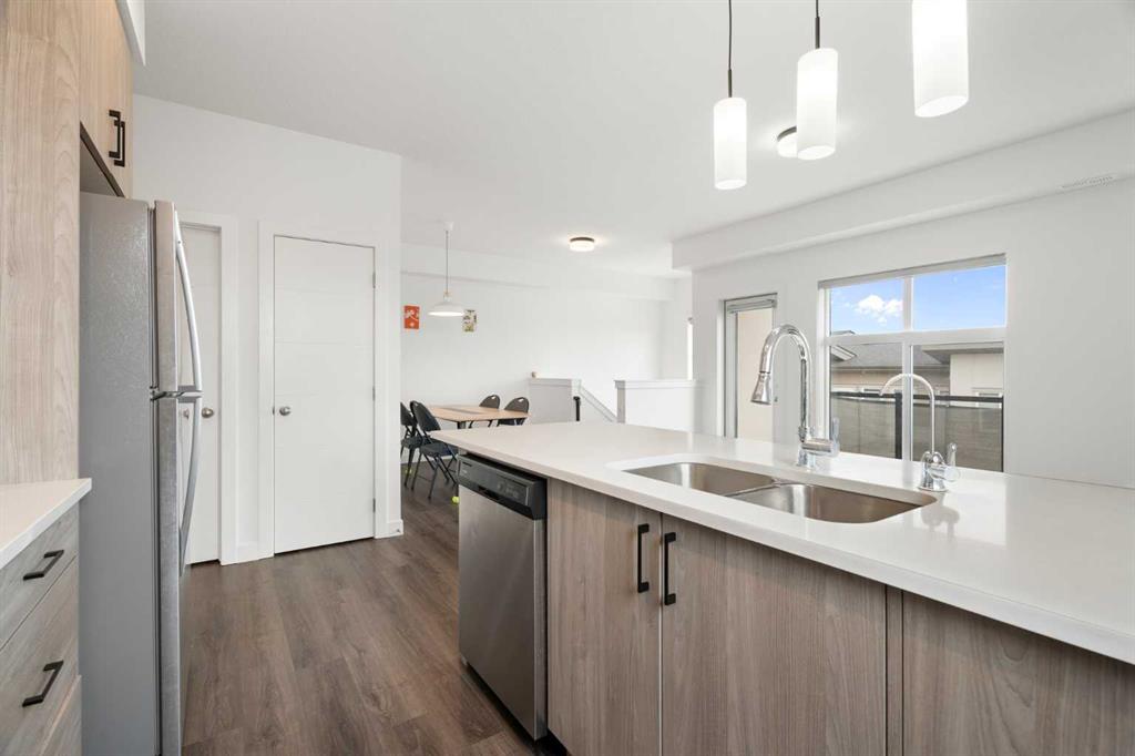 Welcome to this beautifully maintained top-floor corner unit in the highly sought-after community of Springbank Hill. This thoughtfully designed home offers a bright and functional layout, perfect for modern living. The unique top-floor design features a spacious, separate dining area rarely found in similar units, along with a versatile entry-level office/den—ideal for working from home. Upstairs, the open-concept living area is filled with natural light and flows seamlessly to a large balcony with a gas hookup, perfect for outdoor entertaining. The upper level includes two spacious bedrooms, including a private primary retreat with a walk-in closet and ensuite, along with a second bedroom, full bathroom, and convenient in-suite laundry. Additional highlights include a private attached garage and gas BBQ line. Enjoy nearby shopping and dining at Aspen Landing Shopping Centre, plus close proximity to top schools such as Webber Academy, Calgary Academy, and Rundle College. Commuting is easy with quick access to Stoney Trail and the nearby 69 Street CTrain Station. Move-in ready and ideally located, this home is perfect for families, professionals, or investors.