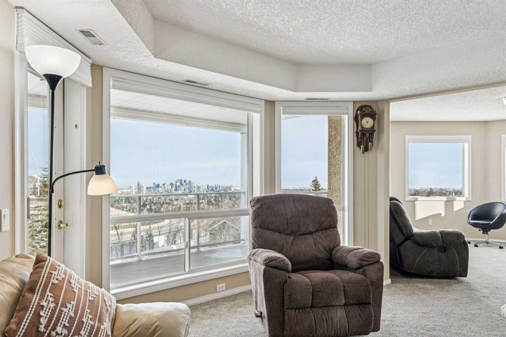 Experience stunning, unobstructed panoramic city views from this spacious 1,345 sq. ft. apartment-style condo in Dana Village! You can enjoy the views from most rooms in the condo. Warm and inviting and designed with open-concept living in mind, the kitchen features stone countertops, excellent prep space, and plenty of storage, and flows seamlessly into the generous dining area — large enough for a full dining suite. The bright living room offers plenty of space to relax and provides access to the first balcony, where you can set up your BBQ and outdoor dining set. There’s a den with a picture window that works beautifully as a home office, plus a second den with charming bay windows and access to the second balcony — a perfect flex space for reading, hobbies, or quiet retreat. The primary bedroom includes a walk-through closet and 4-piece ensuite. The second bedroom is located on the opposite side of the living space for added privacy, with a 3-piece bathroom nearby. A large in-suite storage room houses the convenient stackable washer and dryer. There is assigned parking and additional storage in the parkade are also included. Dana Village is a 55+ community that offers a warm, social lifestyle with plenty of amenities to enjoy. Residents can take part in organized activities and make use of the large dining hall with a community kitchen. There’s also a garden room available to reserve for private functions. Additional onsite amenities include an exercise room, library, woodworking shop, puzzle and games area, multiple lounge spaces, two courtyards, and a car wash bay. Enjoy space, comfort, and incredible views — all in a welcoming and well-appointed adult community at Dana Village. Book your showing today!!