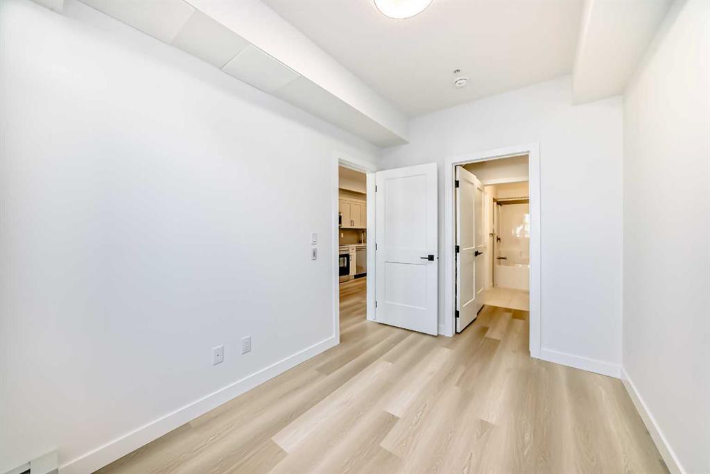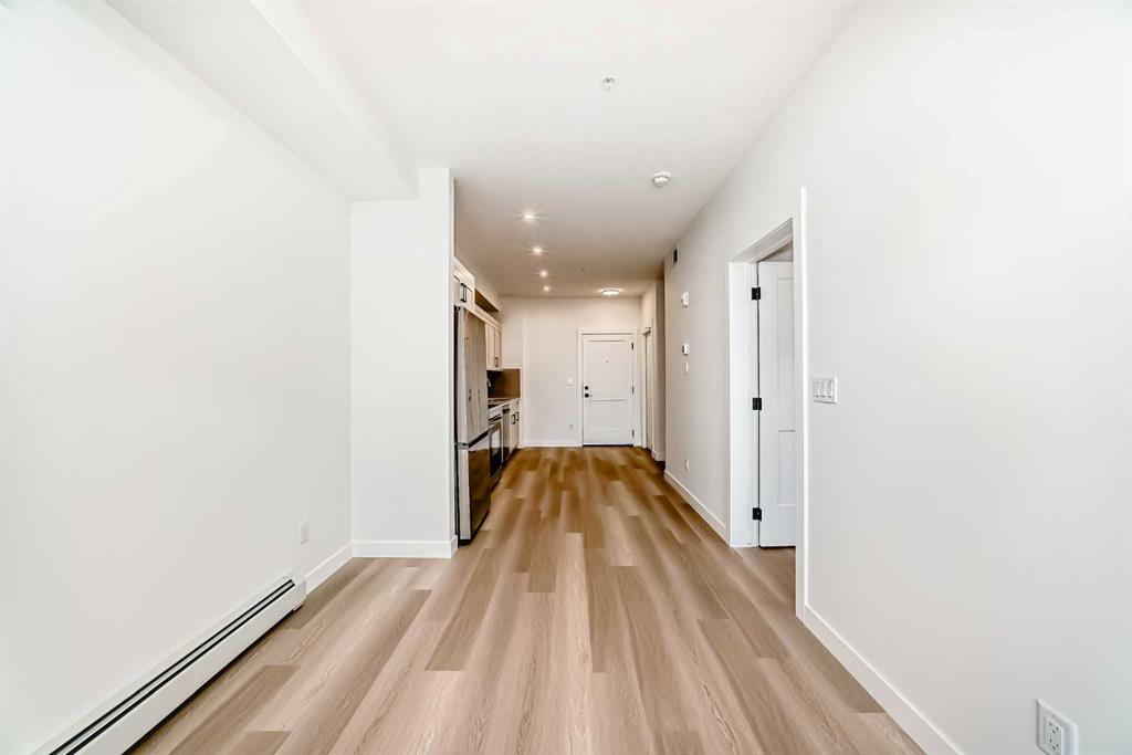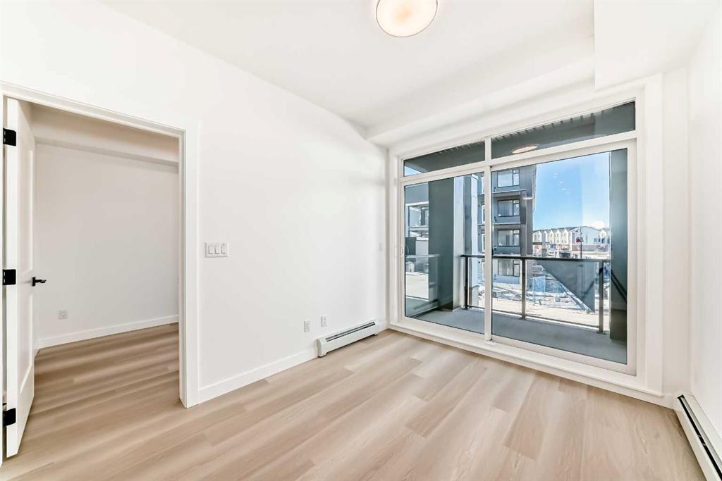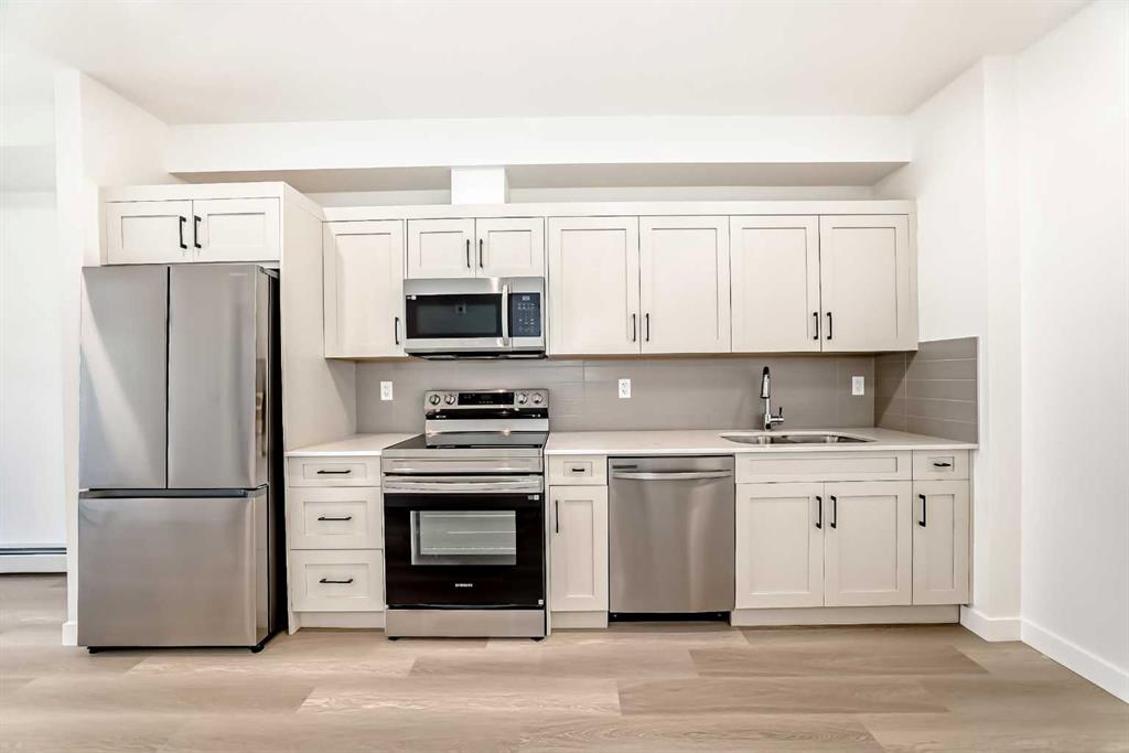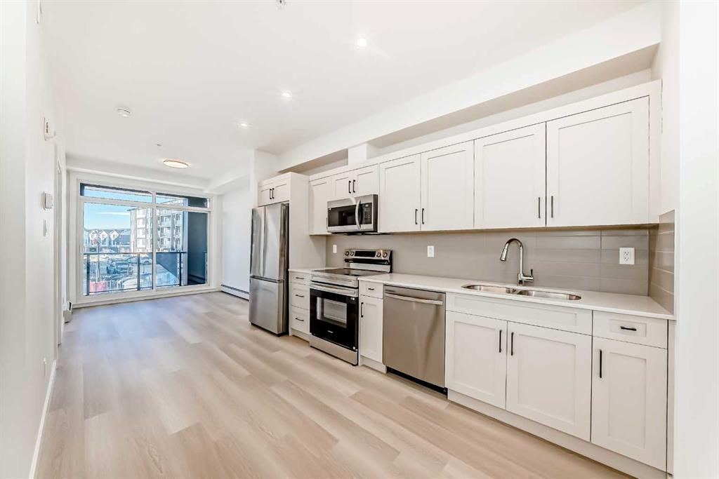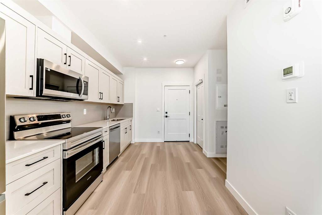 Welcome to The Lawrence2, a meticulously designed one-bedroom, one-bathroom residence offering 432 sq. ft. of well-planned living space. This thoughtfully crafted home features 9-foot ceilings and an 8-foot-wide patio door, allowing for an abundance of natural light and seamless access to the balcony with a gas hookup—ideal for outdoor entertaining. The kitchen has quartz countertops, tile backsplash, soft-close cabinetry, and premium stainless steel appliances. Convenience is further enhanced with in-suite laundry. Strategically located near walking trails, shopping centers, South Campus Hospital, and Deerfoot Trail, this home offers unparalleled connectivity and accessibility. The Lawrence 2 is available for immediate possession. For peace of mind, this home is backed by Alberta New Home Warranty, ensuring long-term quality and security.