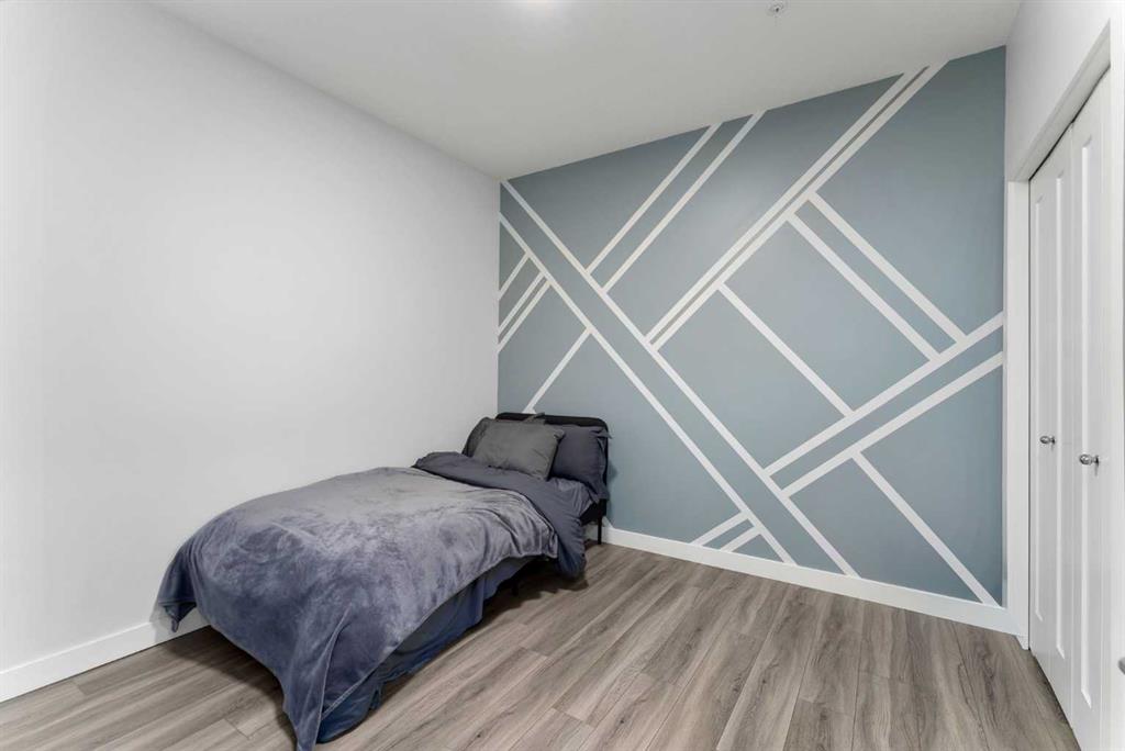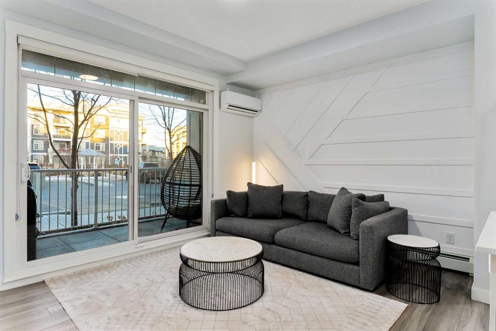 The living room features a beautiful custom accent wall and is filled with warmth and natural light thanks to the massive west-facing patio doors that open onto your own ground-level balcony—ideal for enjoying Calgary’s sunny afternoons.