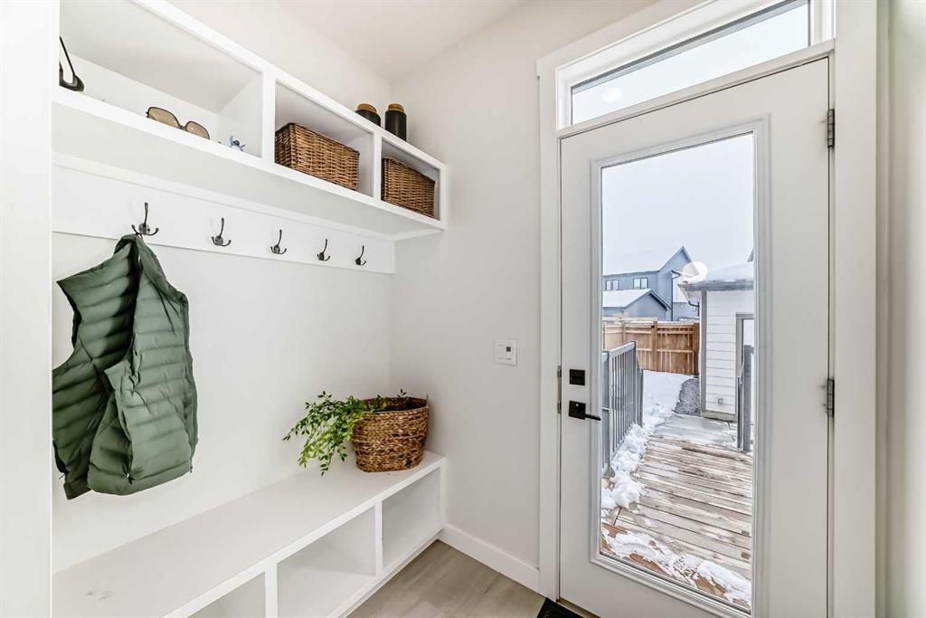 Step outside to your fully landscaped backyard oasis featuring a full-width deck, ornamental grasses, Rundle rock accents, and an automatic hose system—designed for both beauty and ease of maintenance.