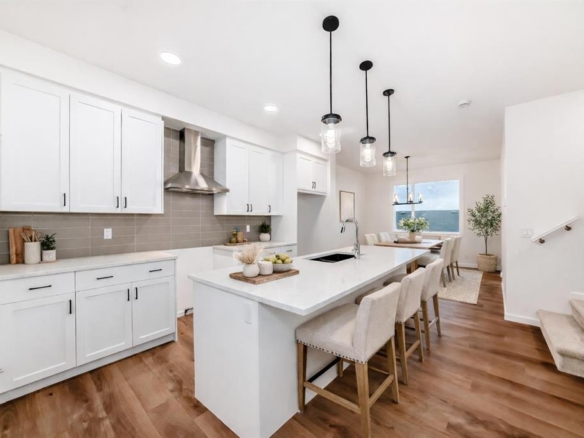 Inside, the home features a bright open-concept living and dining area filled with natural light, complemented by a contemporary kitchen complete with quartz countertops, stainless steel appliances, tiled backsplash, and a central island. The functional single-level layout offers two well-proportioned bedrooms, including a primary suite with a walk-in closet and private ensuite, along with a second full bathroom and convenient in-suite laundry. A spacious private balcony with gas hookup provides the perfect setting for summer BBQs, while the attached single garage adds everyday convenience.