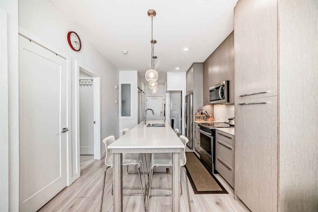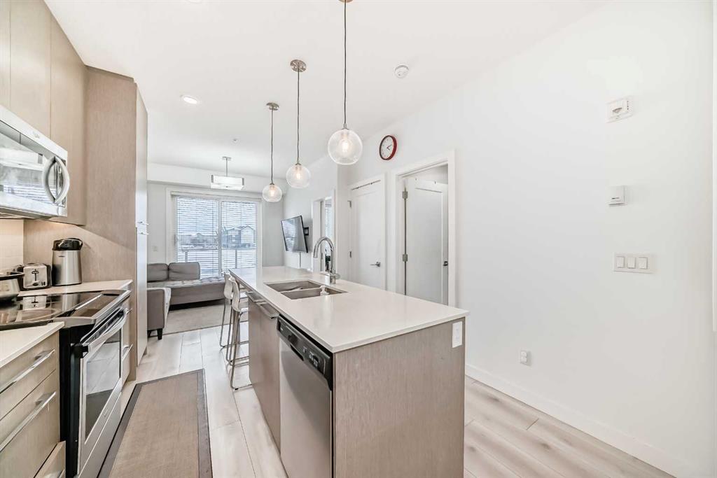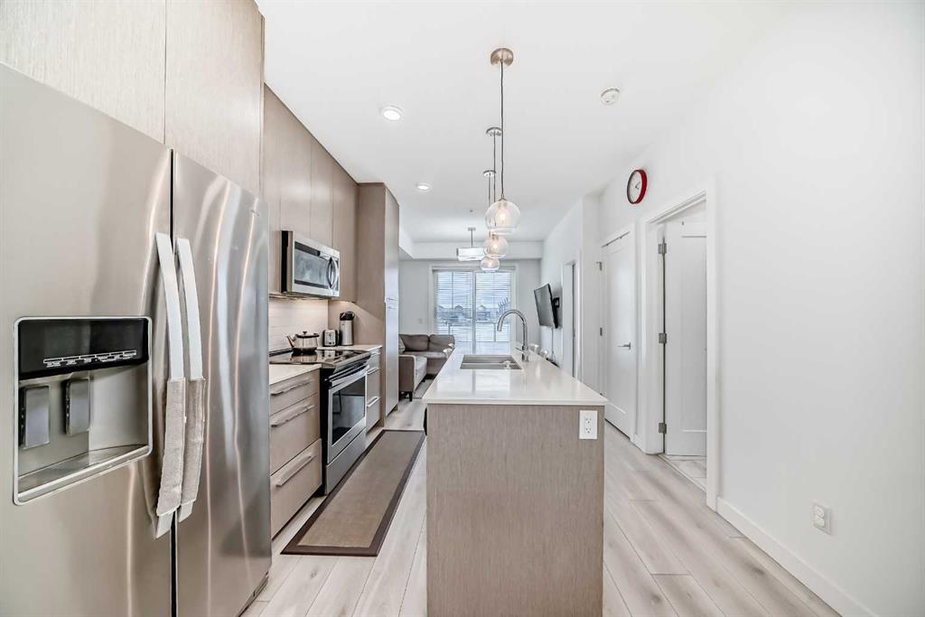 Welcome to this stunning 2-bedroom, 1-bathroom condo in the heart of Cornerstone. Underground Parking & Exceptional Amenities. This bright, modern unit offers a perfect blend of comfort, style, and lifestyle-enhancing amenities. Ppen-concept layout with large windows that flood the space with natural light. Featuring large windows and a seamless flow from the living area to the kitchen. The modern kitchen is a chef’s dream, complete with QUARTZ COUNTERTOPS, STAINLESS STEEL APPLIANCES, full-height cabinets, and a spacious island with seating. Both bedrooms are well-sized with generous closet space, while the 4-PIECE BATHROOM showcases sleek, contemporary finishes. Additional conveniences include an iIN-SUITE STACKED WASHER AND DRYER. The unit also includes a TITLED STORAGE AND A TITLED UNDERGROUND PARKING, ensuring your vehicle stays safe and warm year-round. Step out onto your PRIVATE BALCONY, or take advantage of the building’s PREMIUM AMENITIES, including: Owner’s Lounge – a comfortable space for socializing or hosting Movie Theatre & Library – for entertainment and relaxation Fitness Centre – fully equipped for your health and wellness needs Community Garden – enjoy greenery and grow your own herbs or flowers. The building offers secure entry, and elevator access, making it ideal for first-time buyers, downsizers, or investors. Don’t miss your chance to call this exceptional condo home. Book your private showing today!
