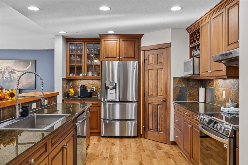 Experience the very best of mountain living at this stunning 3-bedroom, 3-bathroom, single level condo in Trailside Lodges. Spanning over 2000SF, this property offers breathtaking, Southeast-facing mountain views, an abundance of natural light, and a seamless blend of comfort and style. You feel the warmth and spaciousness here from the moment you step inside this beautiful open-concept living area, with floor-to-ceiling stone fireplace and beautiful hardwood flooring. The gourmet kitchen features high-end finishes, generous counter space, and lots of cupboards, ideal for culinary enthusiasts. The primary suite is a fabulous private retreat with space for a lounge area, direct deck access, and a large ensuite with a corner jetted tub, double vanity, spacious shower, water closet and walk-in closet. A second master suite also boasts direct deck access, a walk-in closet, and another elegant ensuite with double vanities. The third bedroom, tucked away for privacy, enjoys its own unique mountain views with a third full bathroom nearby. An oversized laundry room with additional flex space add to the home’s thoughtful design and offer tons of storage room. Enjoy outdoor living year-round on the impressive 35′ x 9′ partially covered deck with a roll-down sunshade, providing a comfortable space to take in the incredible mountain vistas. A number of recent upgrades have been completed, including new appliances, new kitchen sink/faucet, new toilets, & a murphy bed. Ownership at Trailside Lodges includes access to one of the best-outfitted clubhouses in Canmore, with hands down, the best outdoor hot tub with unbelievable panoramic views, an indoor resistance pool, a well-equipped fitness center, billiards & games loft, and a theatre room. Additional conveniences include a heated underground parking stall, storage for all your seasonal gear, and ample guest parking. This home is move-in ready and offers the perfect lock-and-leave lifestyle without compromising space or luxury.