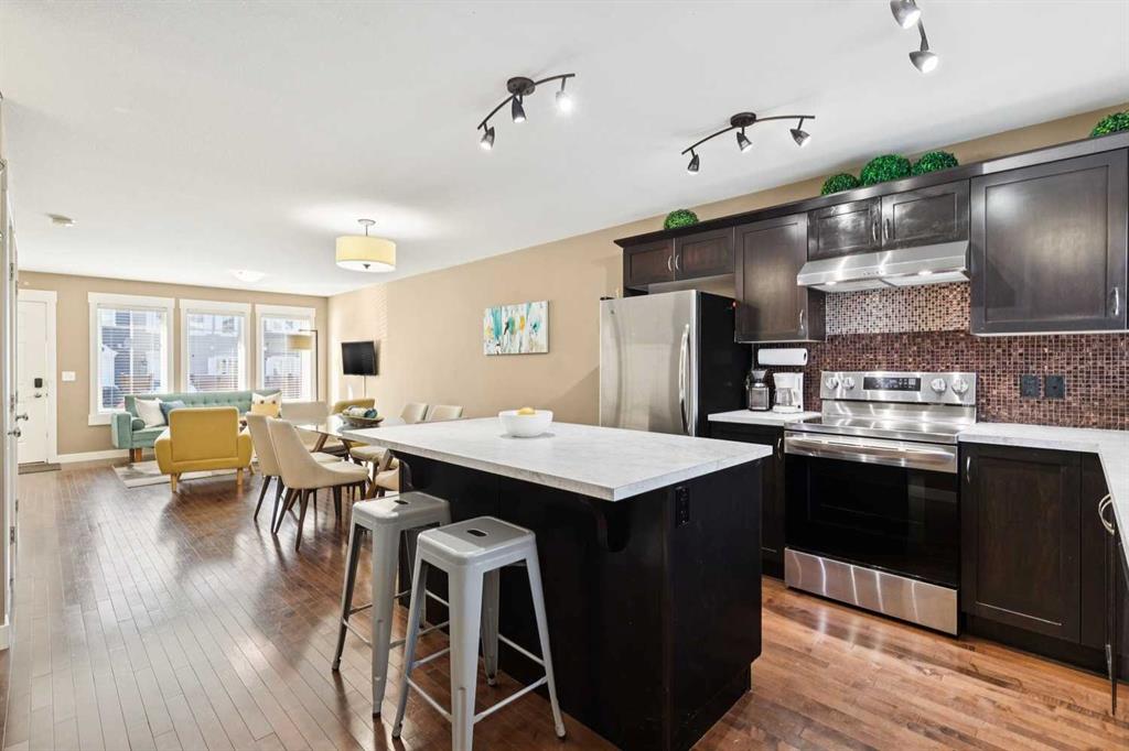 END-UNIT | 3 BEDROOMS | FINISHED BASEMENT | 2 PARKING SPOTS | Welcome to this BRIGHT 3 bedroom end-unit townhome in the established community of RAINBOW FALLS. The main floor offers an OPEN CONCEPT layout designed for everyday living. Large windows bring in NATURAL LIGHT, and the spacious living and dining areas flow seamlessly into the kitchen — creating a layout that works beautifully for both quiet evenings and entertaining. The kitchen features STAINLESS STEEL APPLIANCES, a CENTRAL ISLAND with seating, PANTRY storage, and plenty of cabinetry to keep everything organized. Upstairs, the PRIMARY BEDROOM is a generous size and offers a WALK-IN CLOSET. Two additional bedrooms and a FULL 4-PIECE BATH provide flexibility for family, guests, or a home office. The FINISHED BASEMENT adds valuable living space with a LARGE REC ROOM — ideal for movie nights, a playroom, home gym…whatever you need. Laundry and storage are neatly tucked away with rough-in there if you want to add a future bathroom. UPDATES: Kitchen Countertop (2026), Carpet Basement Stairs (2026), Washer, Stove and Dishwasher (2023), Dryer and Hot Water Tank (2022). Step outside where you can enjoy morning coffee or summer BBQs. Two ASSIGNED PARKING STALLS are located directly out front, with ample VISITOR PARKING nearby. Set within walking distance to schools, playgrounds, pathways, shopping, and the OFF-LEASH DOG PARK — and just minutes to CHESTERMERE LAKE — this home offers the lifestyle buyers are looking for. Whether you’re a FIRST-TIME BUYER, young family, or investor, this MOVE-IN READY townhome checks the boxes.